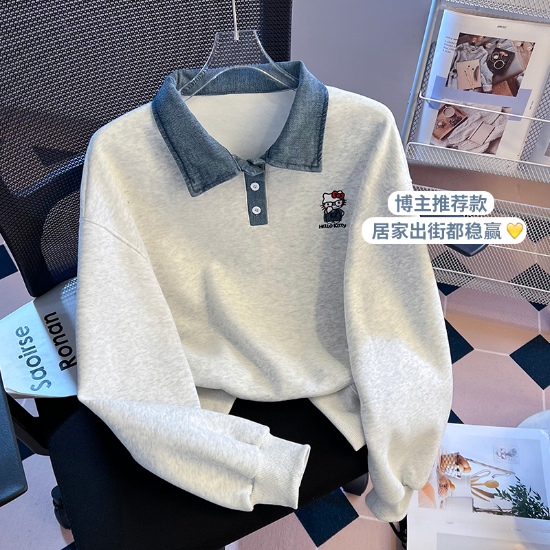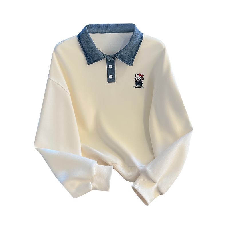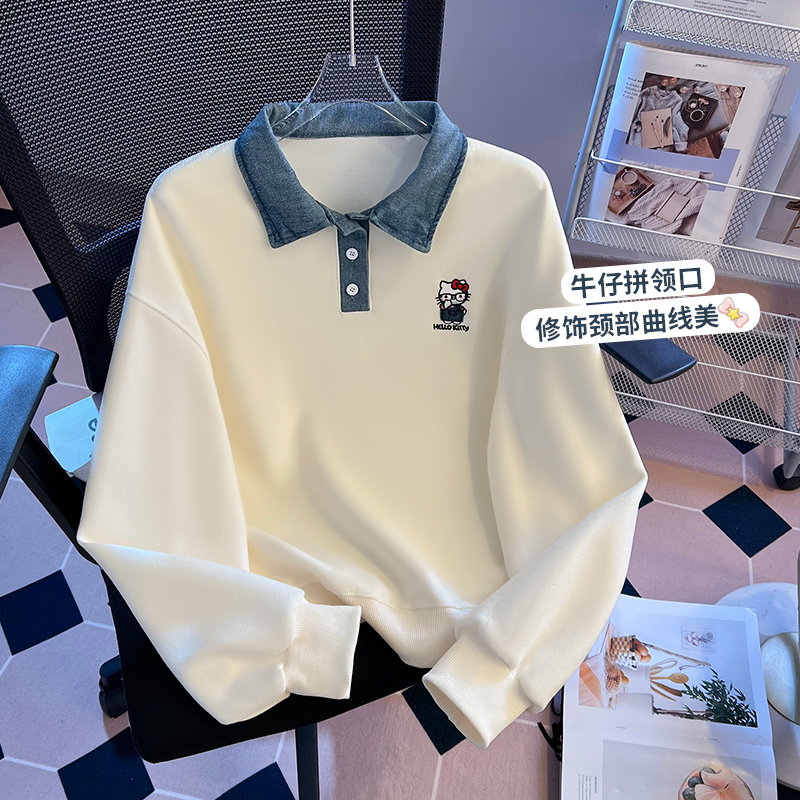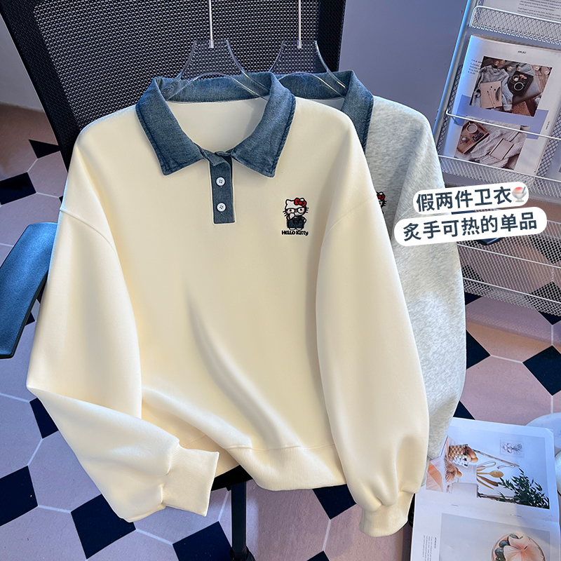 FA49569# 韩系宽松短款卫衣女撞色polo领卡通刺绣假两件长袖上衣