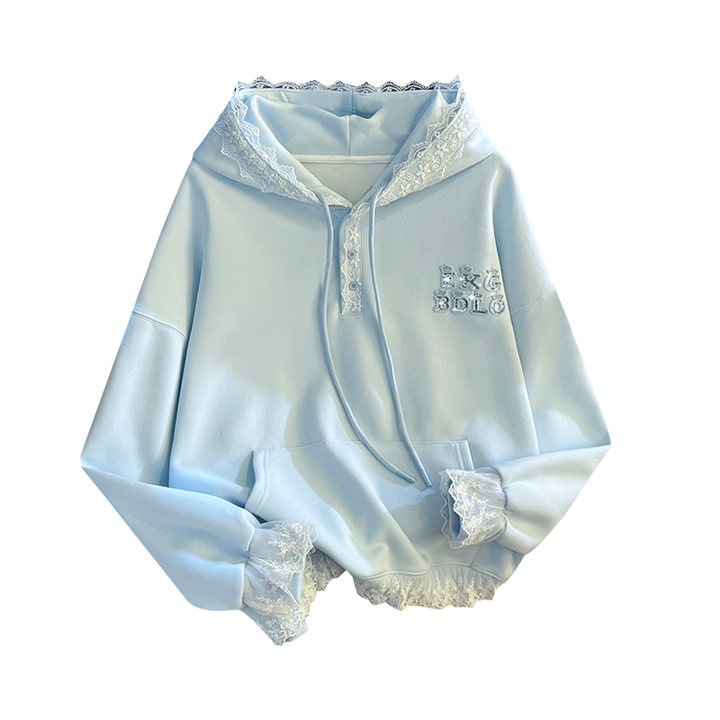 FA49570# 灰色蕾丝边拼接连帽卫衣女秋冬新款设计感慵懒风宽松上衣
