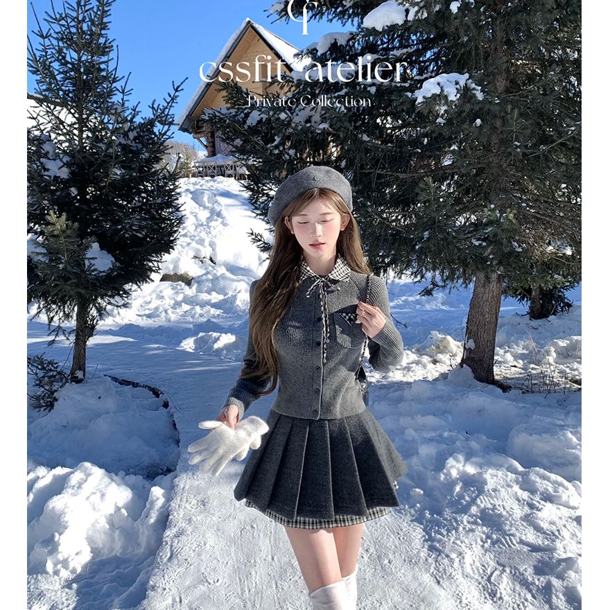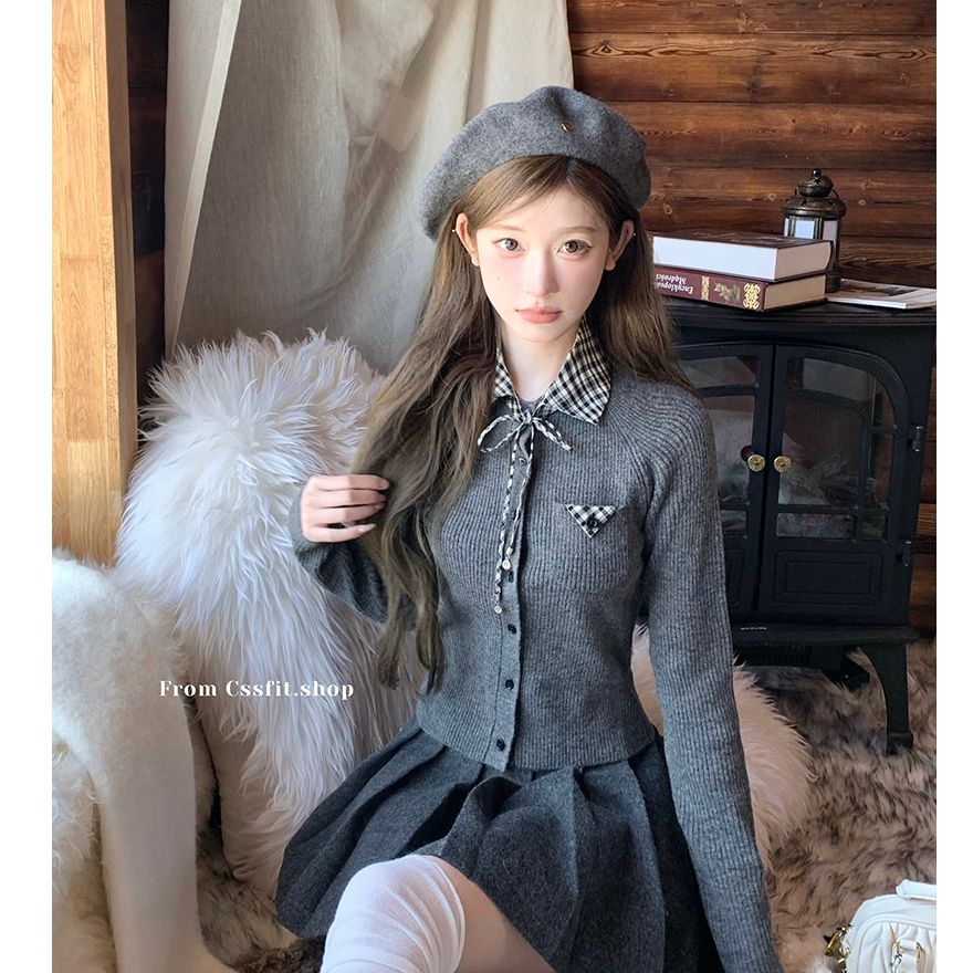 FA49585# 秋冬新款mar格纹翻领针织开衫百搭上衣拼接格纹百褶裙短裙女冬