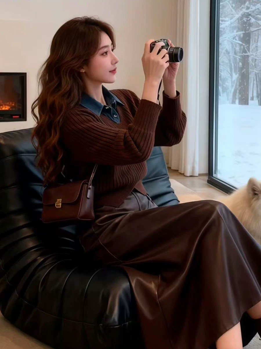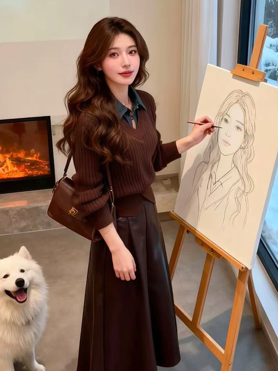 FA49609# 秋季气质一整套穿搭欧货复古牛仔领拼接假两件毛衣高腰半身裙套装