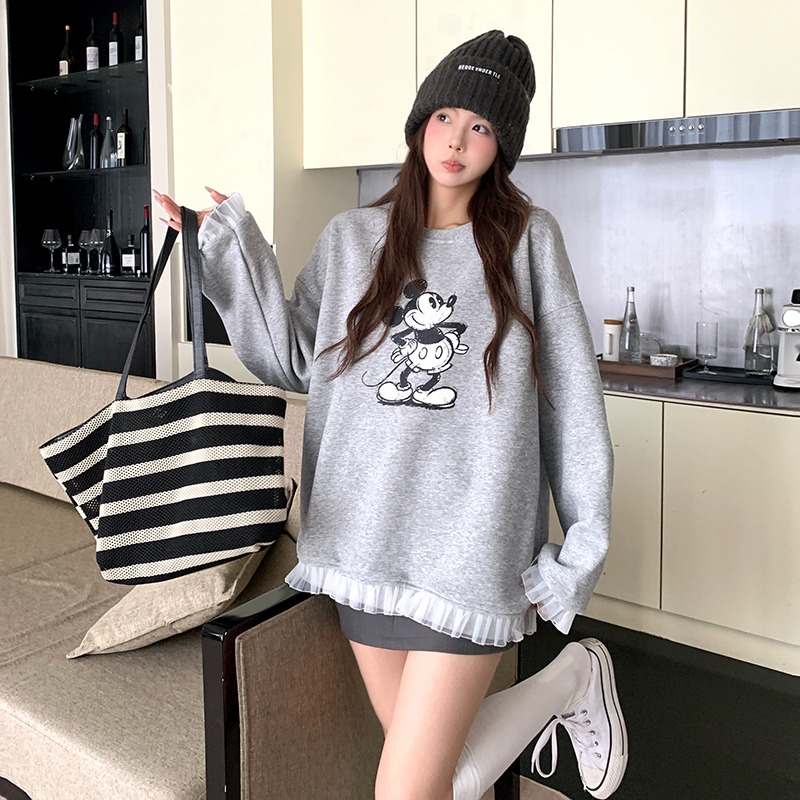 FA49654# 纯棉华棉复合真超加绒卫衣女秋冬潮新款蕾丝宽松保暖上衣