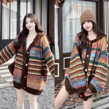FA49660# 大码女装复古撞色条纹连帽毛衣外套秋季微胖mm宽松显瘦针织衫上衣