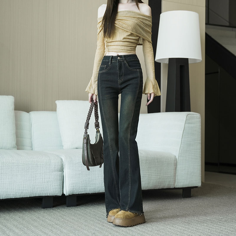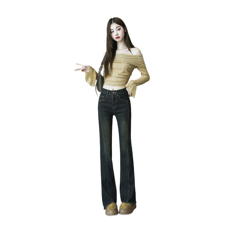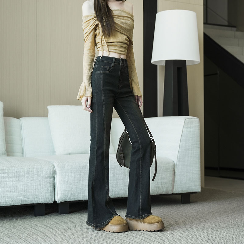 FA49759# -春秋高腰浅色微喇叭牛仔裤女毛边薄款修身设计感显瘦马蹄裤 服裝批發女裝批發服飾貨源