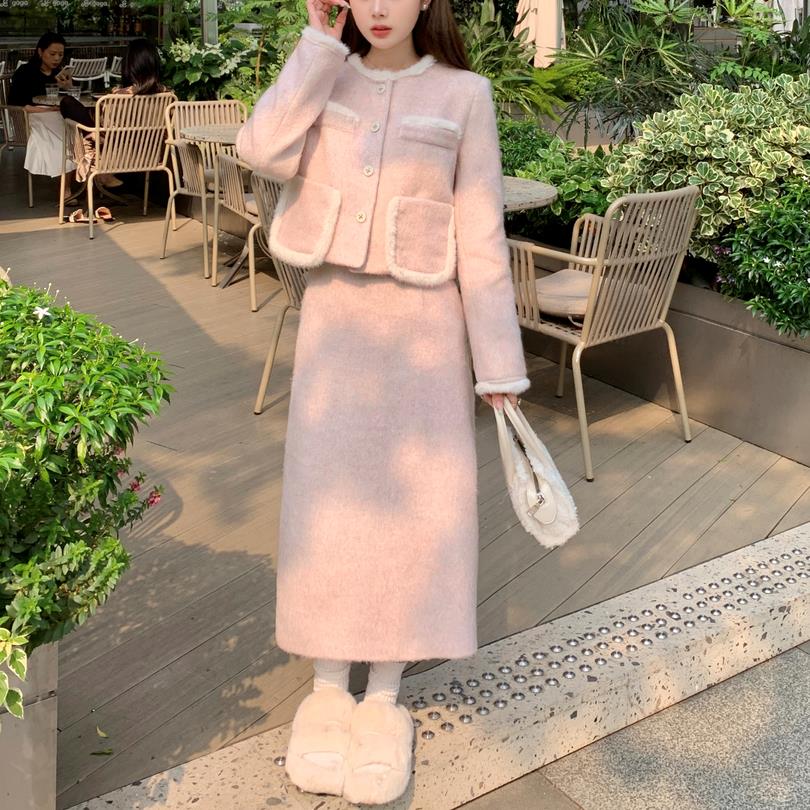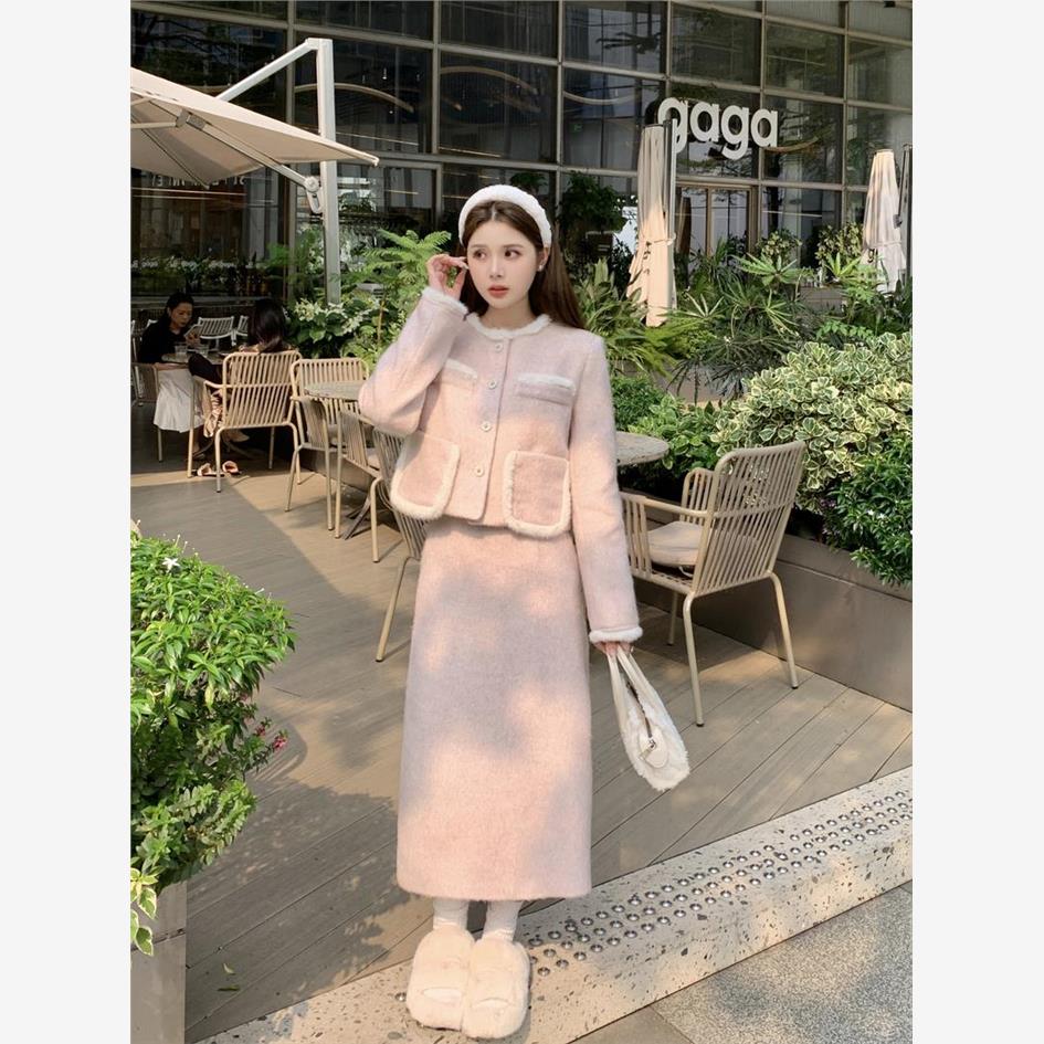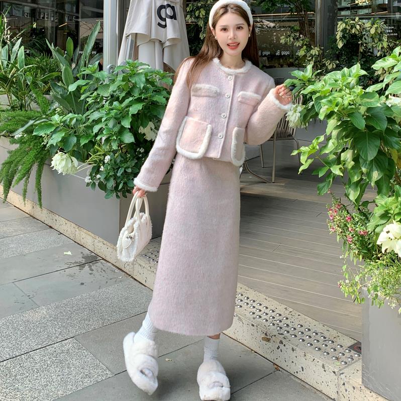 FA49762# 秋冬装搭配一整套粉色小香风套装女高级感毛绒短外套半身裙两件套 服裝批發女裝批發服飾貨源