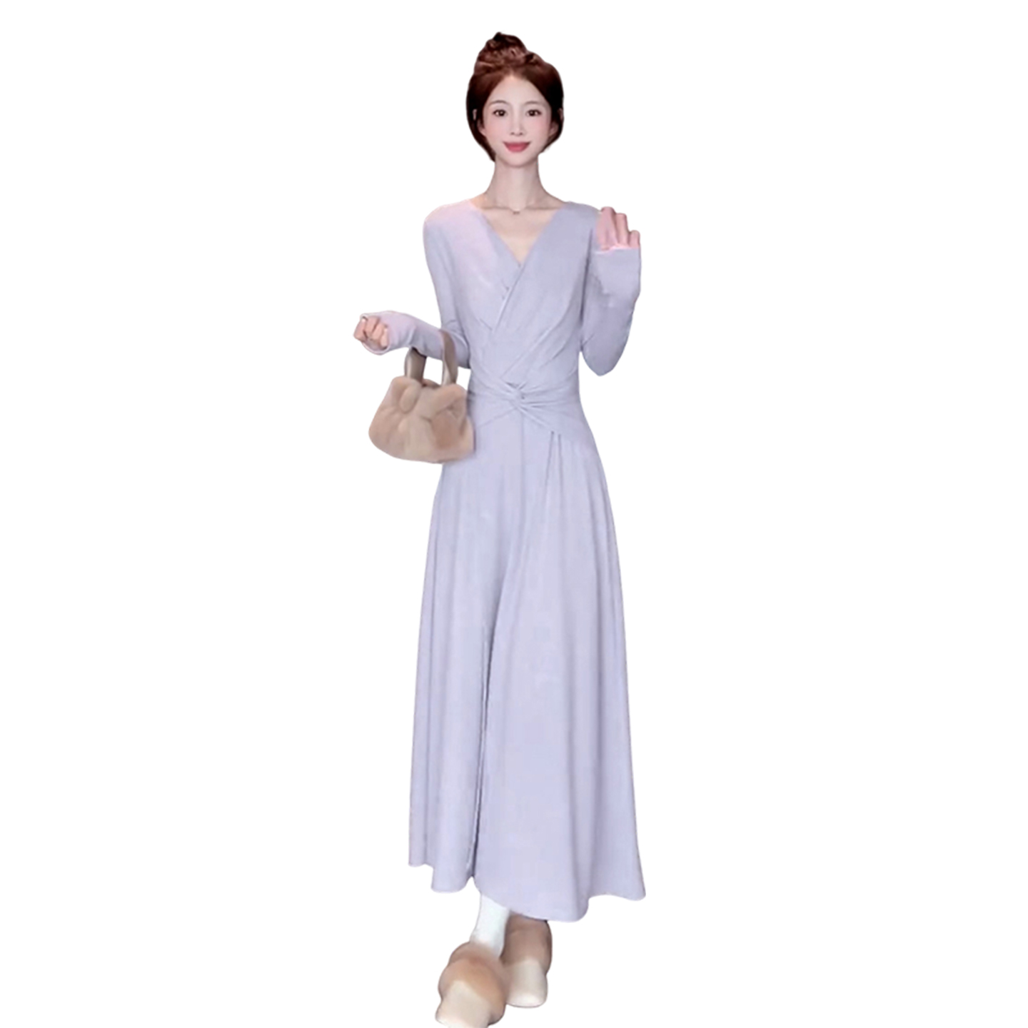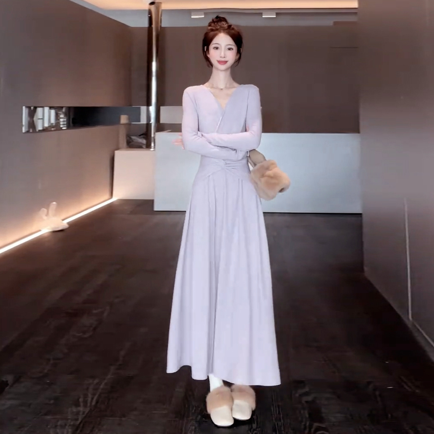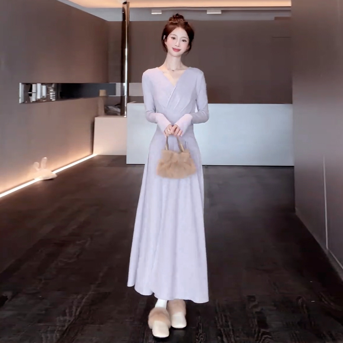 FA49846# 秋冬新款高级感内搭打底收腰长裙法式气质v领针织连衣裙子女 服裝批發女裝批發服飾貨源