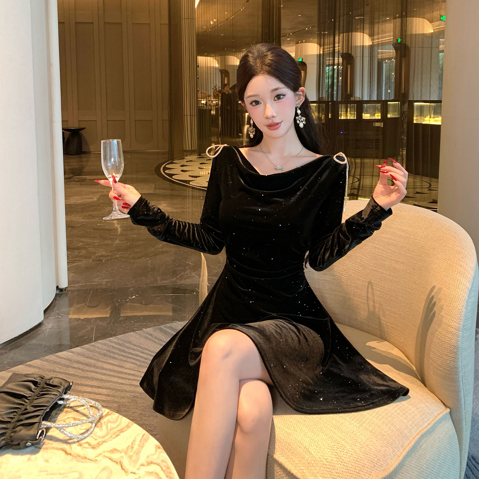 气质荡领韩系闪钻蝴蝶结连衣裙