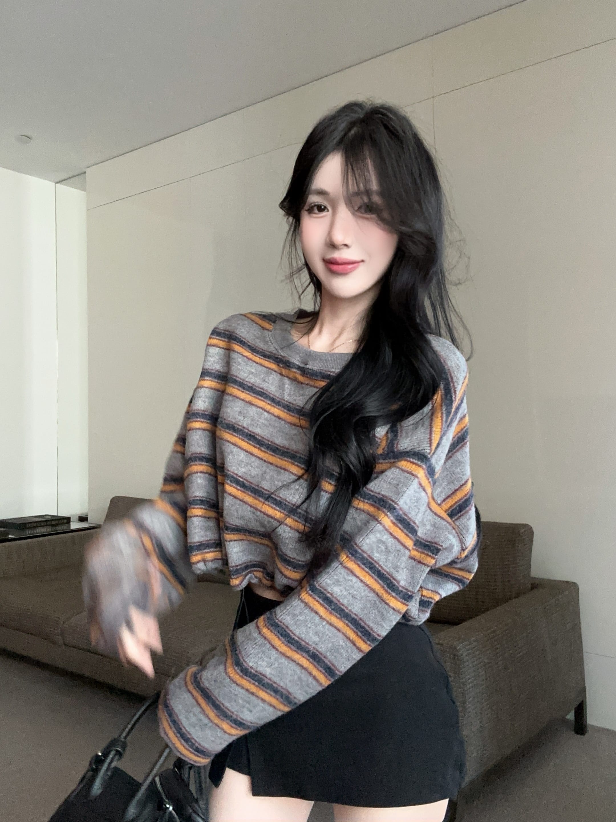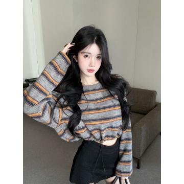 FA50134# 复古撞色条纹抽绳圆领长袖卫衣女慵懒风宽松显瘦T恤潮 服裝批發女裝批發服飾貨源