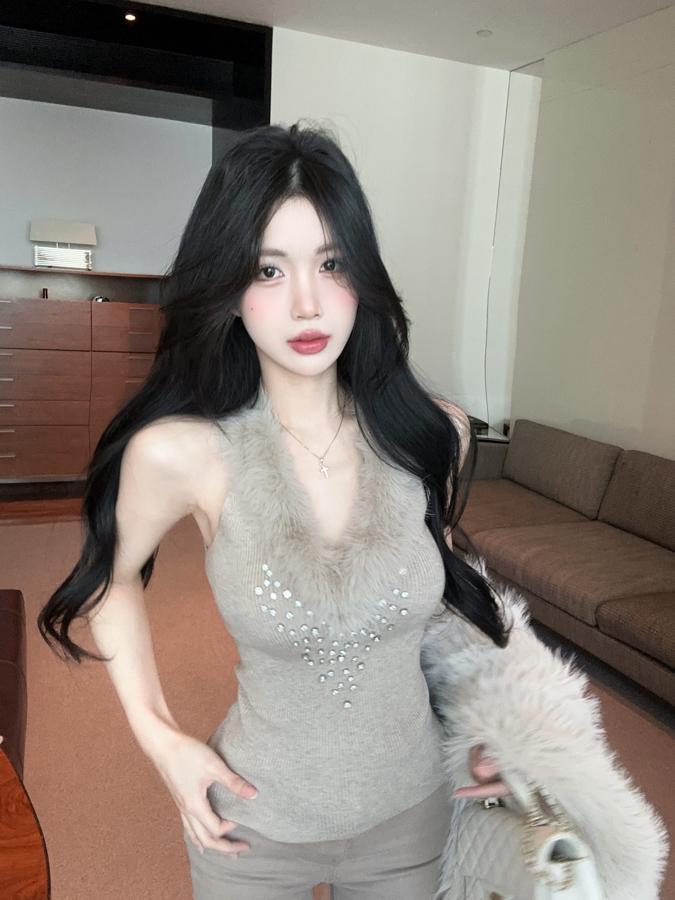 FA50135# 毛领手工钻挂脖露背针织衫吊带背心女修身打底衫 服裝批發女裝批發服飾貨源
