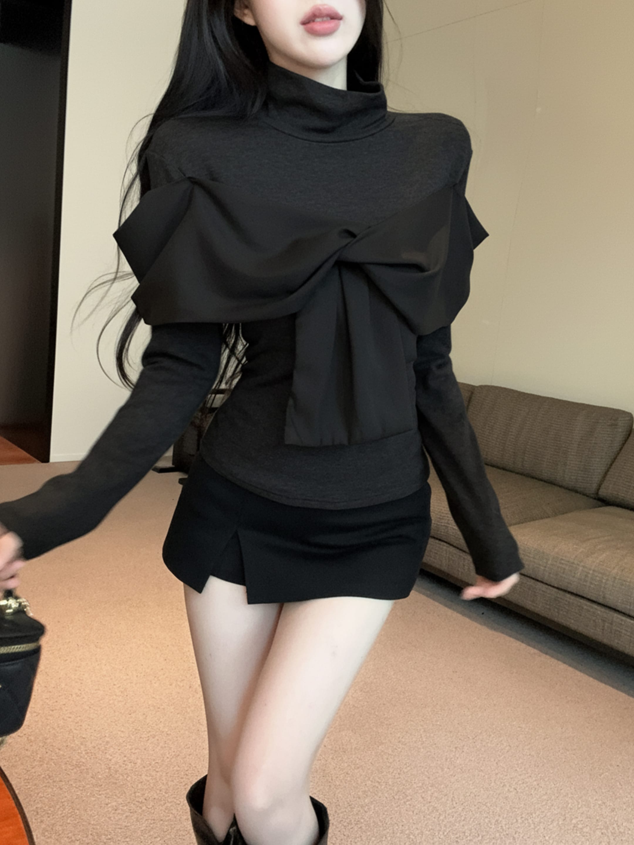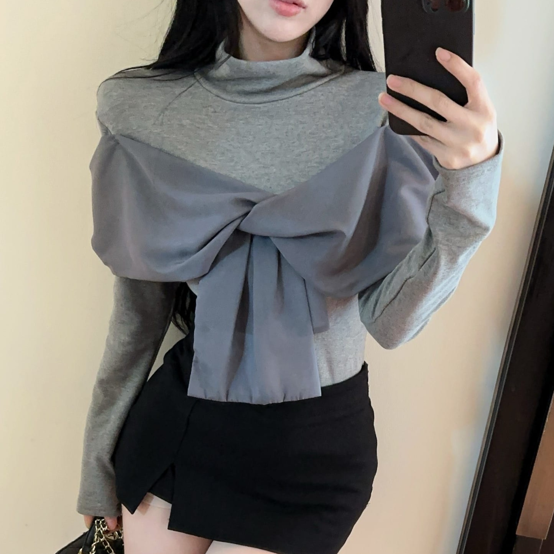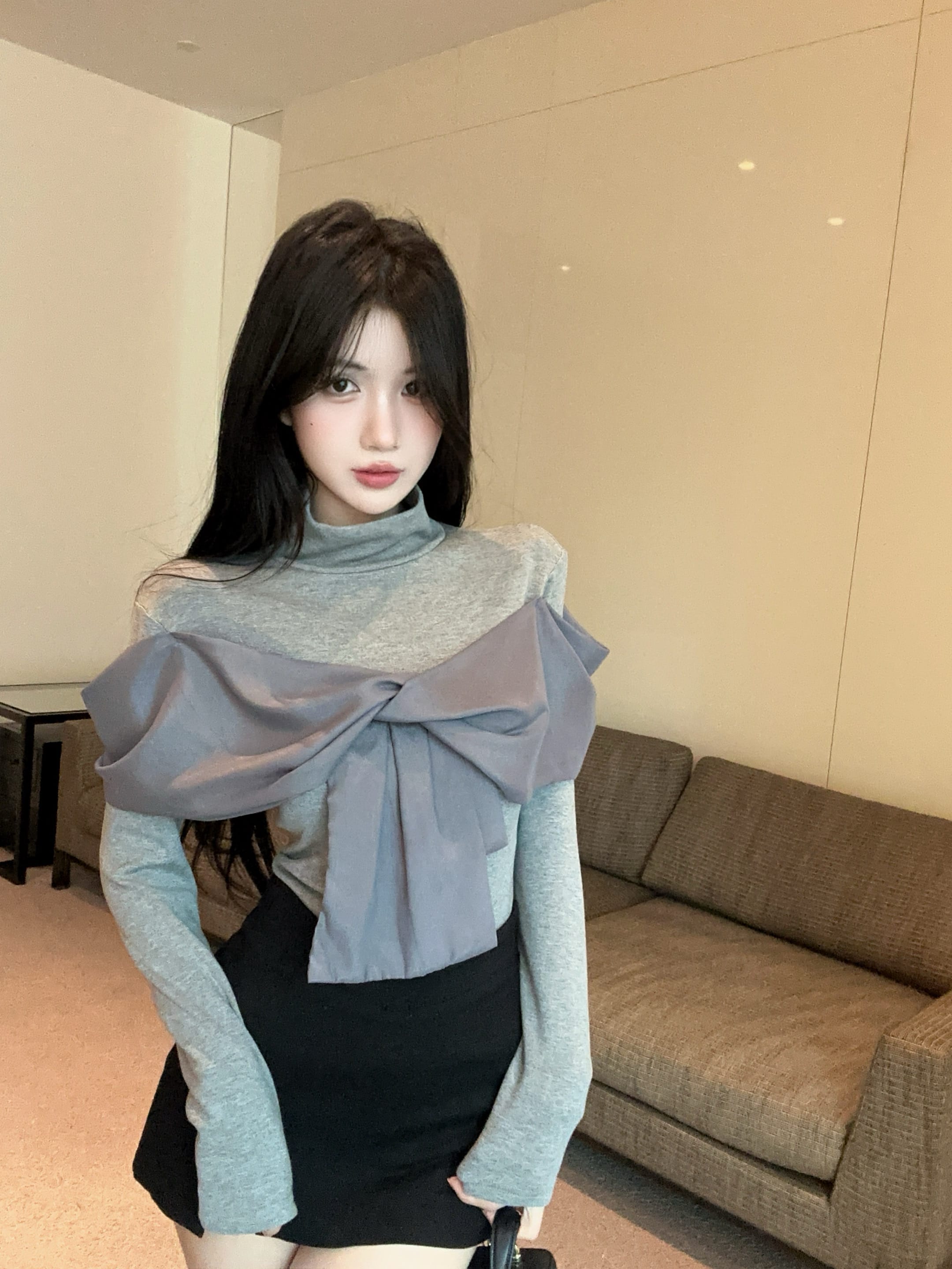 FA50144# 秋冬季半高领假两件拼接蝴蝶结长袖T恤时尚显瘦气质上衣 服裝批發女裝批發服飾貨源