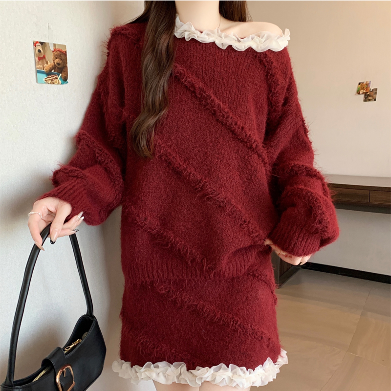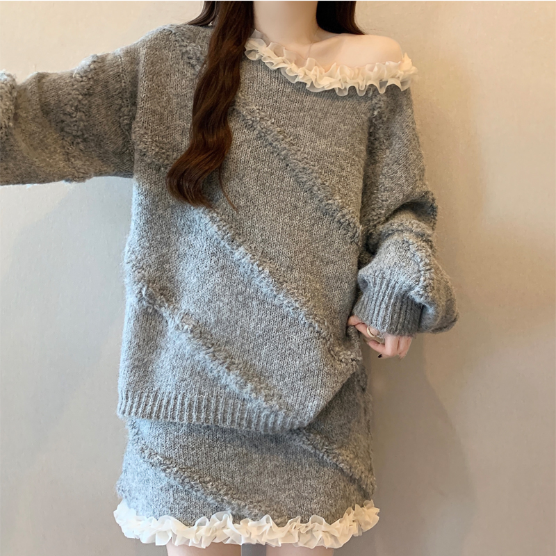FA50167# 秋冬氛围感穿搭红色毛衣套装女新款针织花边领上衣短裙两件套 服裝批發女裝批發服飾貨源