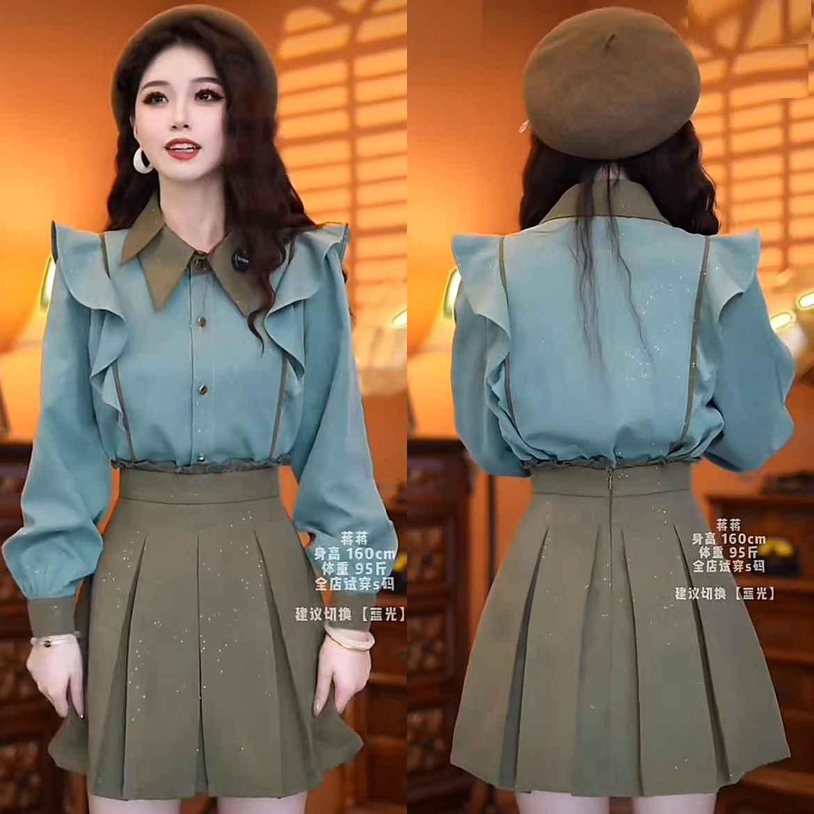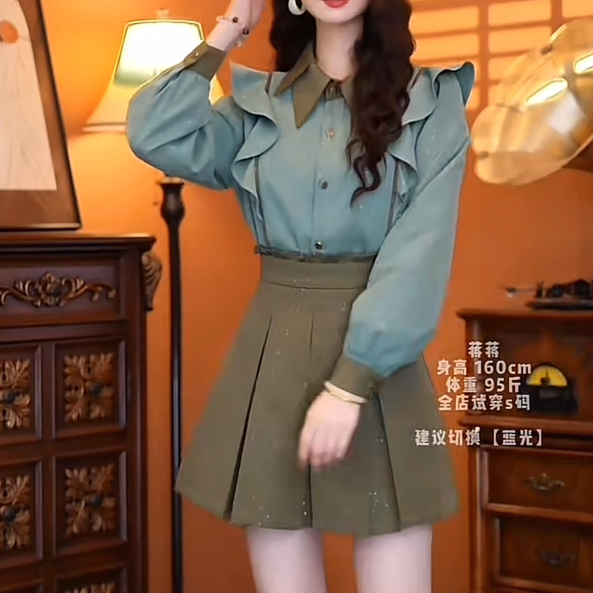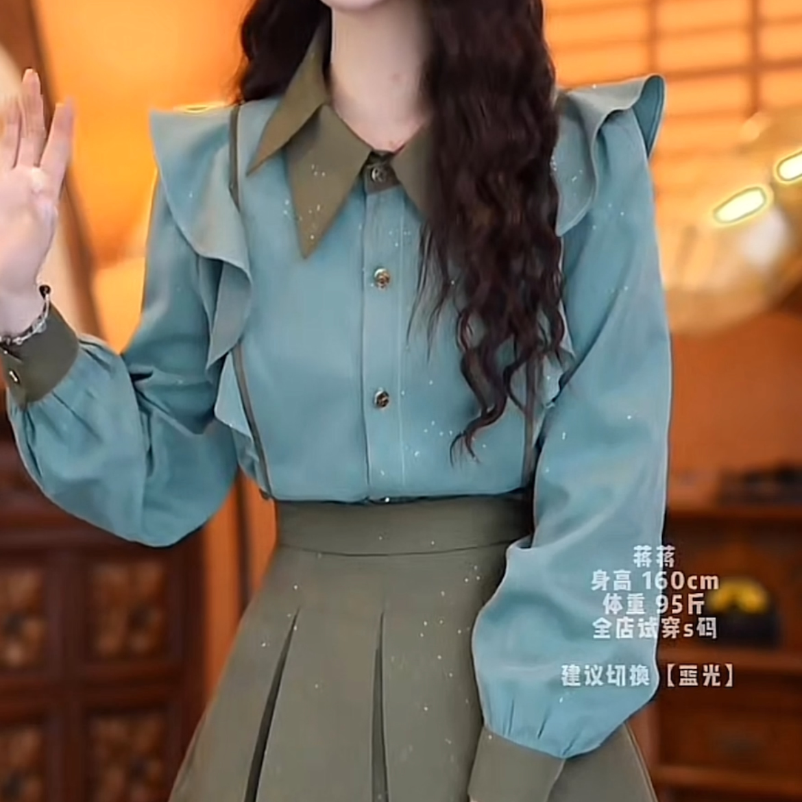 FA50245# 砂金绿秋冬简约拼色小众气质设计感长袖衬衫厚实上衣 服裝批發女裝批發服飾貨源