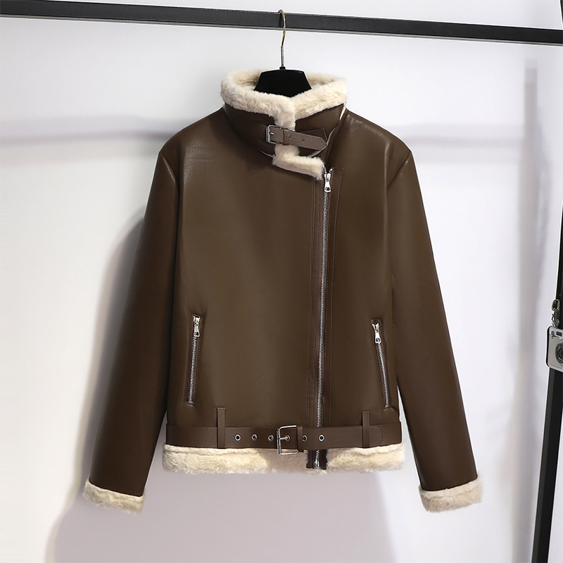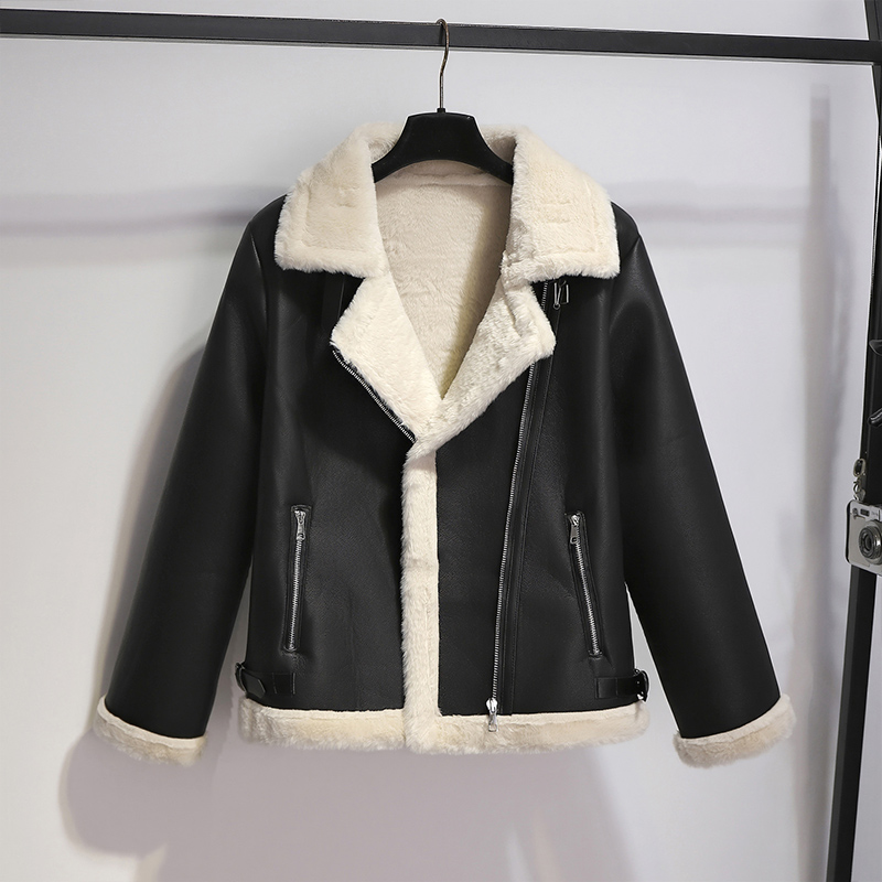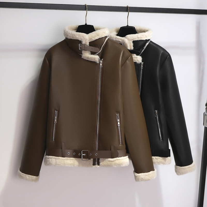 FA50471# 秋冬新款加绒加厚pu皮衣皮毛一体短款外套女羊羔毛机车服夹克 服裝批發女裝批發服飾貨源