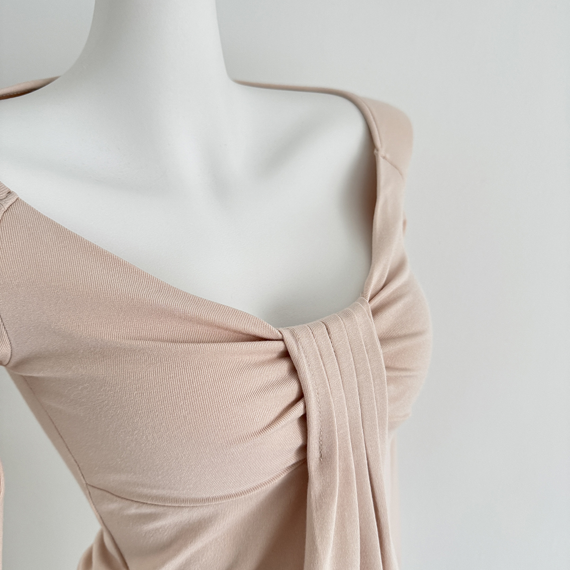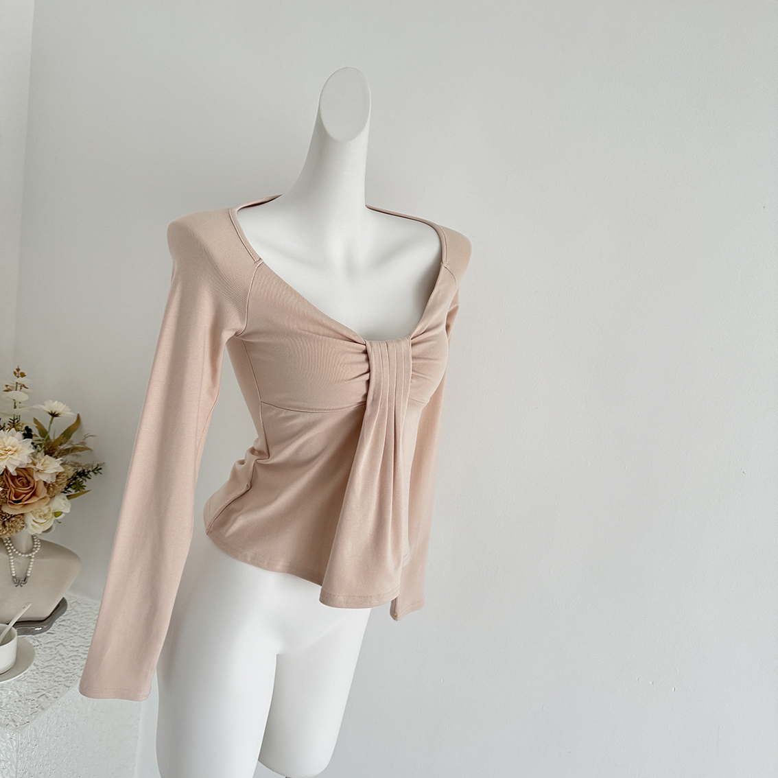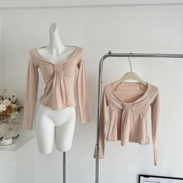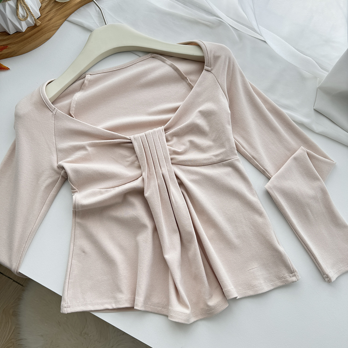 FA50560# 氛围之神U领褶皱羊毛长袖t恤女秋冬收腰显瘦打底衫上衣 服裝批發女裝批發服飾貨源