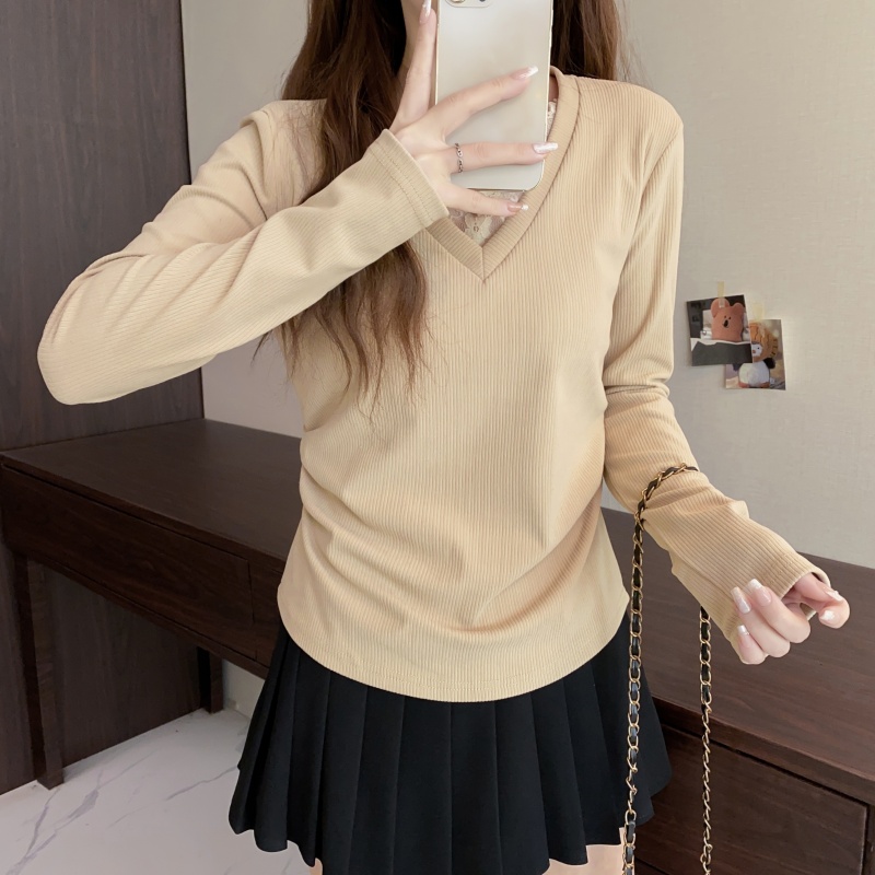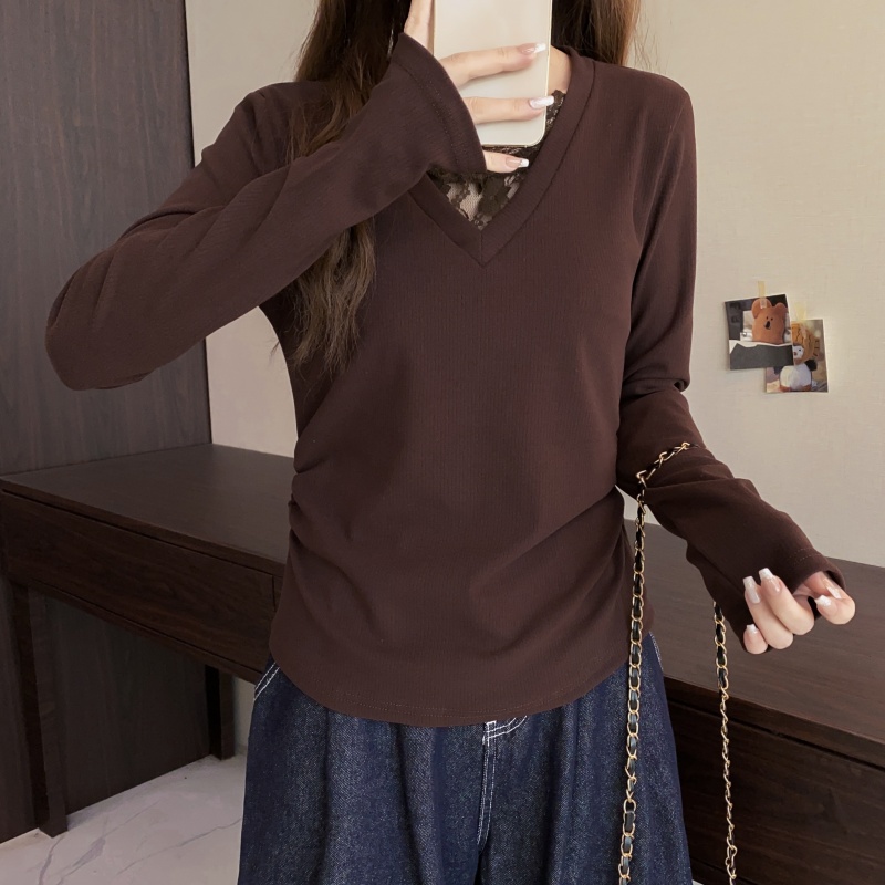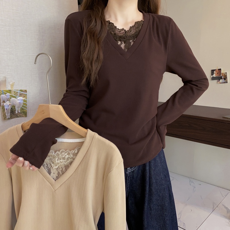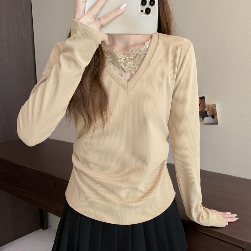 FA50588# 大码长袖V领假两件蕾丝边加厚保暖T恤减龄遮肉显瘦打底衫女装 服裝批發女裝批發服飾貨源