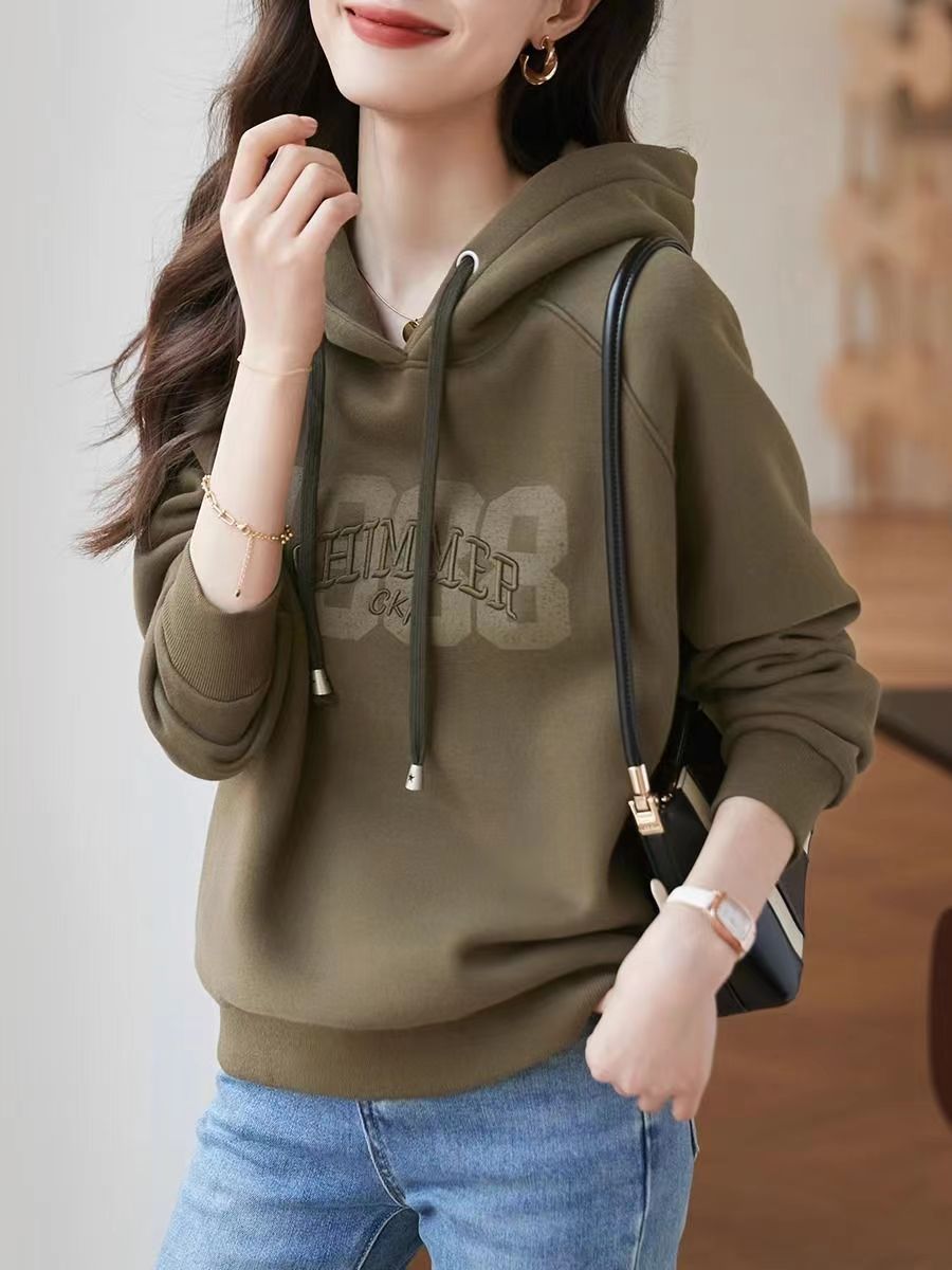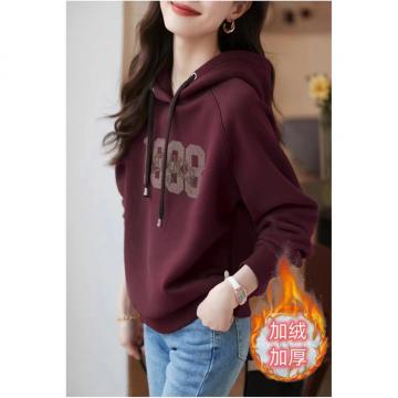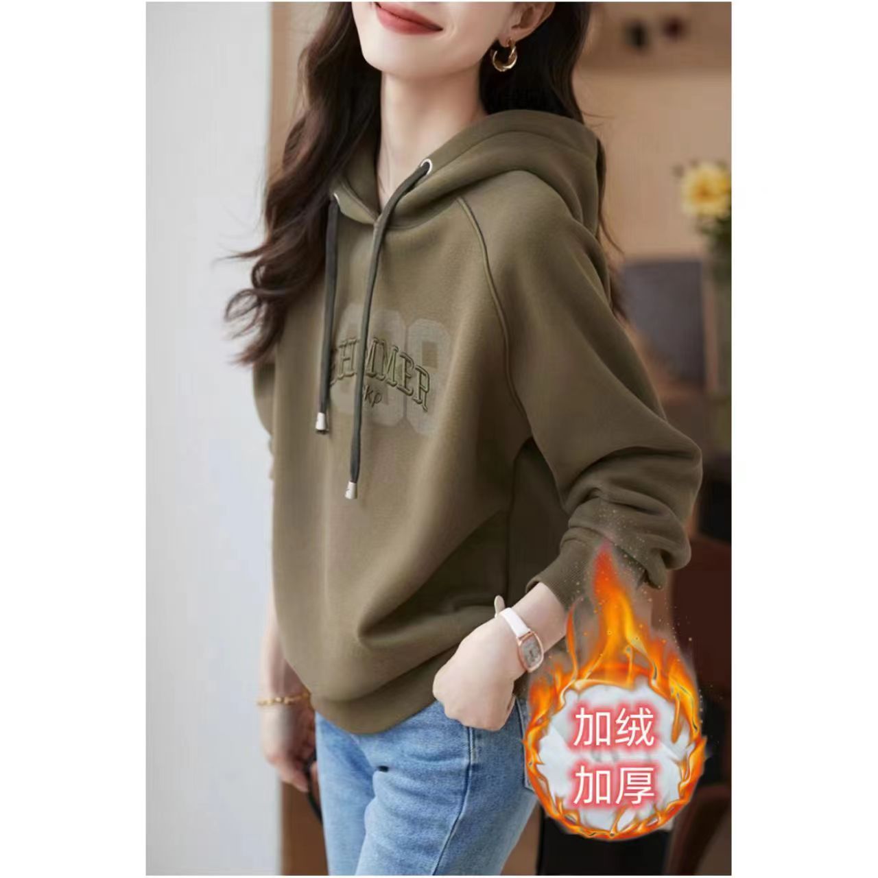 FA50639# 休闲字母加绒卫衣冬季新款简约百搭抽绳连帽外套保暖上衣女 服裝批發女裝批發服飾貨源