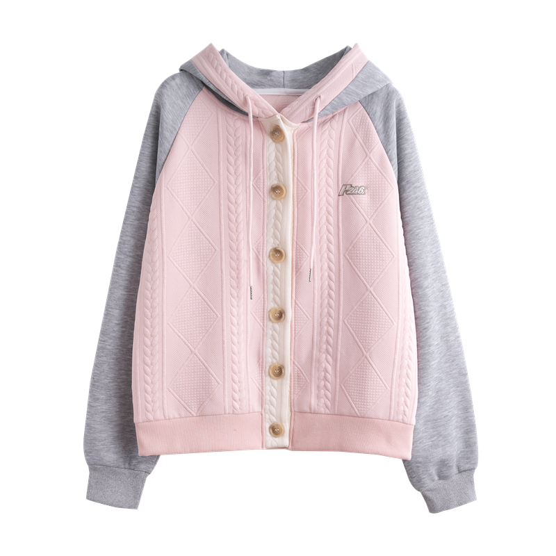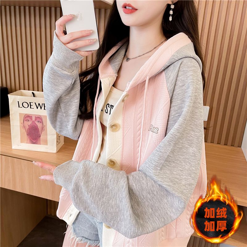 FA50843# 冬装韩版宽松绣花华棉插色提花连帽开衫加绒加厚卫衣女 服裝批發女裝批發服飾貨源