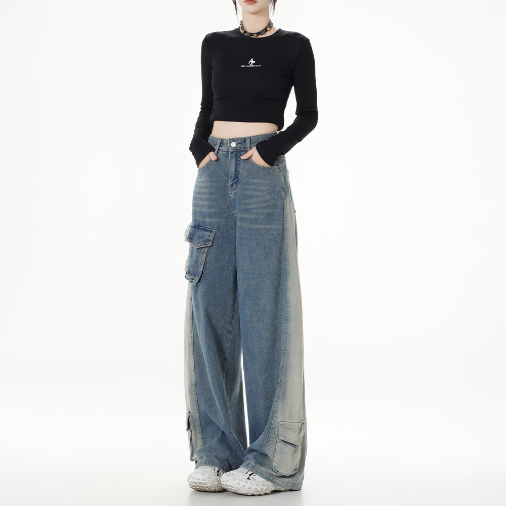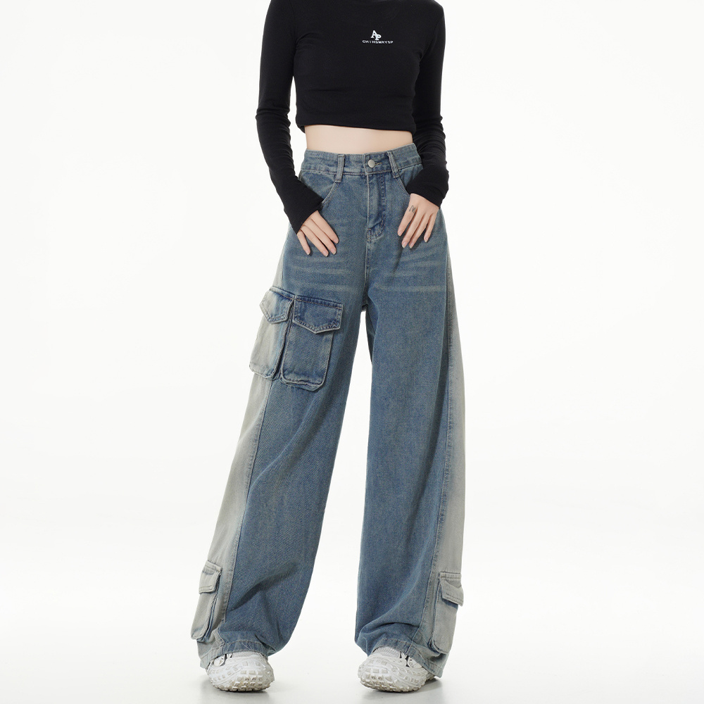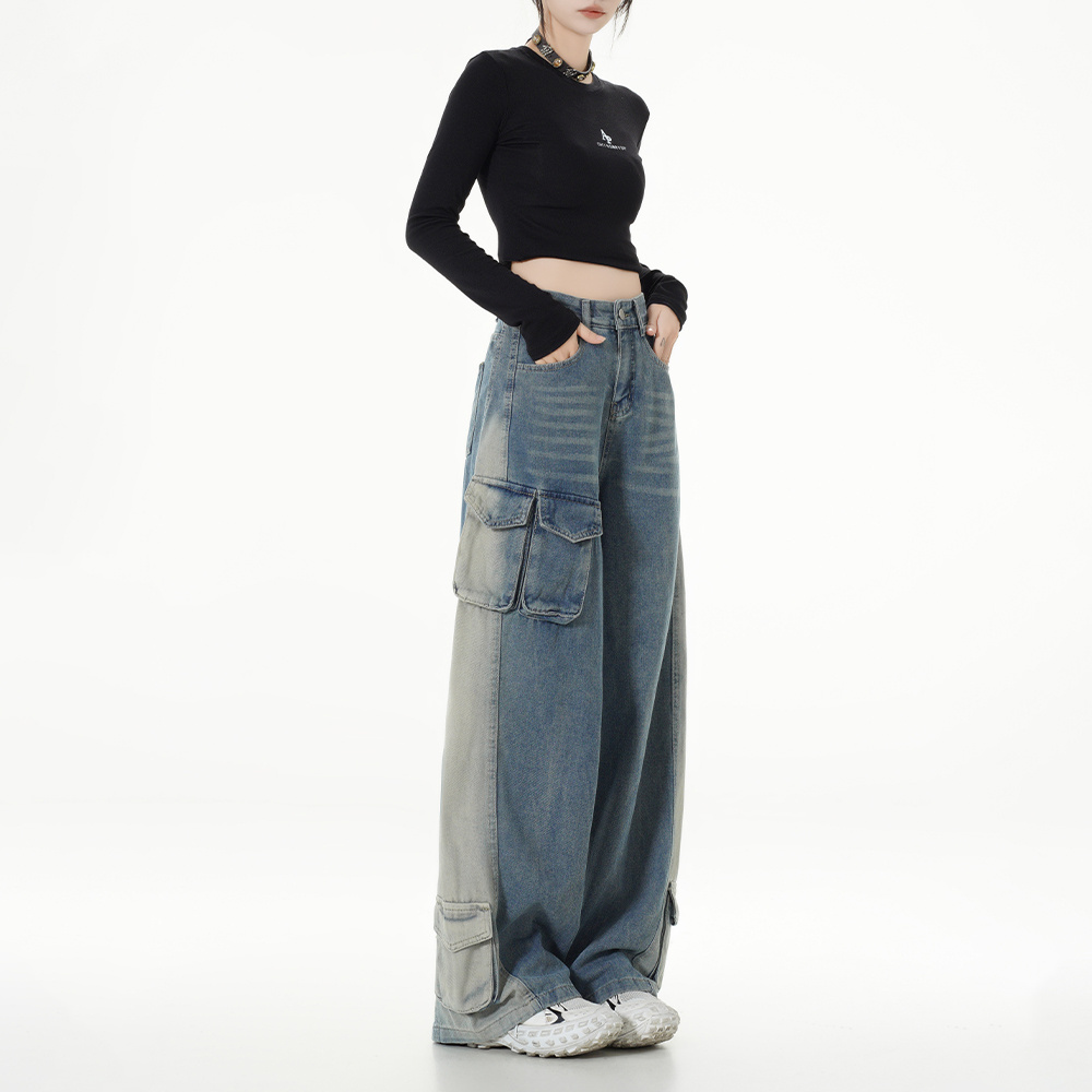 FA50920# 新款重工立体口袋美式复古水洗黄直筒工装酷帅牛仔裤女阔腿裤 服裝批發女裝批發服飾貨源