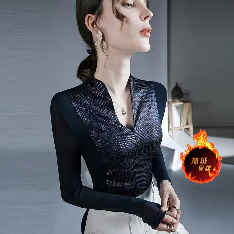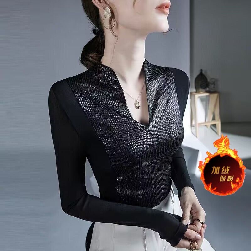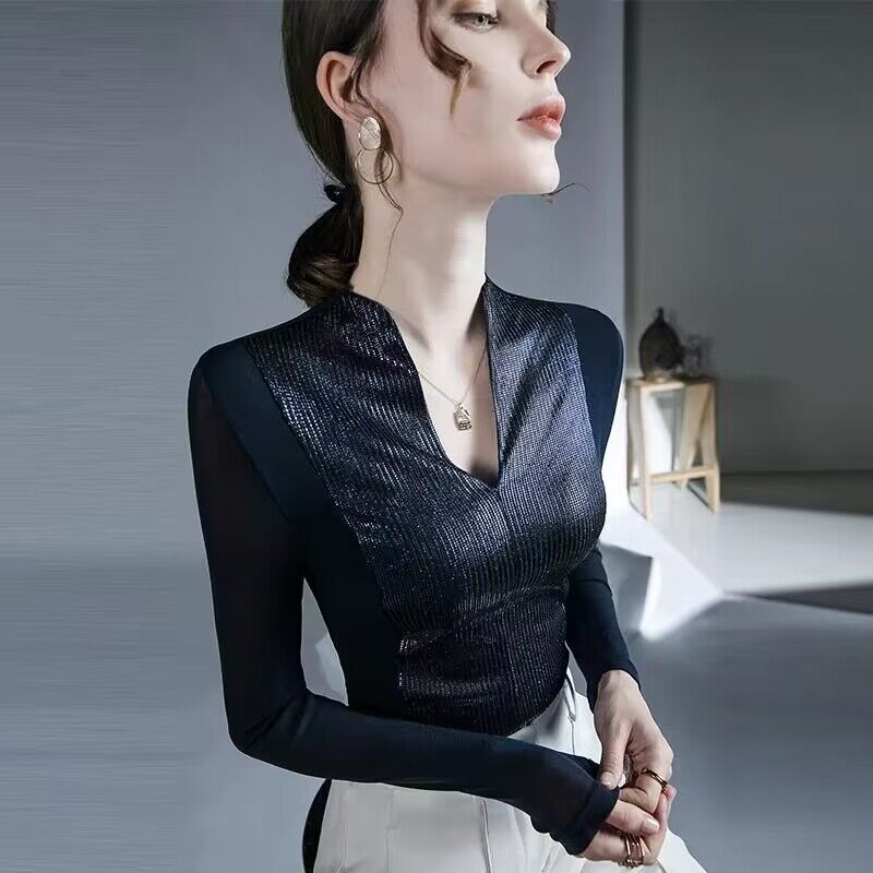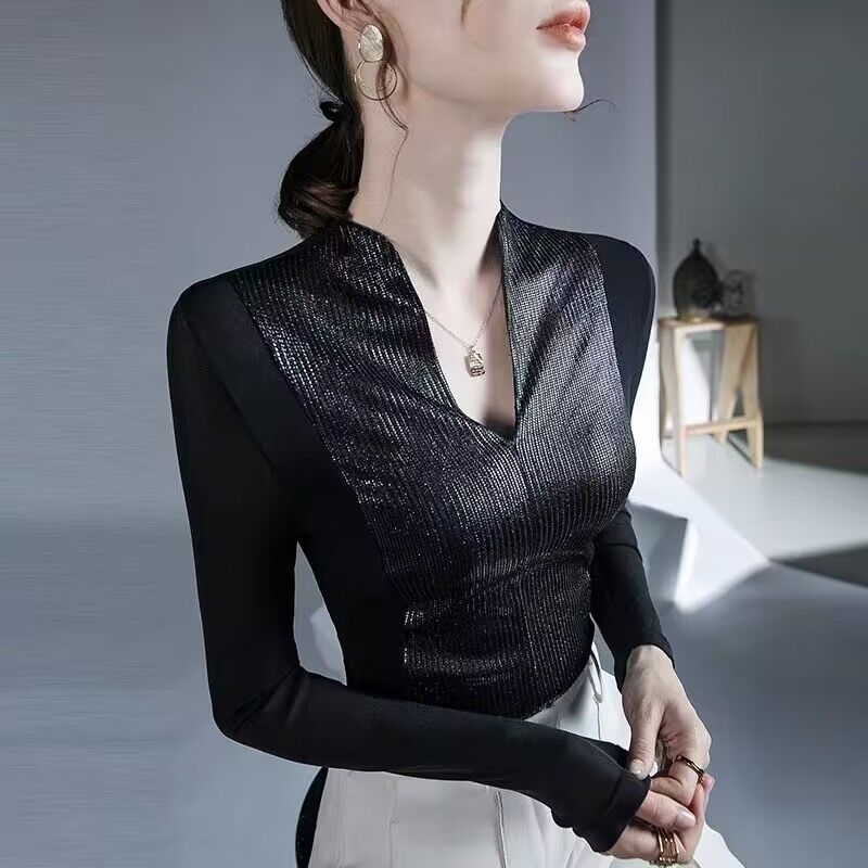 FA50950# 欧洲站气质时尚上衣秋冬新款女装内搭网纱别致性感长袖打底衫 服裝批發女裝批發服飾貨源