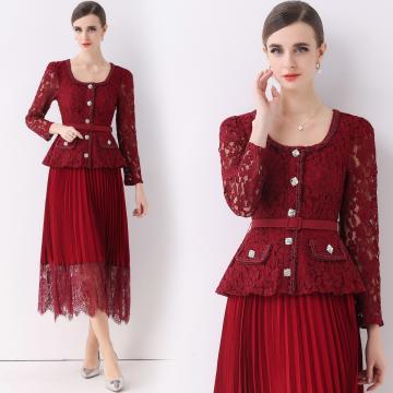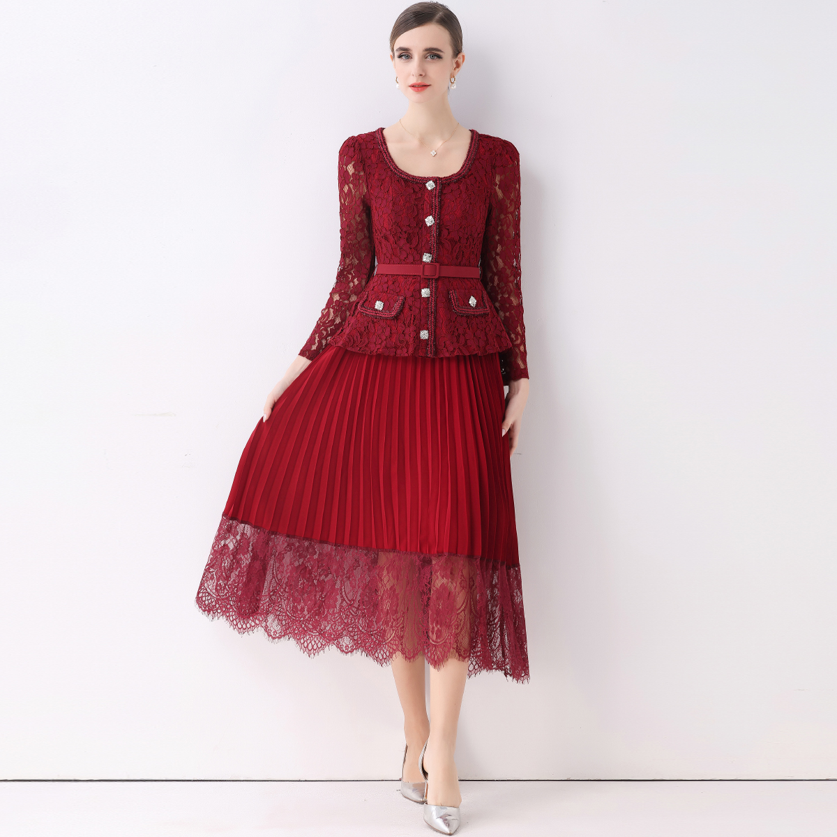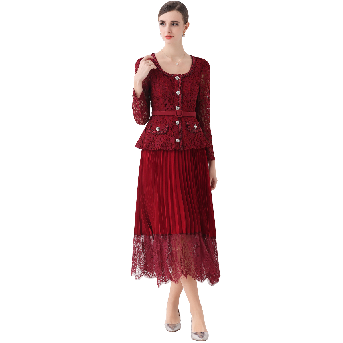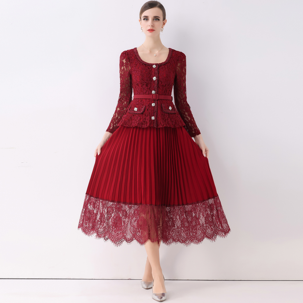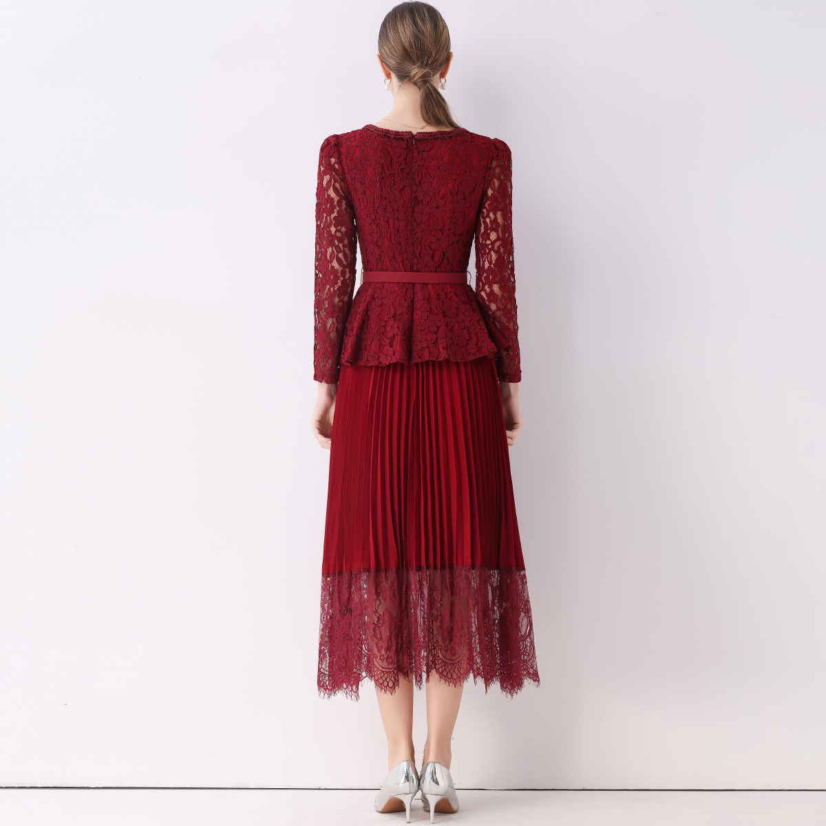 Home > 夜店裙、长袖连衣裙 > FA51360# 法式翻领蕾丝拼接收腰压褶连衣裙女秋季小香风长裙子送腰带 服裝批發女裝批發服飾貨源
