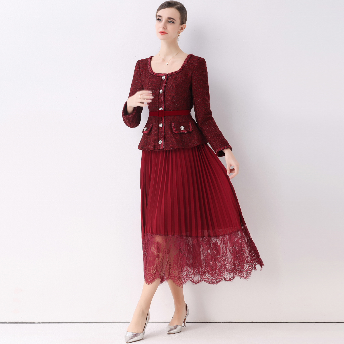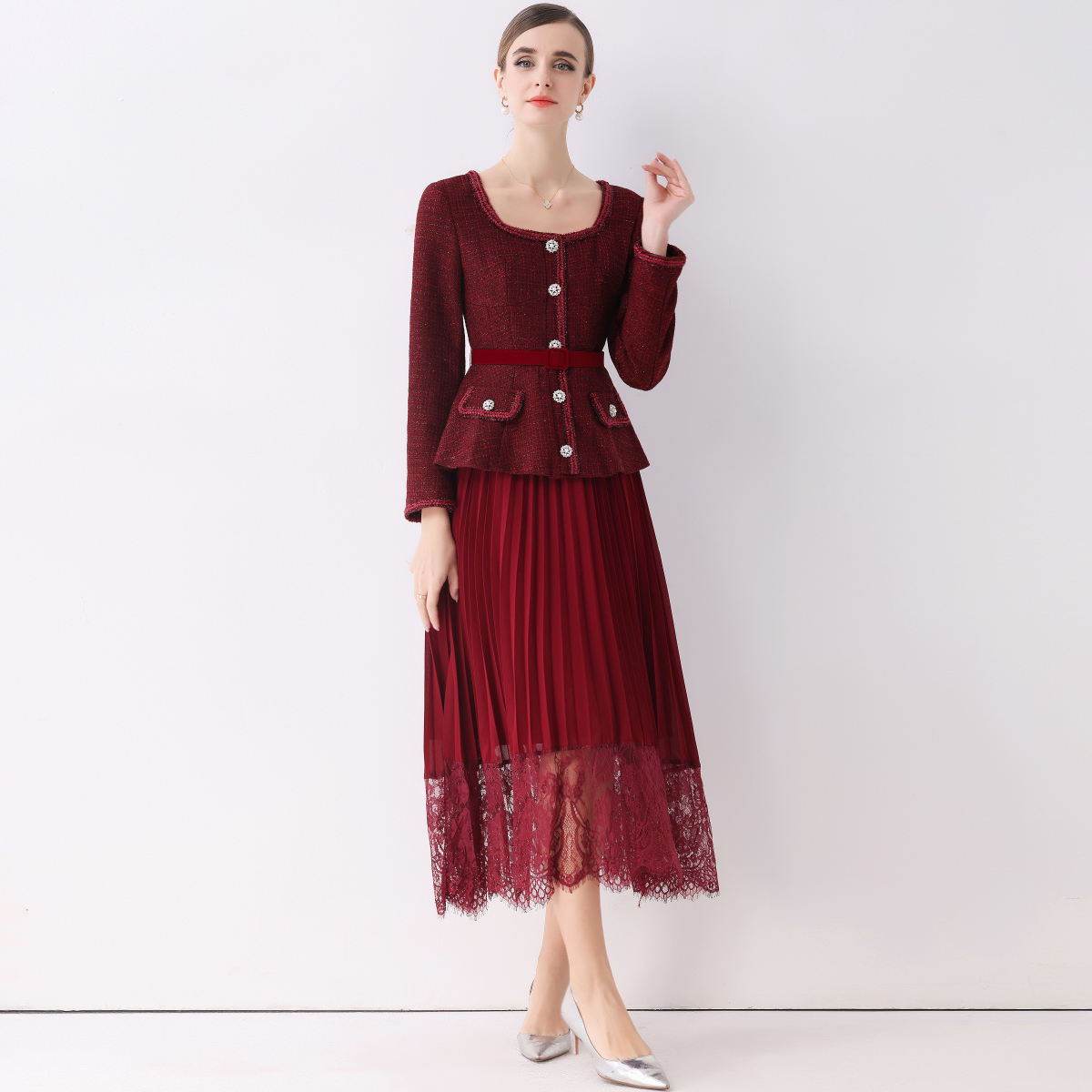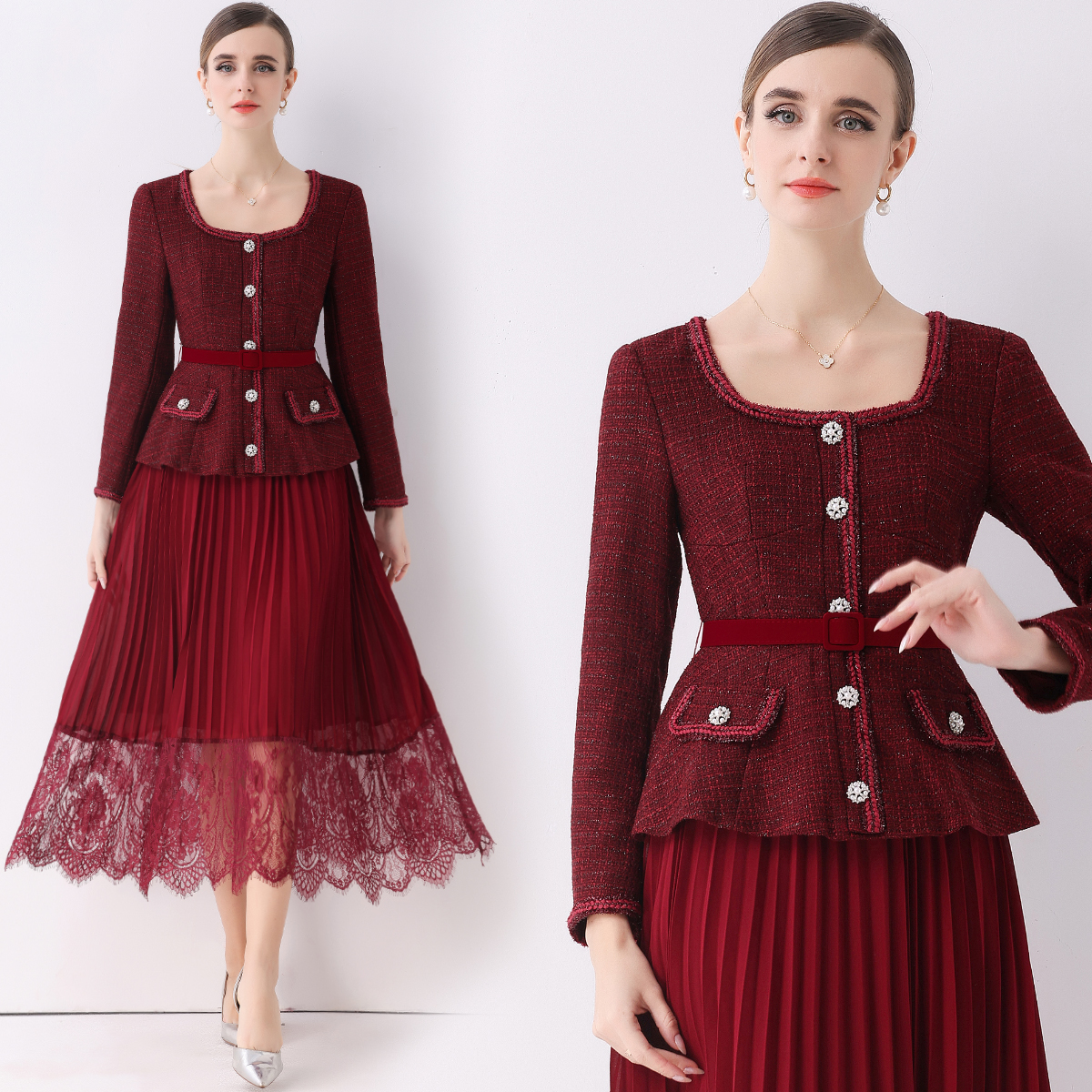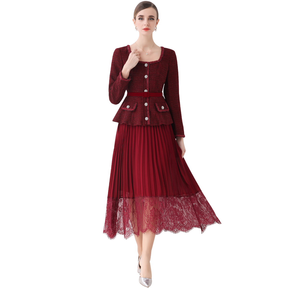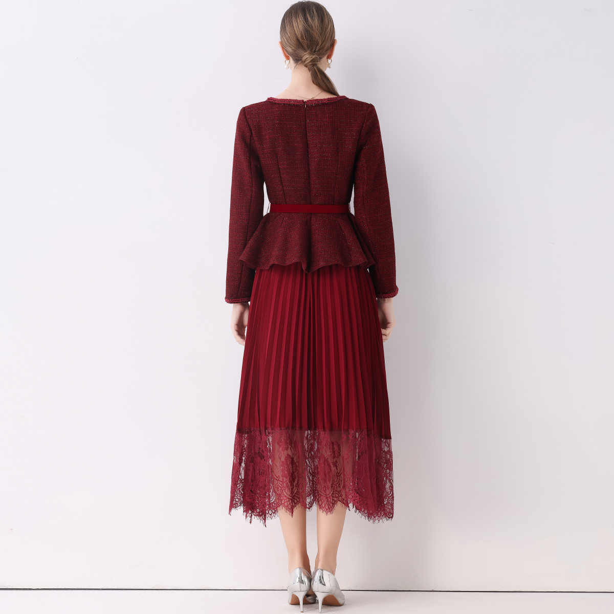 Home > 夜店裙、长袖连衣裙 > FA51361# 优雅气质收腰小香风连衣裙女假两件百褶长裙送腰带 服裝批發女裝批發服飾貨源