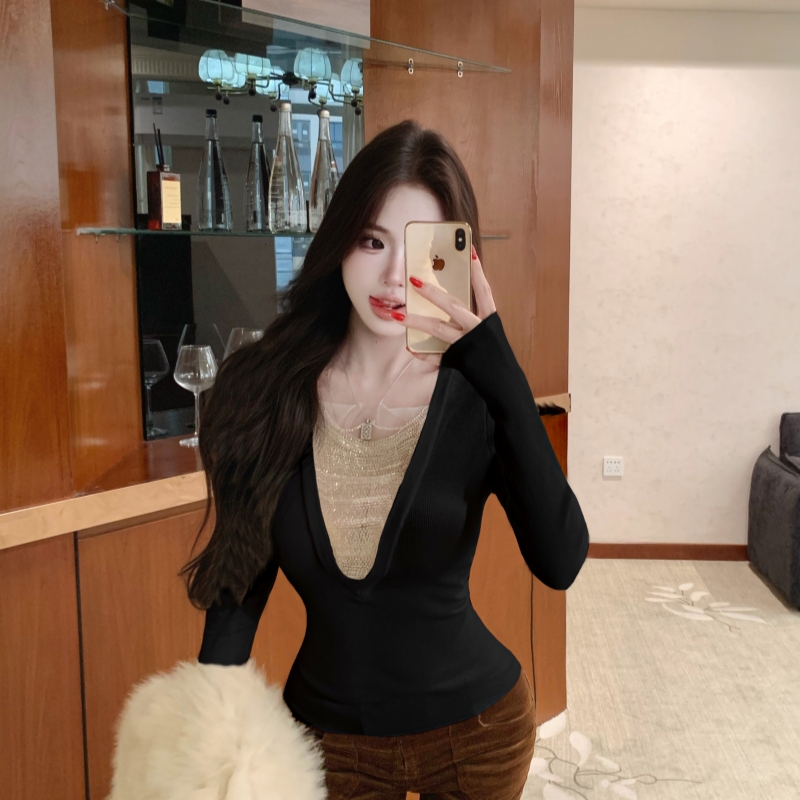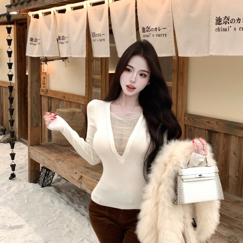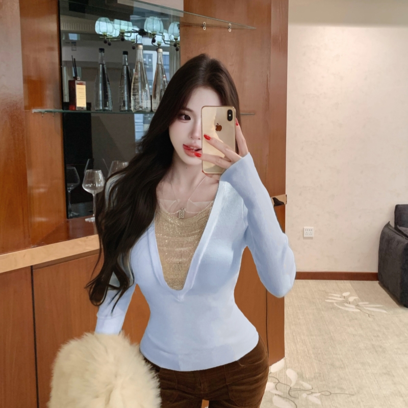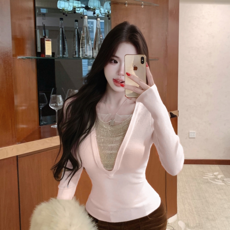 FA51397# 氛围感小心机V领闪钻针织衫修身显瘦早秋内搭外穿上衣秋冬 服裝批發女裝批發服飾貨源