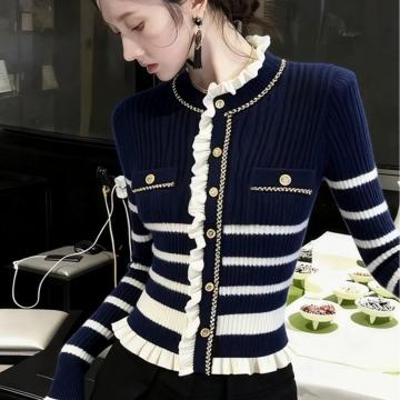 FA51403# 小香风条纹针织开衫木耳边拼接装饰修身显瘦短款毛衣外套女 服裝批發女裝批發服飾貨源