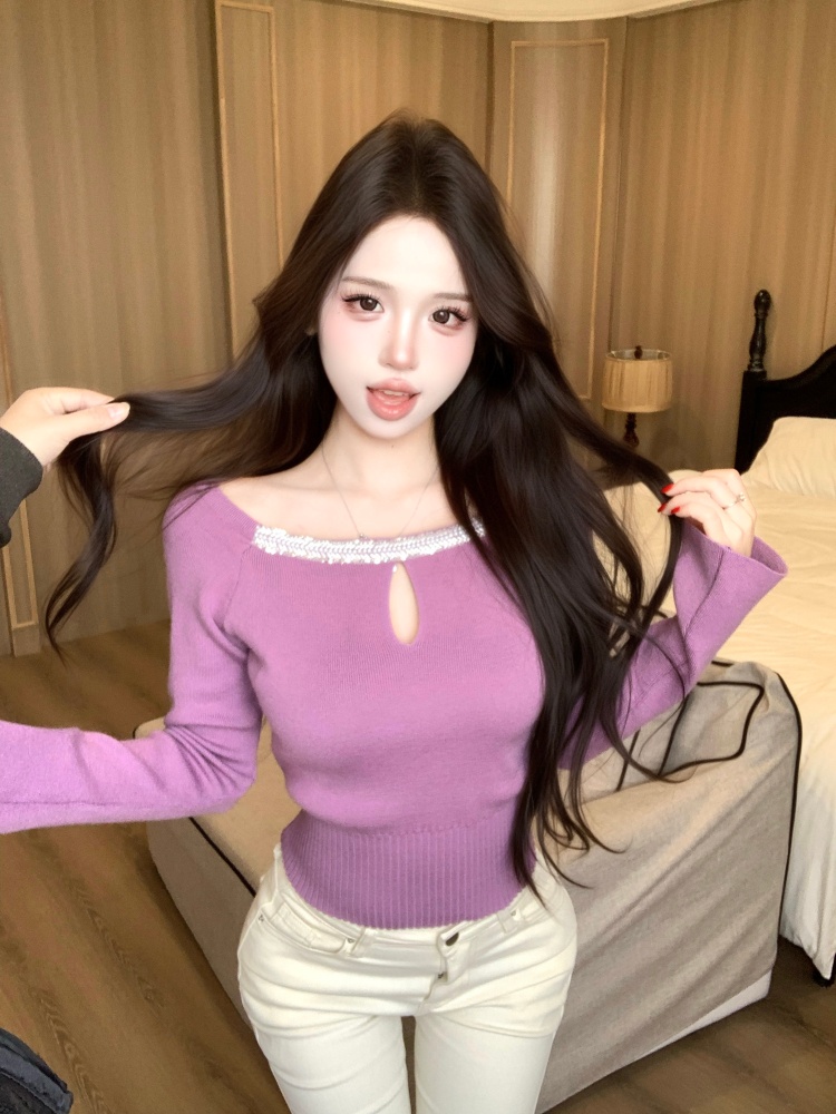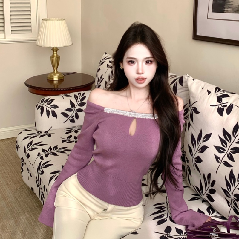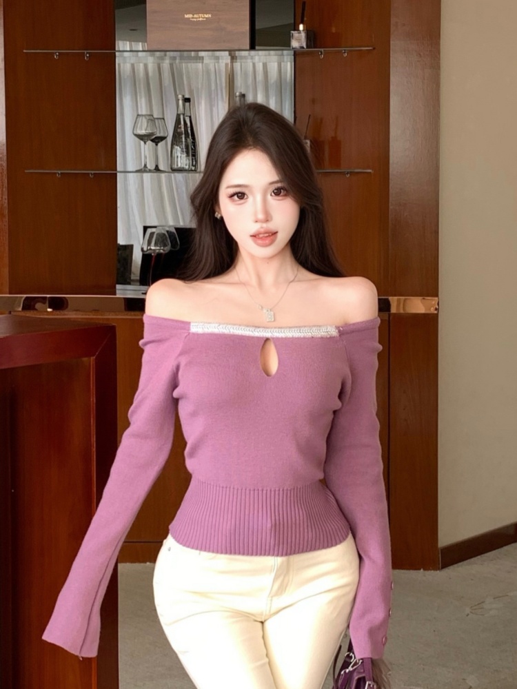 FA51405# 秋冬新款温柔挂脖露肩针织上衣女氛围感小心机镂空修身打底衫潮 服裝批發女裝批發服飾貨源