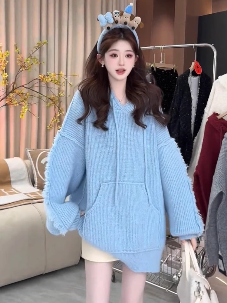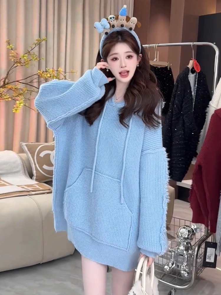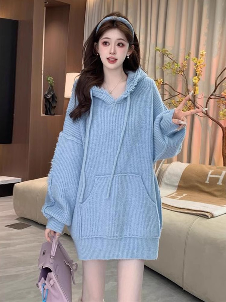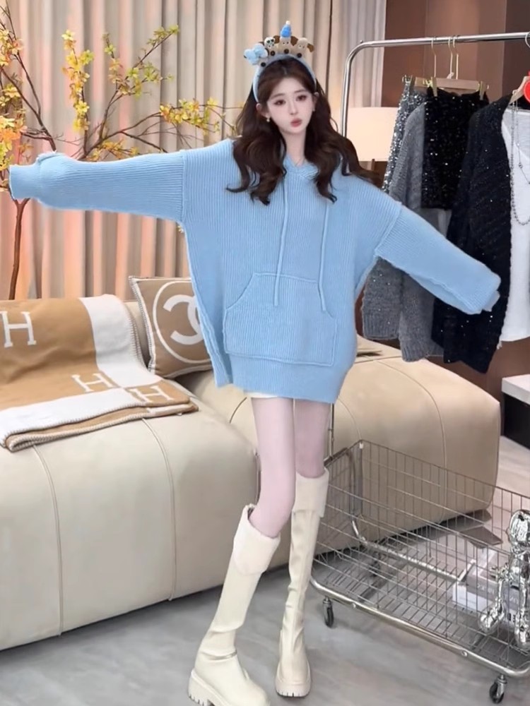 FA51552# 蓝色连帽卫衣毛衣女秋冬季宽松慵懒风松弛高级感中长款针织衫上衣 服裝批發女裝批發服飾貨源