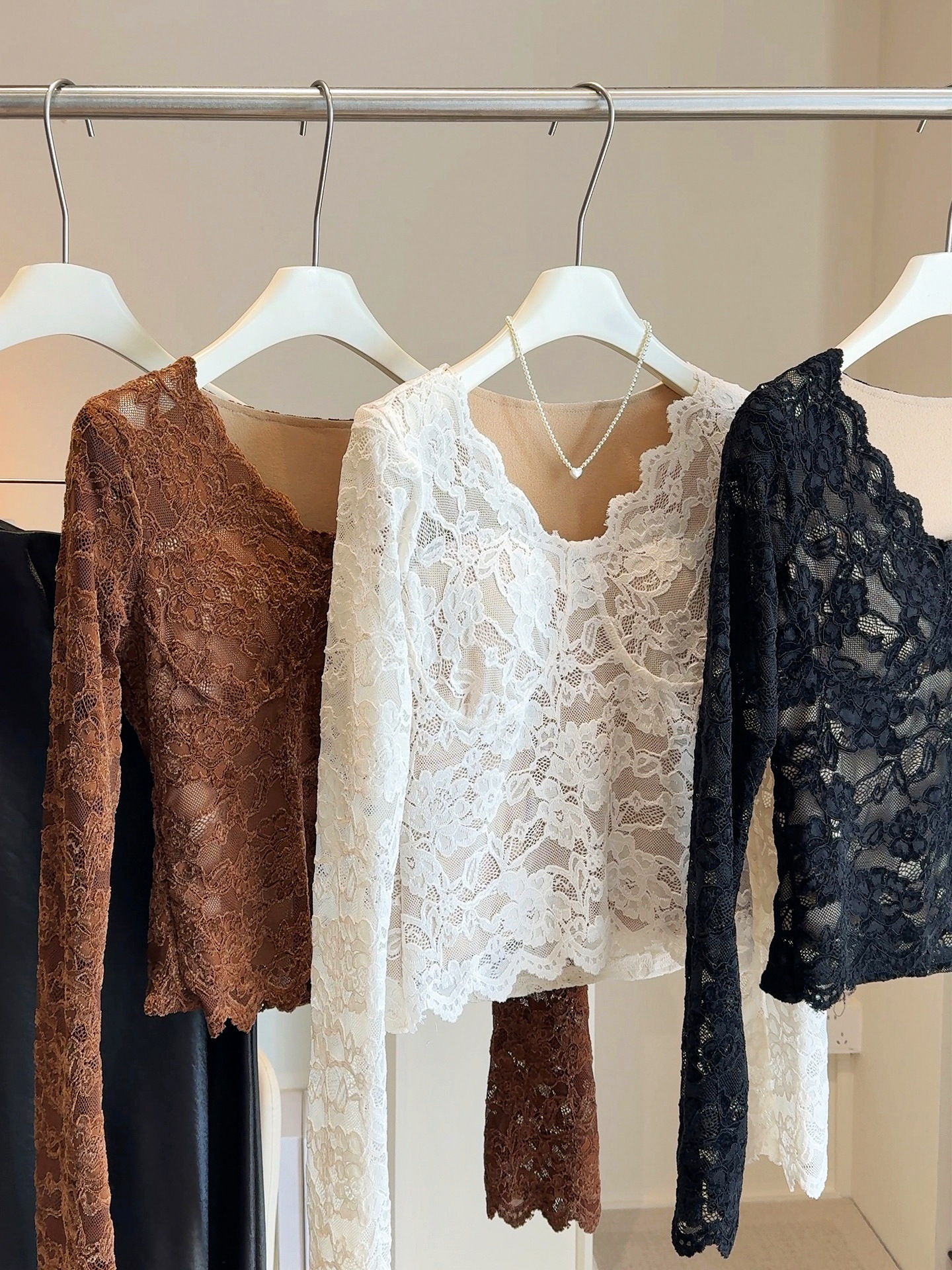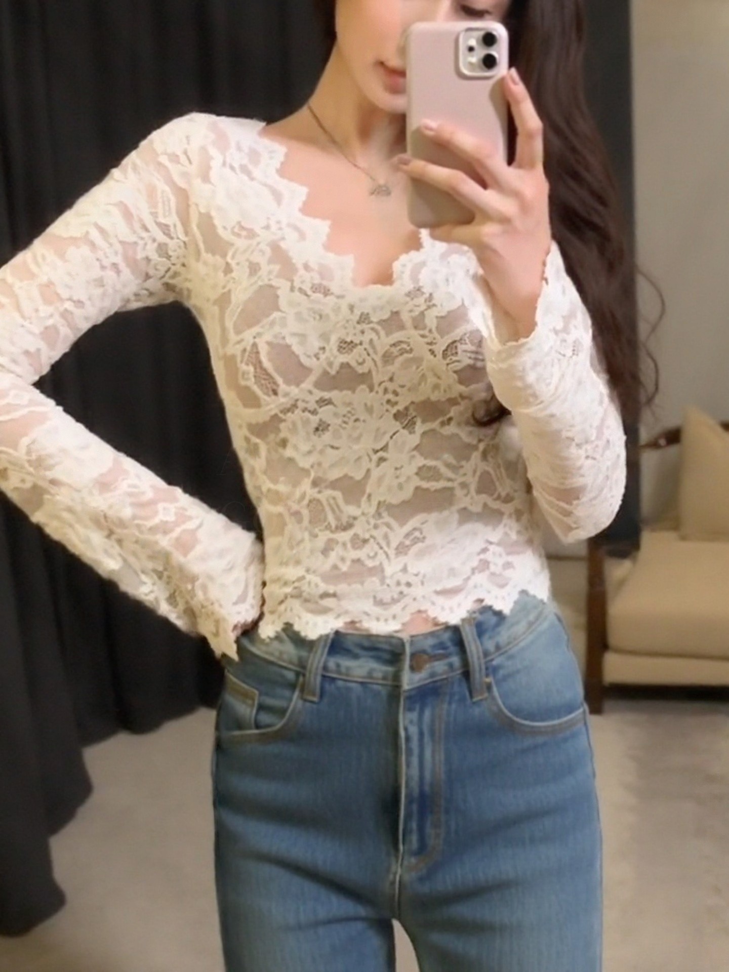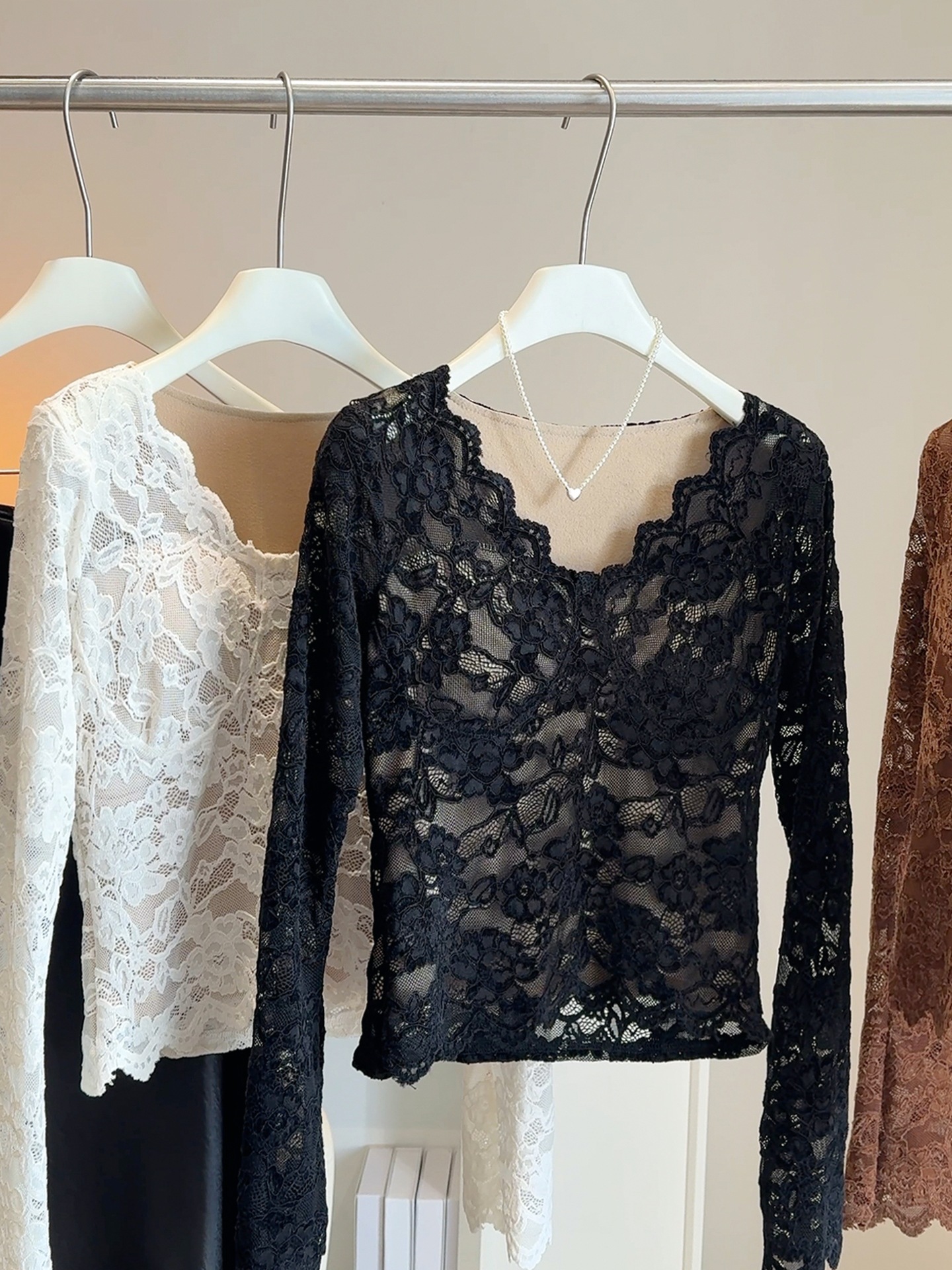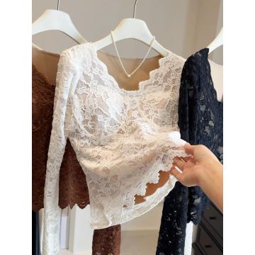 FA51564# 加绒V领性感带胸垫蕾丝打底衫女秋冬辣妹风修身长袖内搭上衣 服裝批發女裝批發服飾貨源