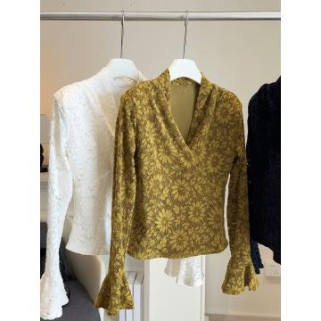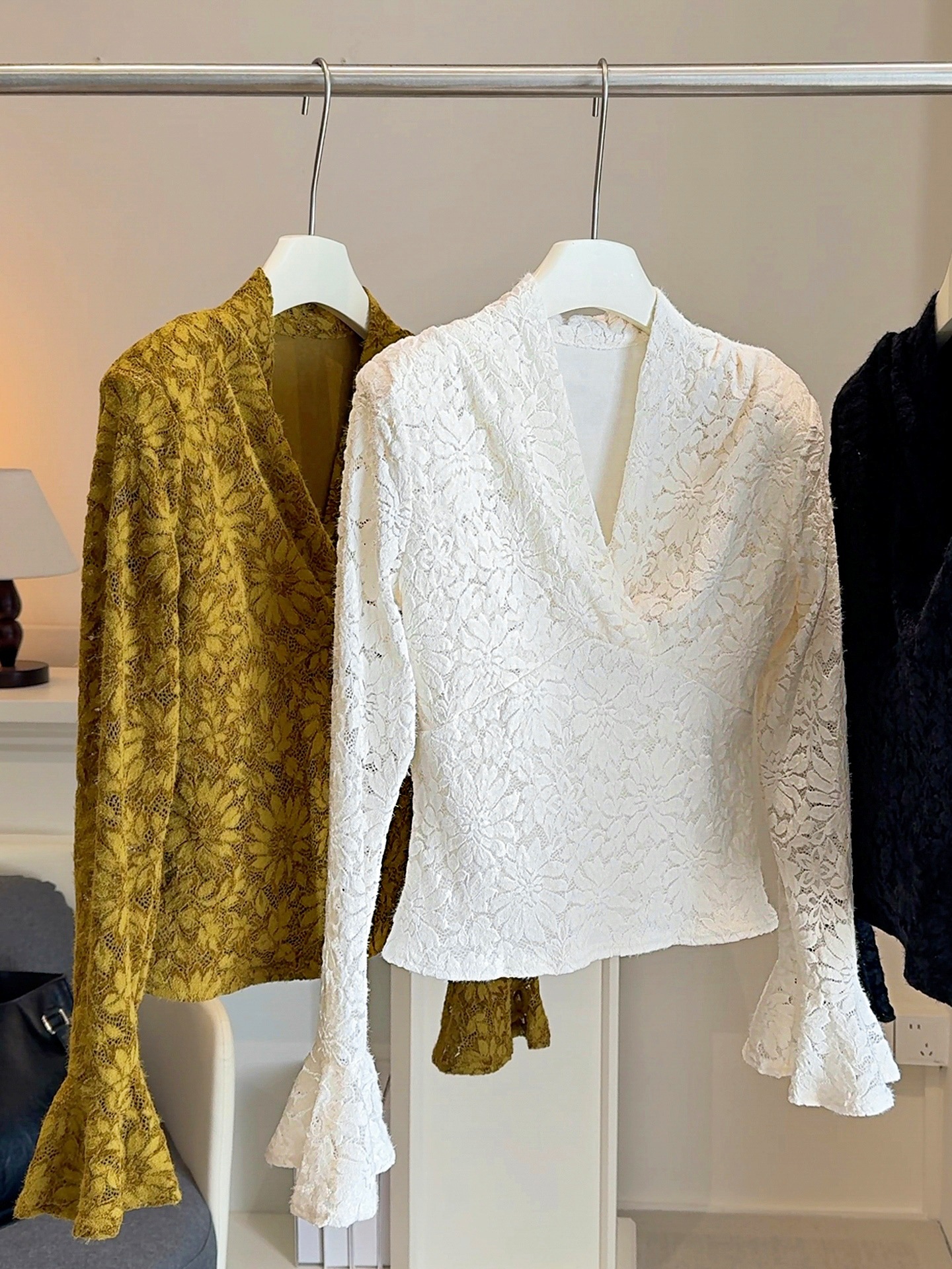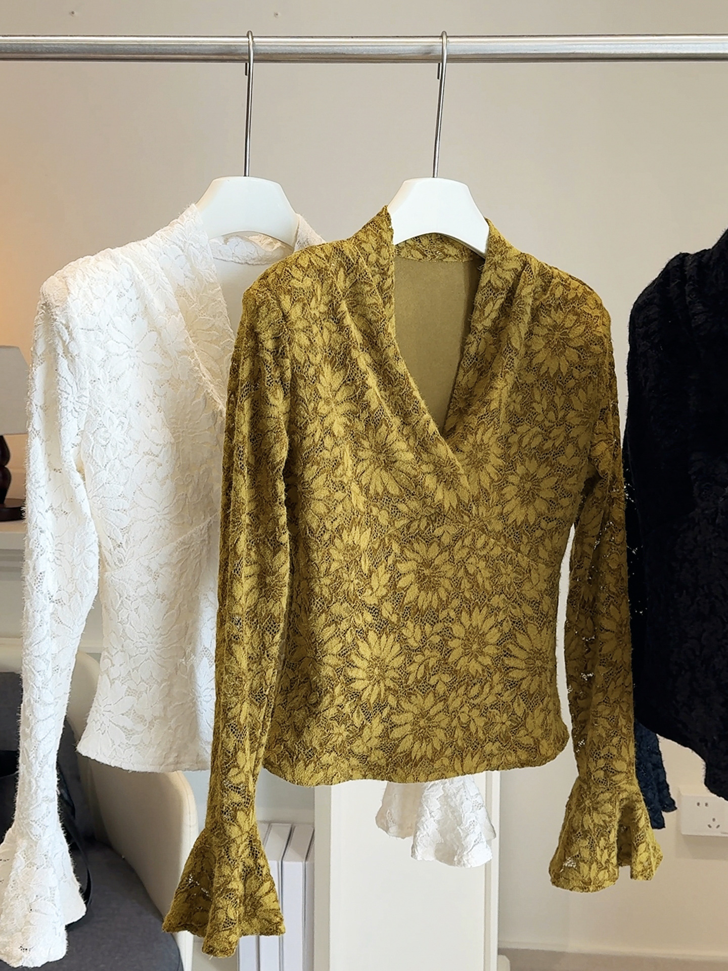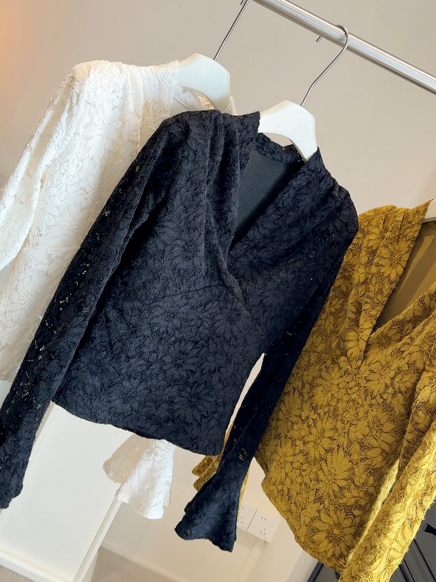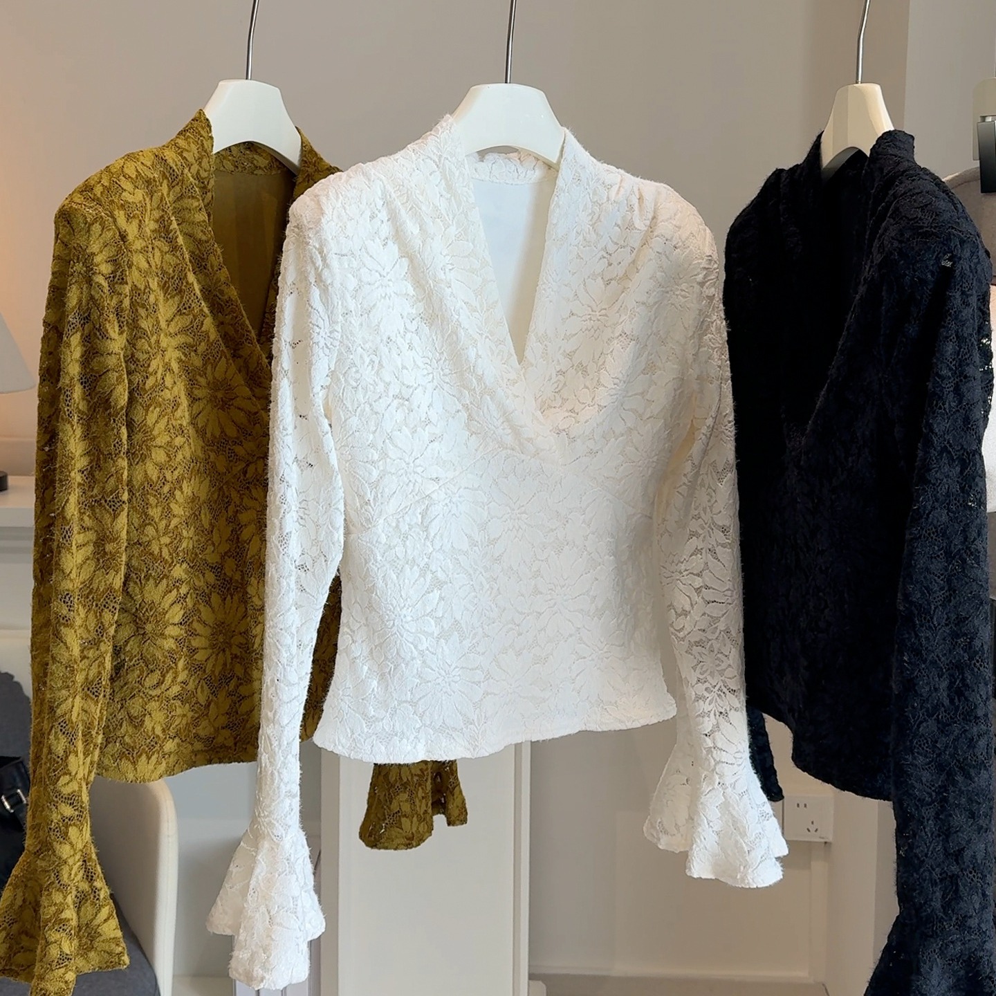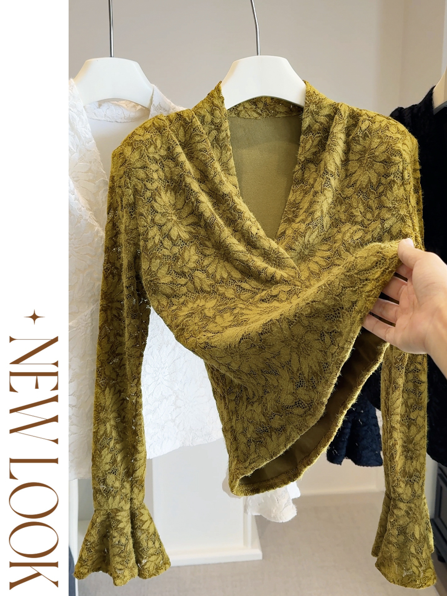 FA51565# 法式气质性感V领喇叭袖加绒加厚蕾丝衫女秋冬百搭修身内搭打底衫 服裝批發女裝批發服飾貨源