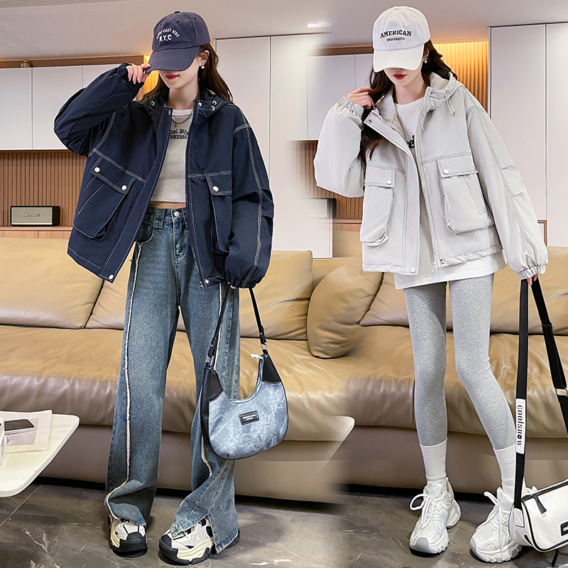 FA51571# 冬季新款潮流廓形外套显瘦明线冲锋衣女百搭连帽休闲棉衣 服裝批發女裝批發服飾貨源