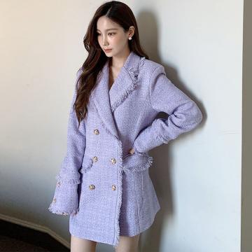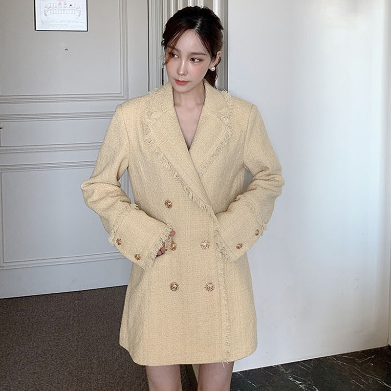 FA51719# 冬季新款小香风西装领双排扣中长款粗花呢外套 服裝批發女裝批發服飾貨源