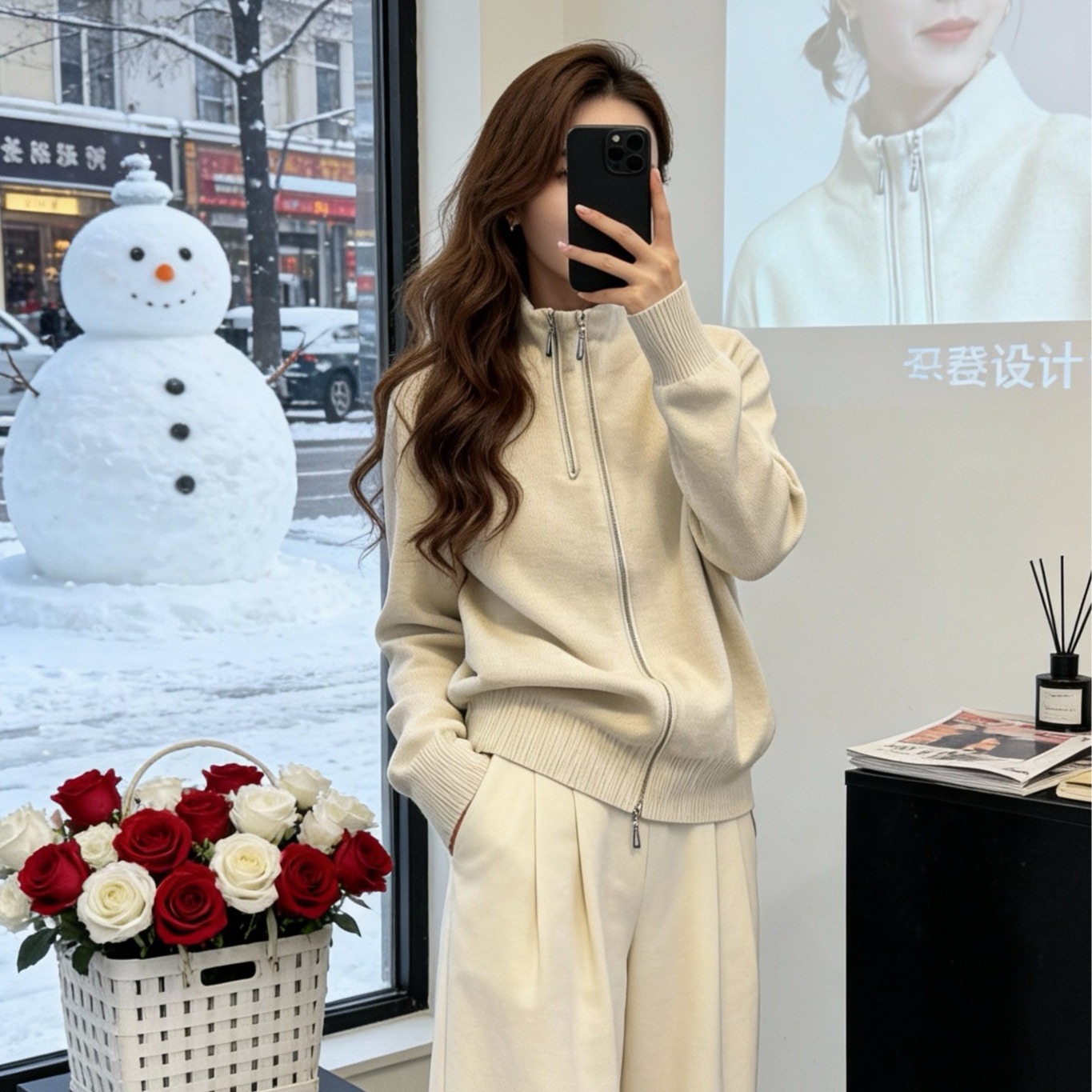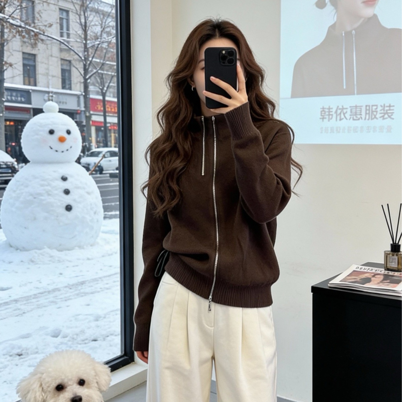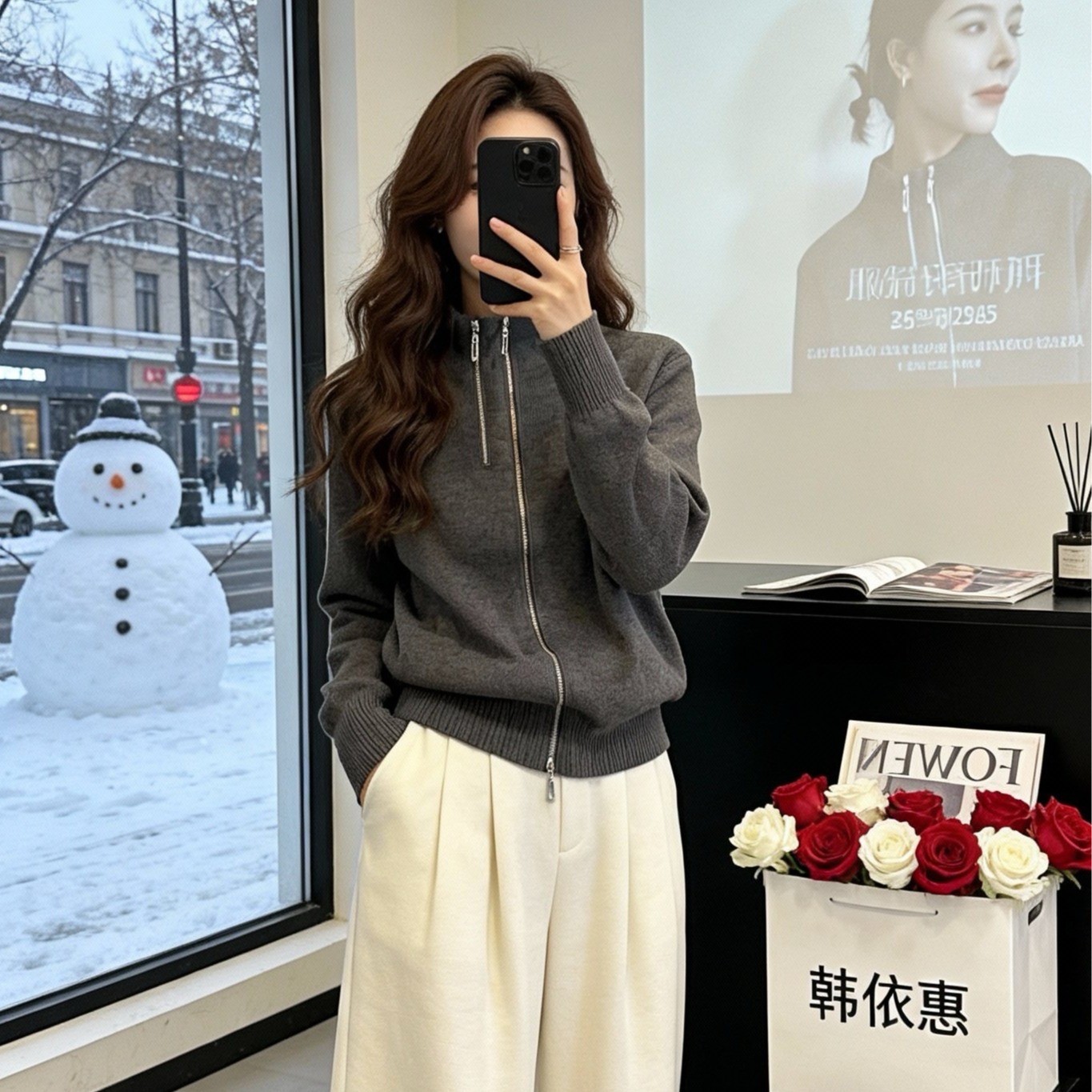 FA51809# 秋冬季韩系简约风双拉炼针织开衫女秋冬翻领灰色毛衣外套上衣 服裝批發女裝批發服飾貨源