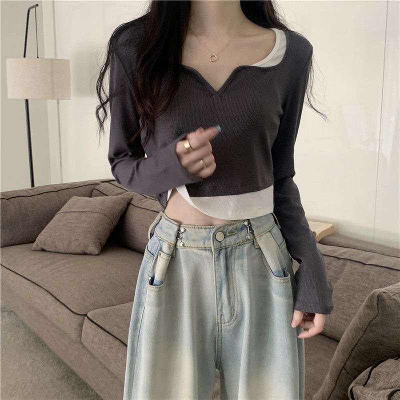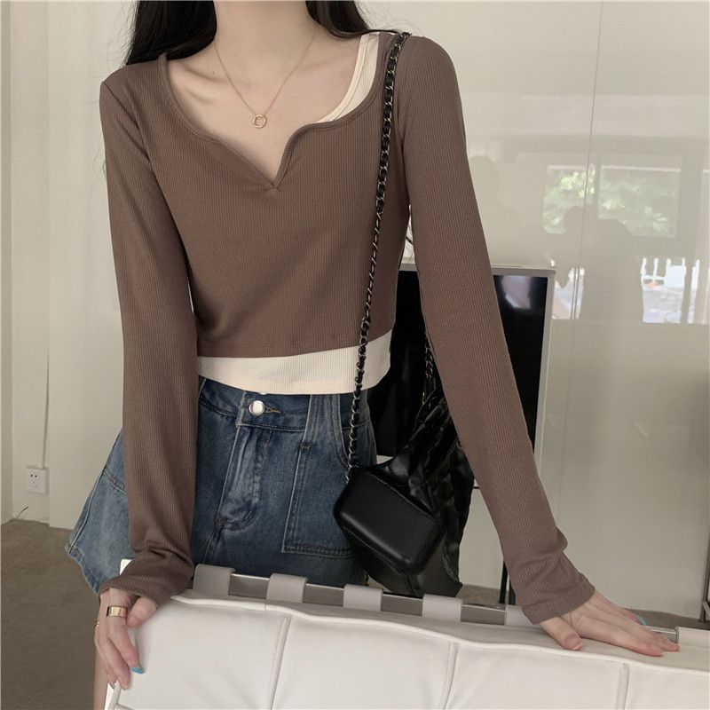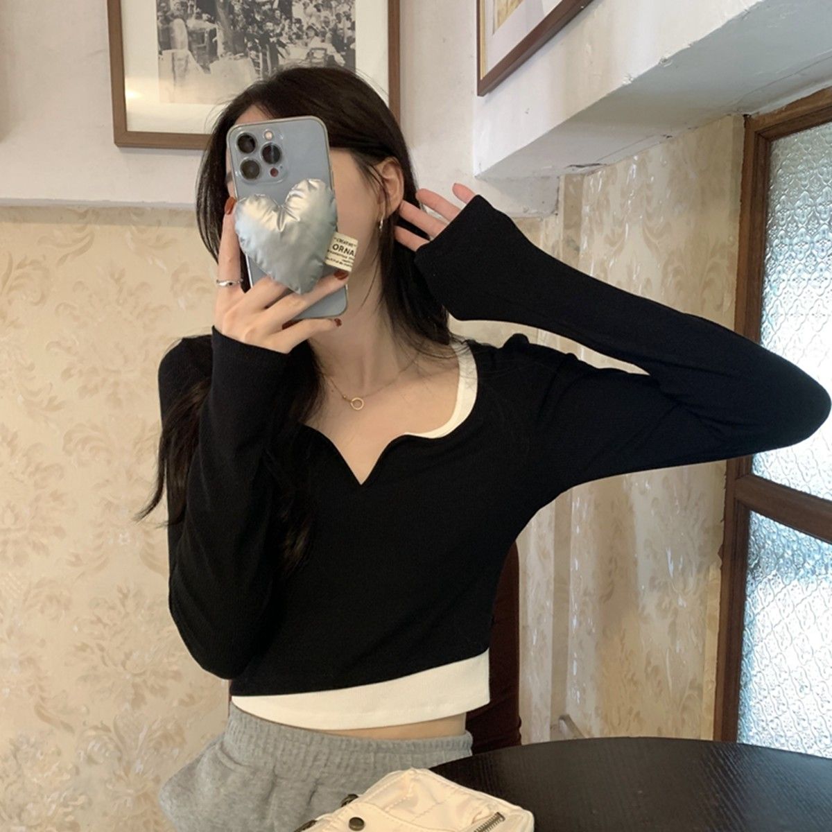 Home > 长袖T恤 > FA51814# 假两件拼色桃心领春秋内搭打底衫短款长袖t恤女 服裝批發女裝批發服飾貨源