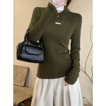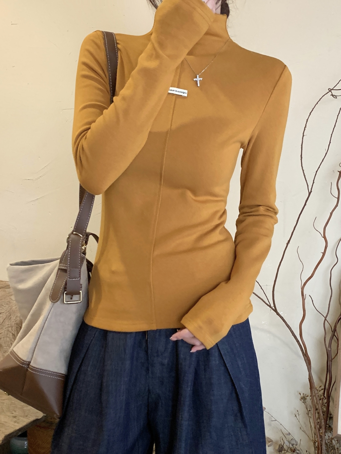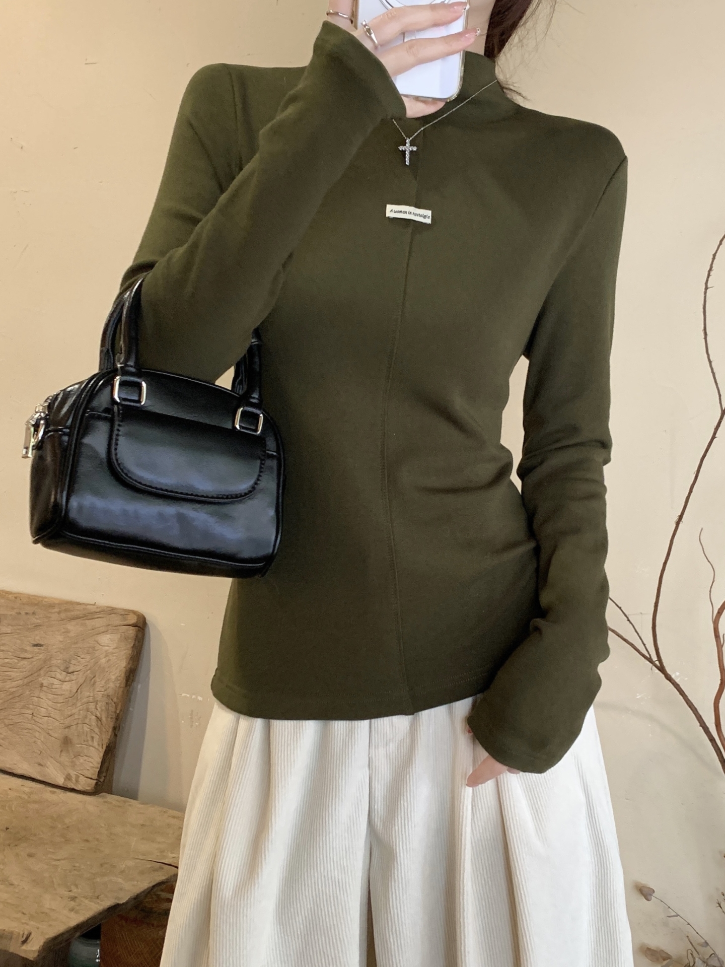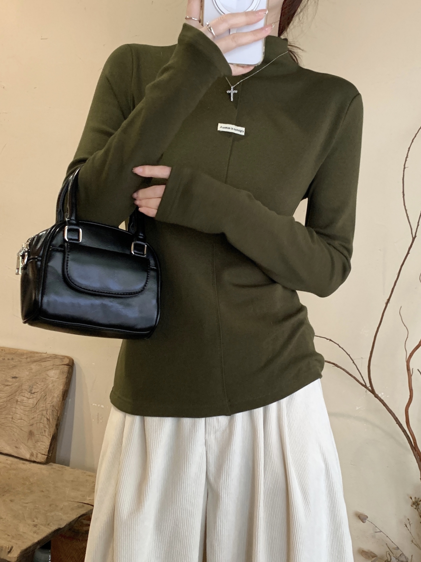 FA51855# 韩系半高领贴牌小标长袖t恤女冬季新款磨毛薄绒休闲百搭打底上衣 服裝批發女裝批發服飾貨源