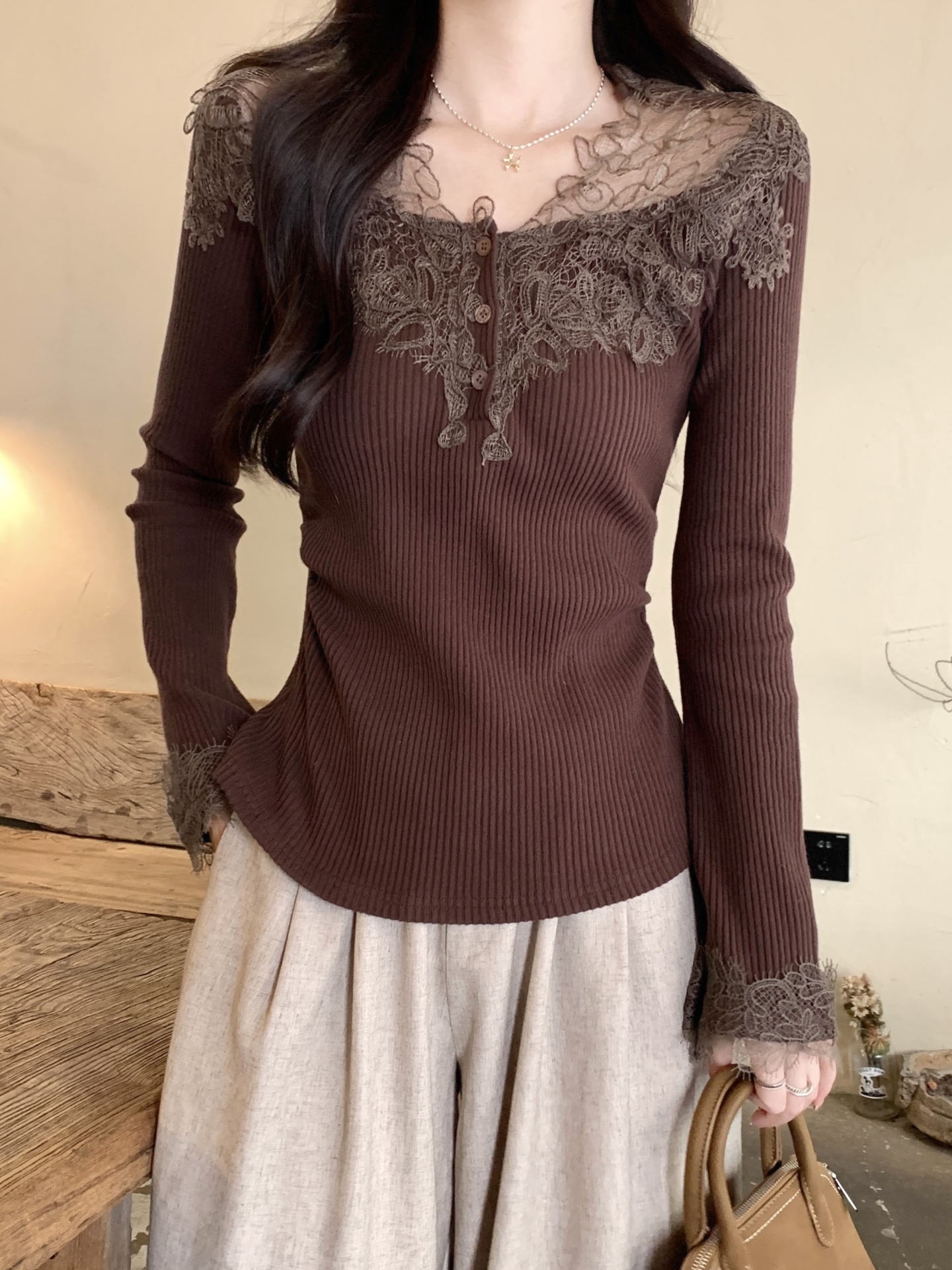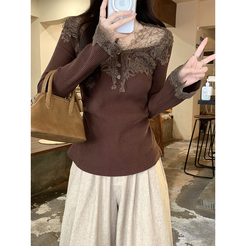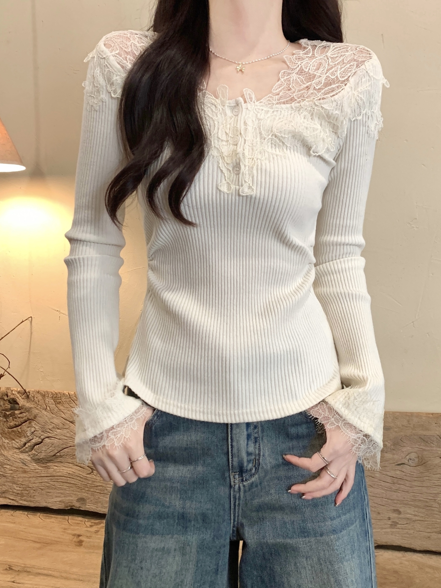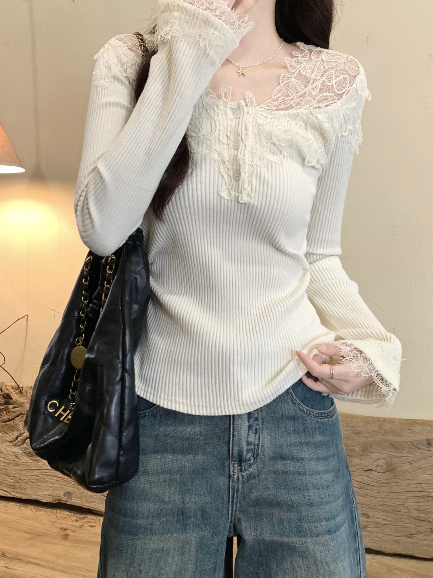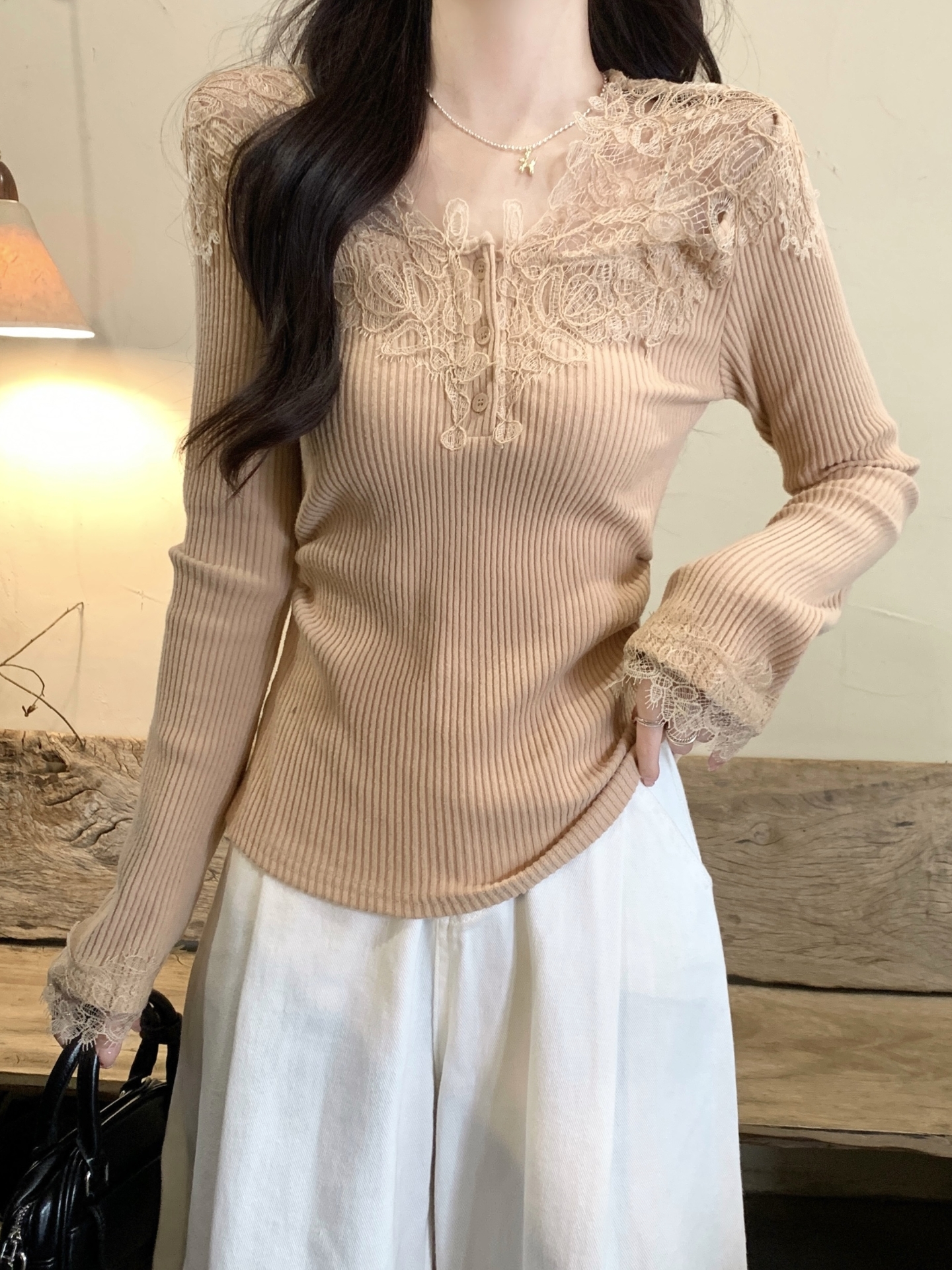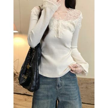 FA51863# 蕾丝纽扣拼接V领长袖t恤女冬季新款褶皱收腰显瘦温柔风打底衫上衣 服裝批發女裝批發服飾貨源