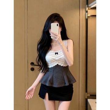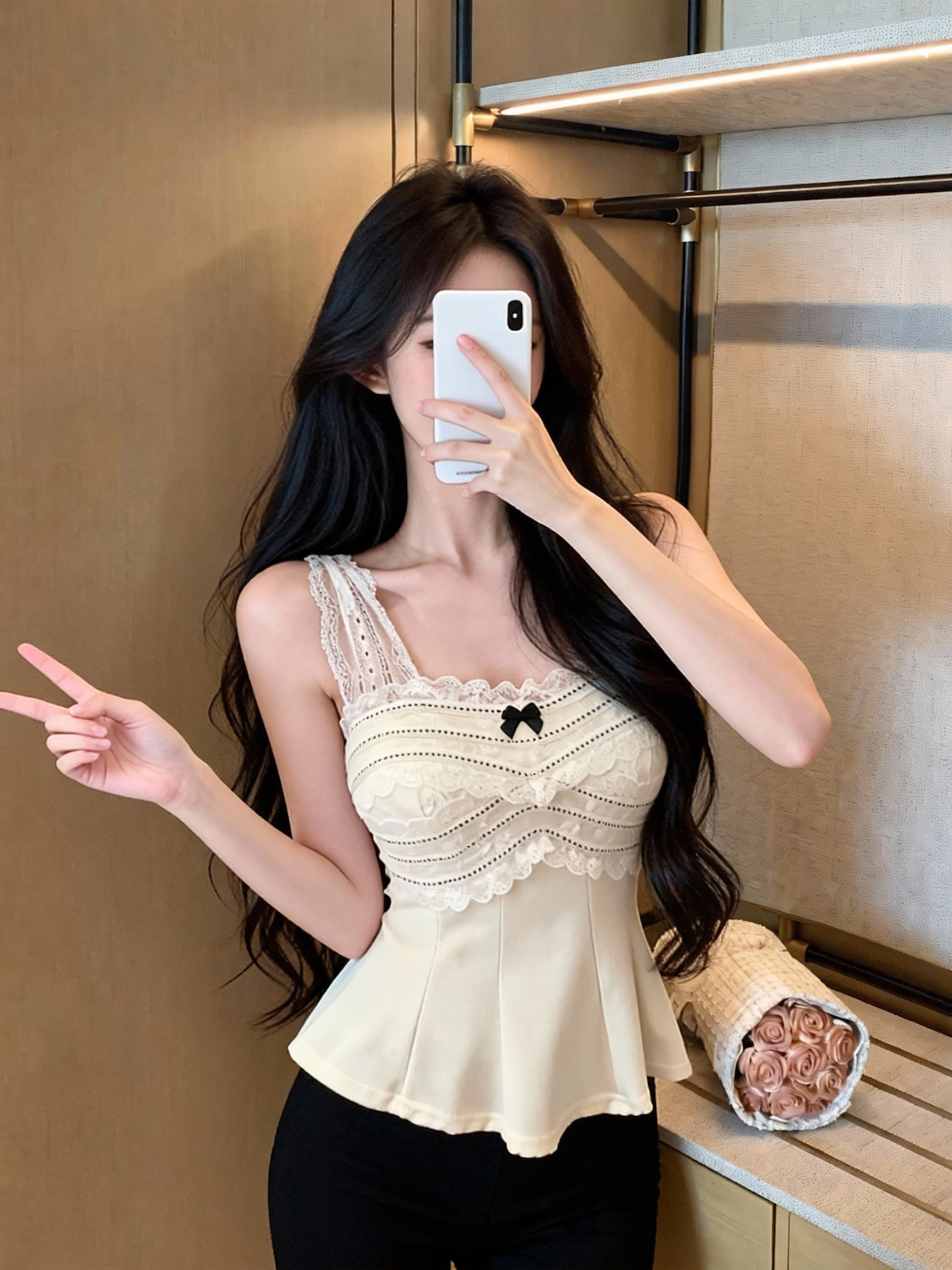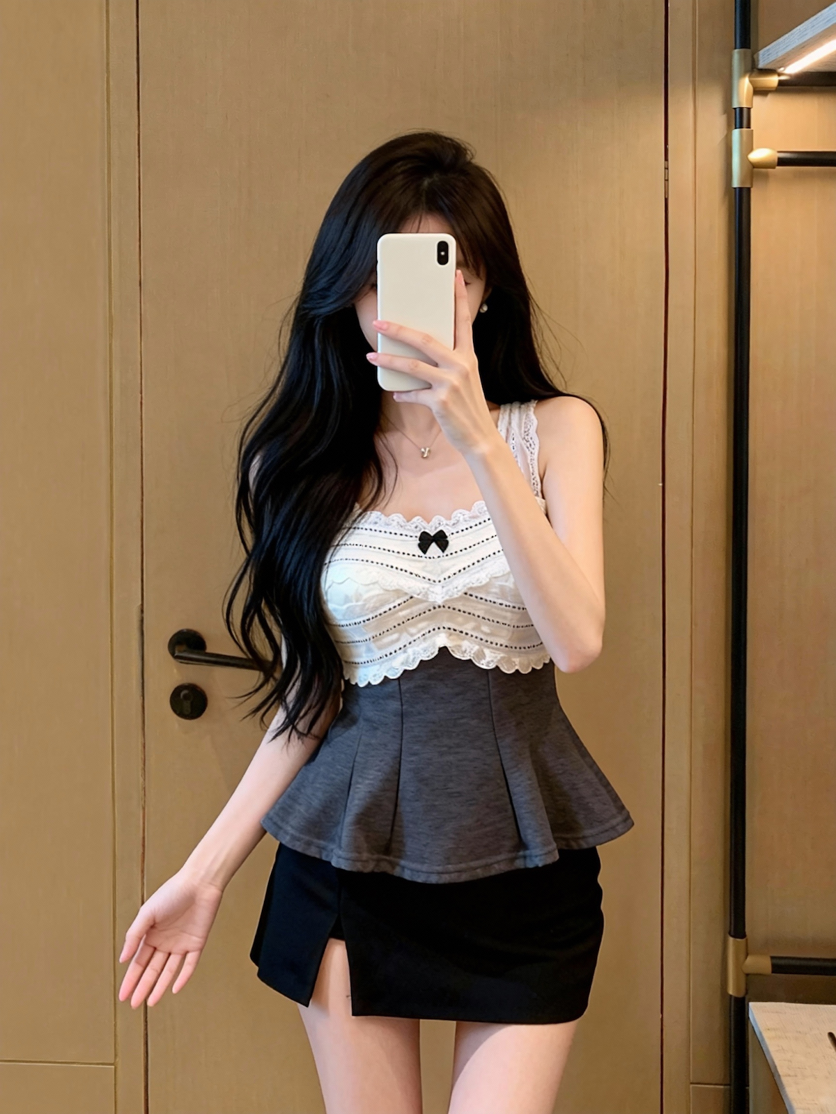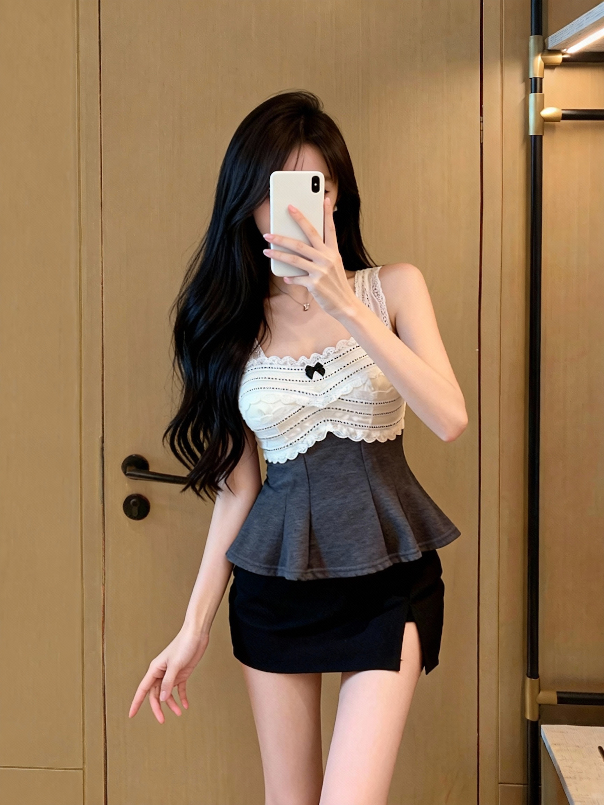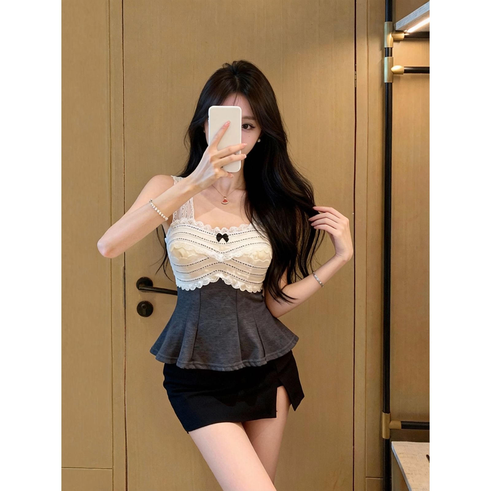 FA51923# 设计感撞色蕾丝拼接吊带女甜美蝴蝶结上衣 服裝批發女裝批發服飾貨源