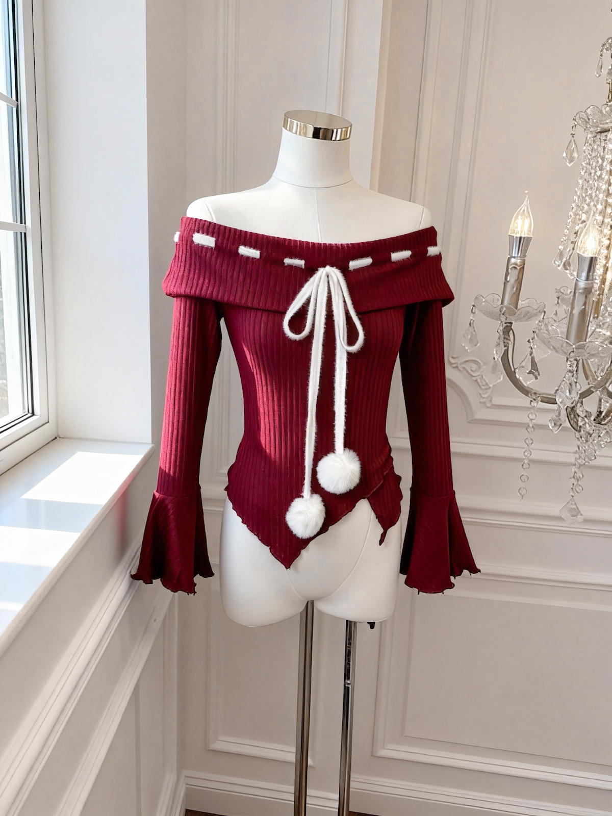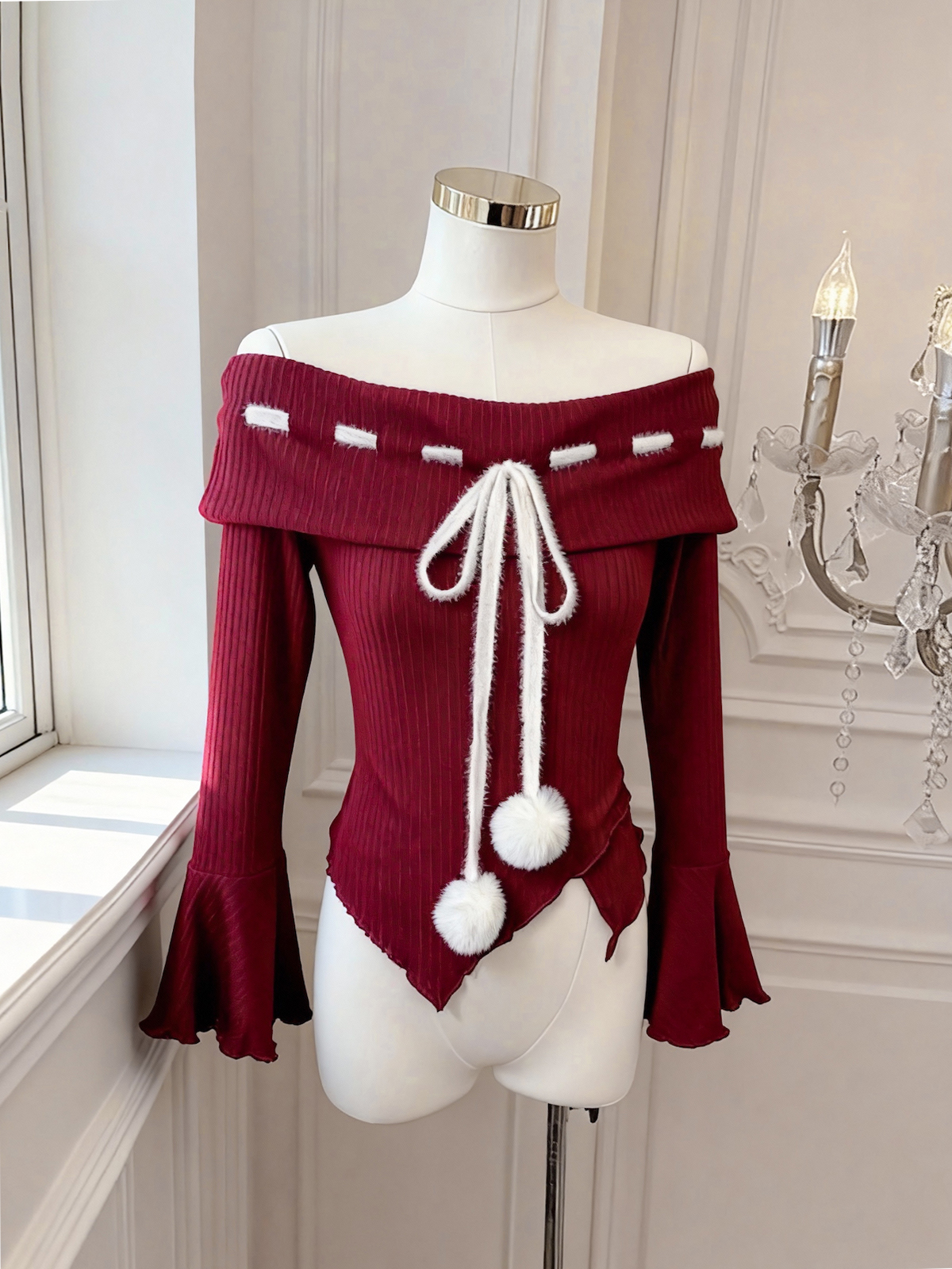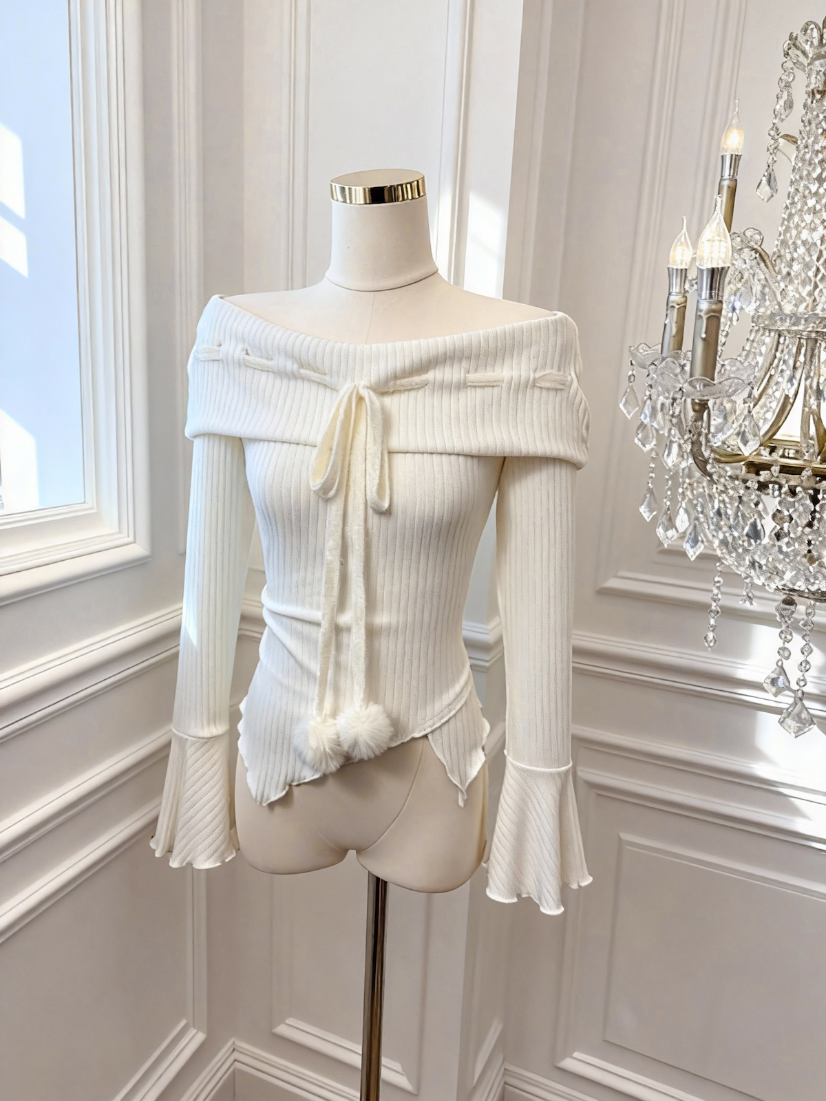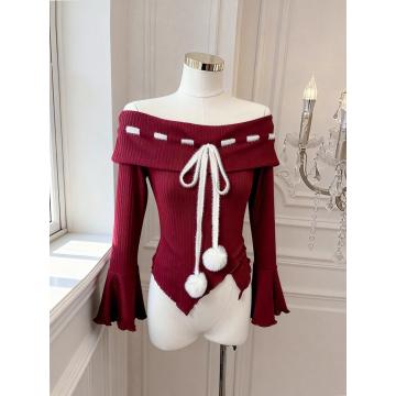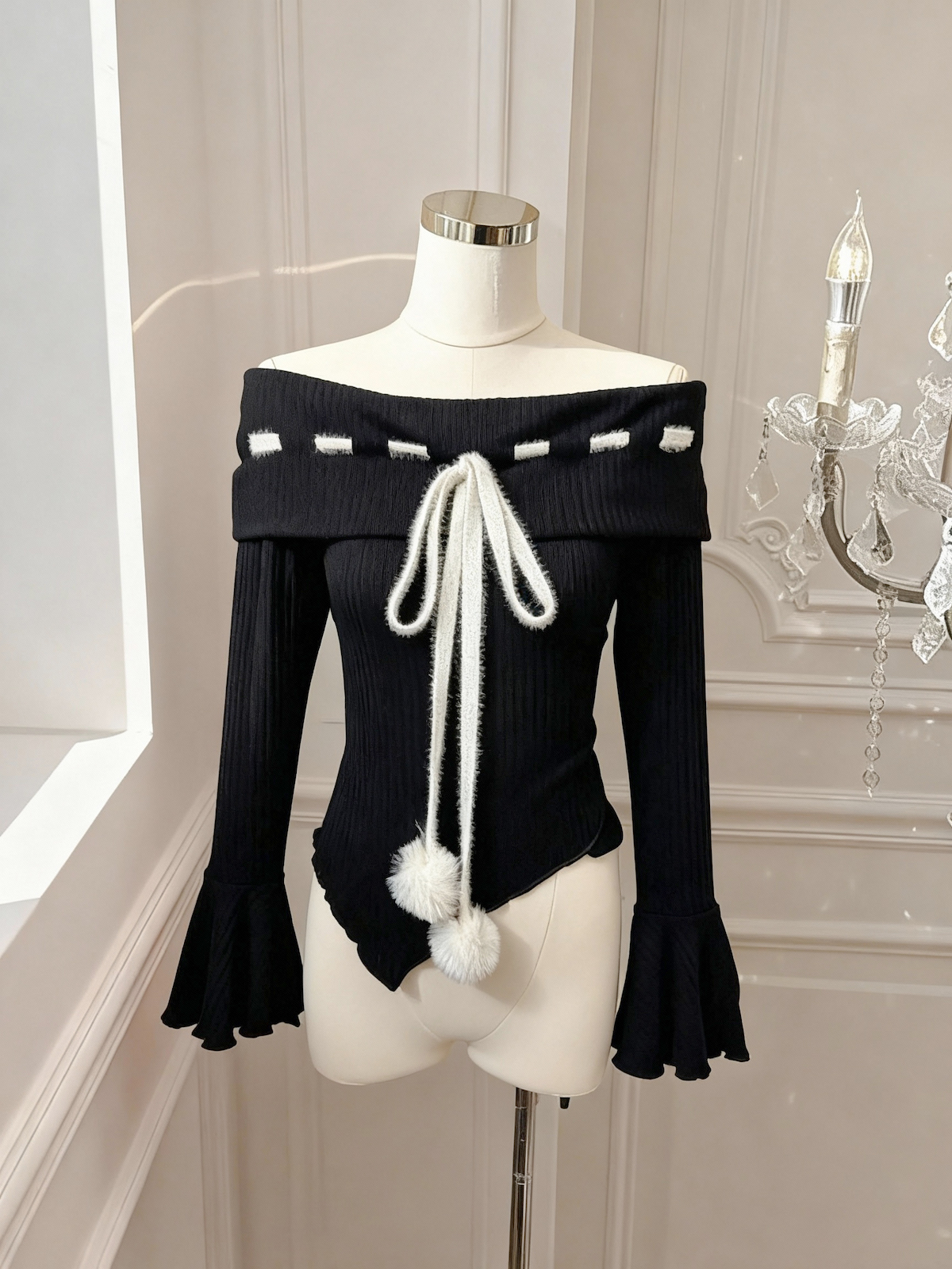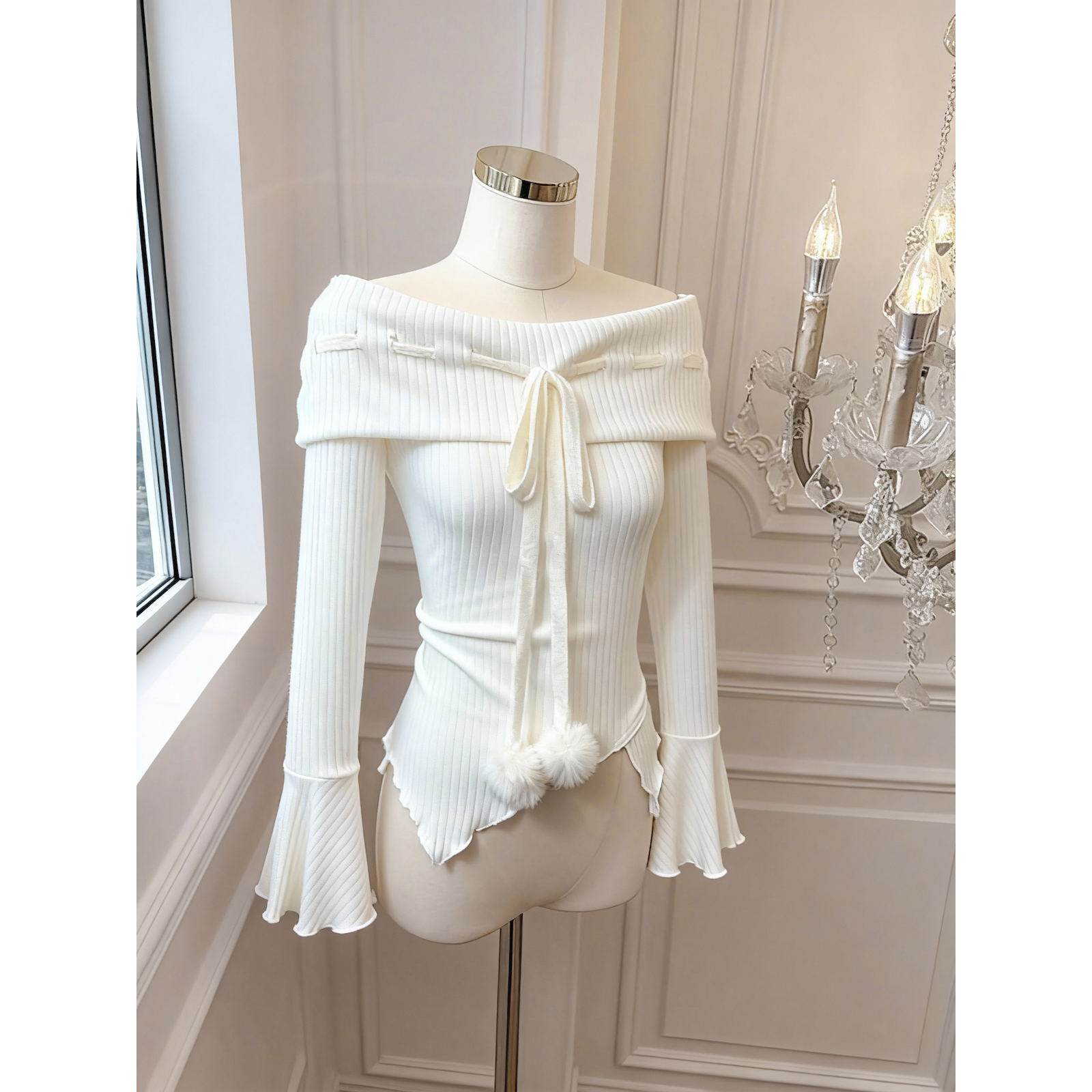 FA51927# 韩系ins纯欲风洋气修身不规则一字肩长袖针织T恤衫女 服裝批發女裝批發服飾貨源