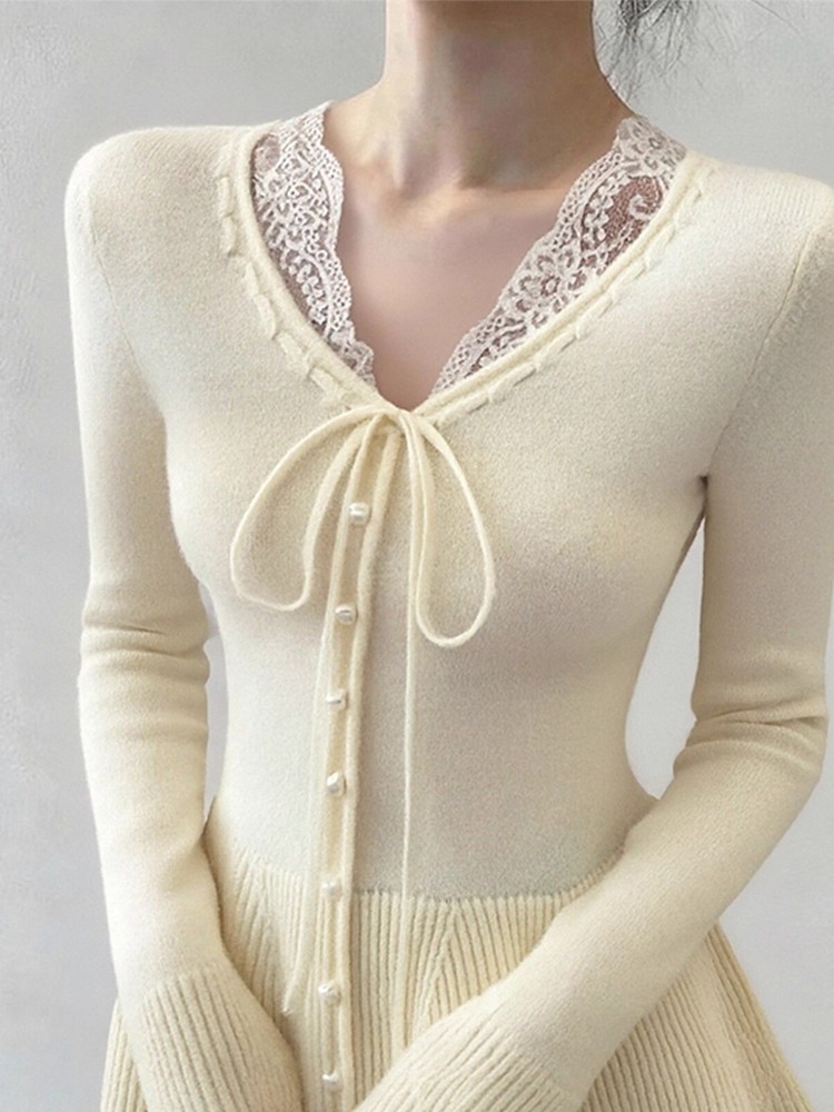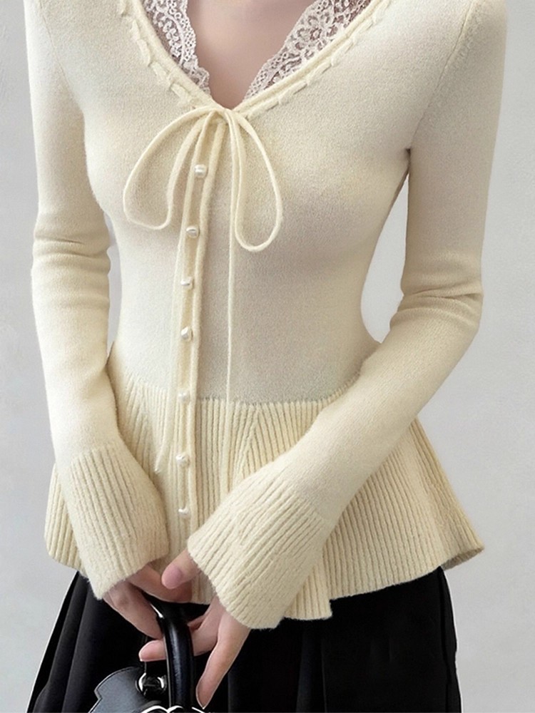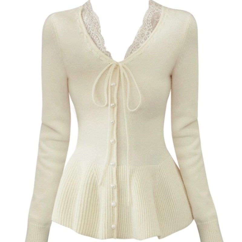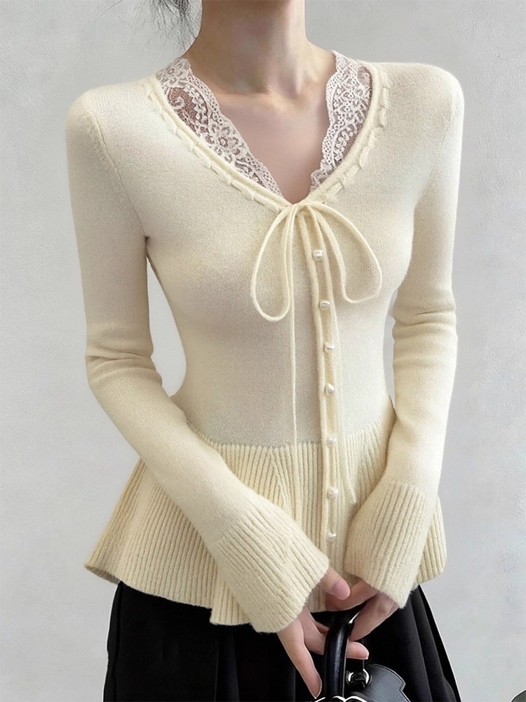 FA51965# 杏色蕾丝边v领系带短款针织衫女冬季穿搭假两件毛衣内搭打底上衣 服裝批發女裝批發服飾貨源
