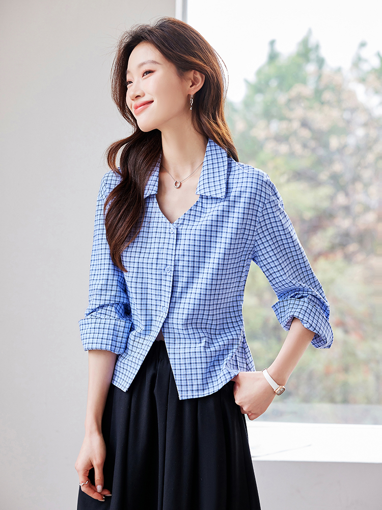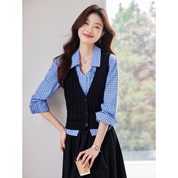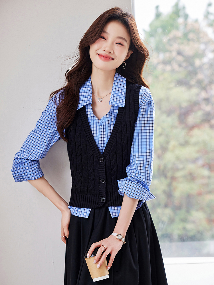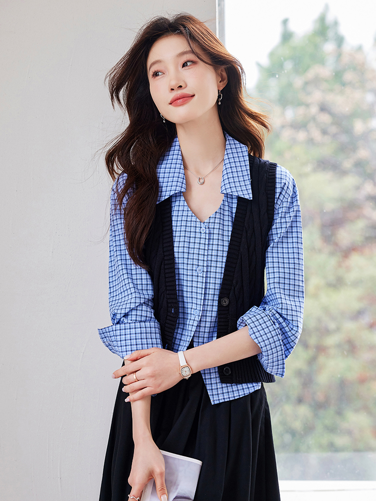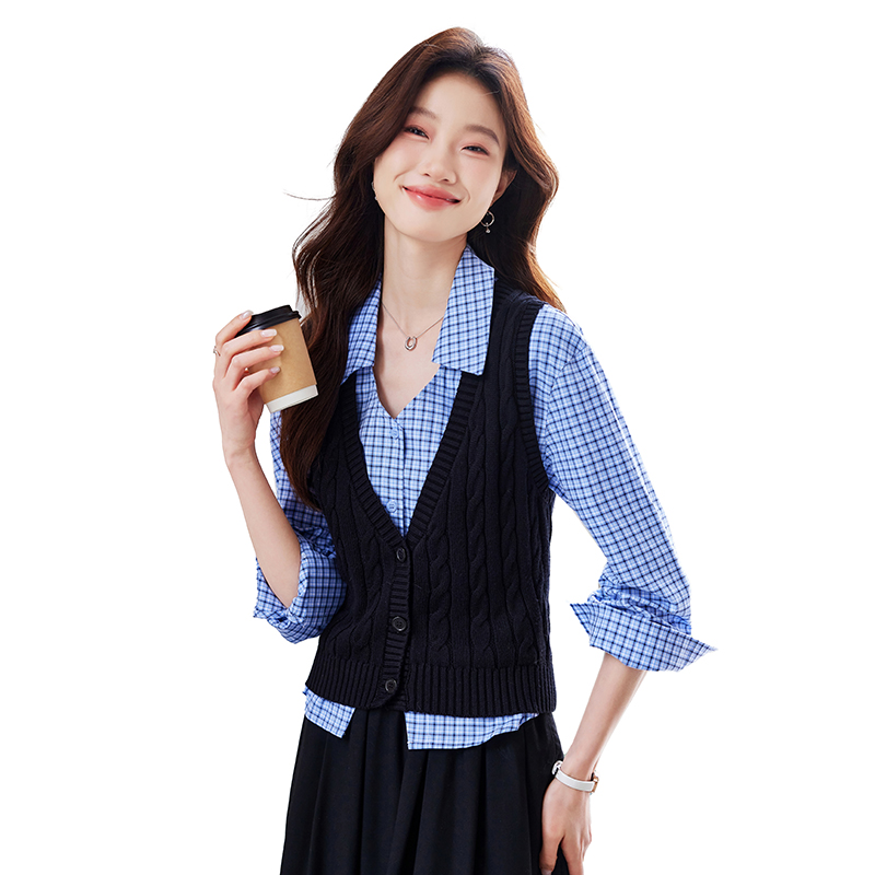 FA51983# 蓝色格子衬衫女春季新款设计感通勤V领衬衣+马甲 服裝批發女裝批發服飾貨源