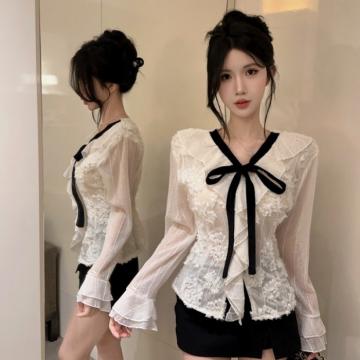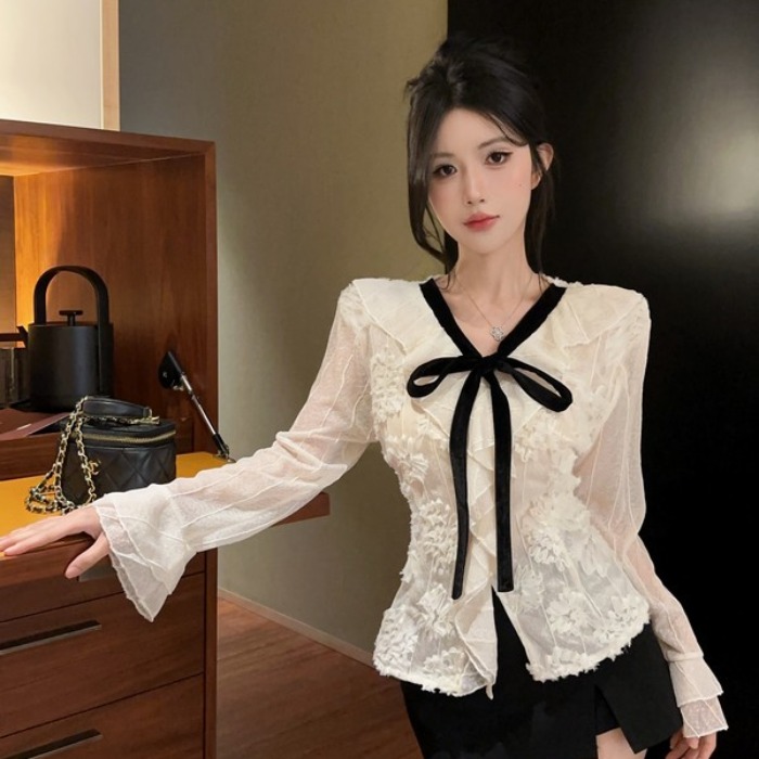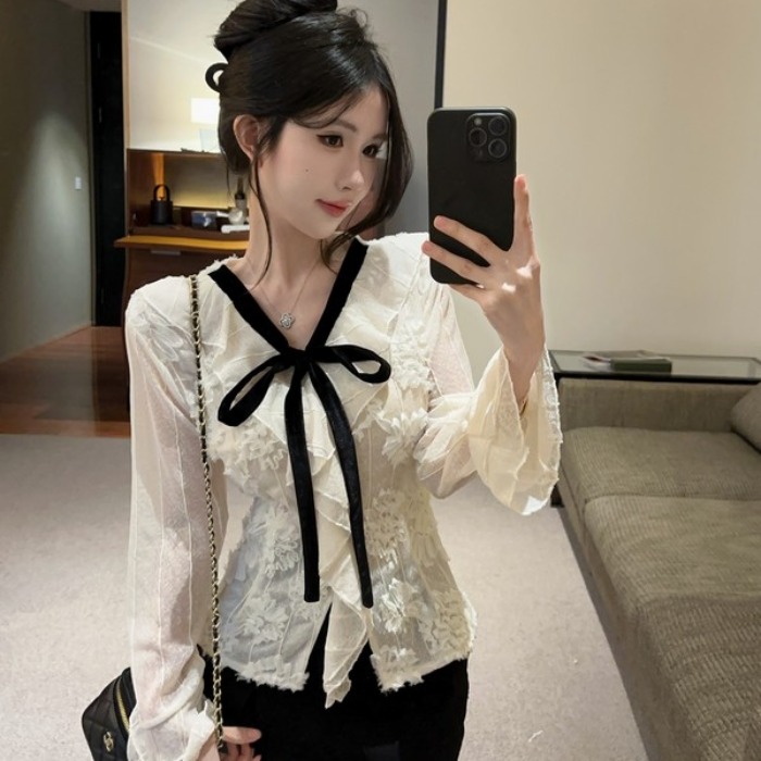 FA51997# 法式花朵荷叶边系带喇叭袖V领上衣时尚百搭修身显瘦小衫 服裝批發女裝批發服飾貨源