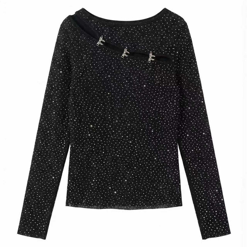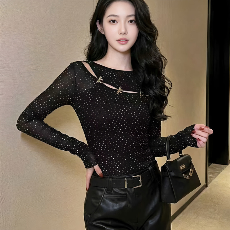 FA52037# 春新款圆领长袖烫钻拼接t恤女修身打底衫潮 服裝批發女裝批發服飾貨源