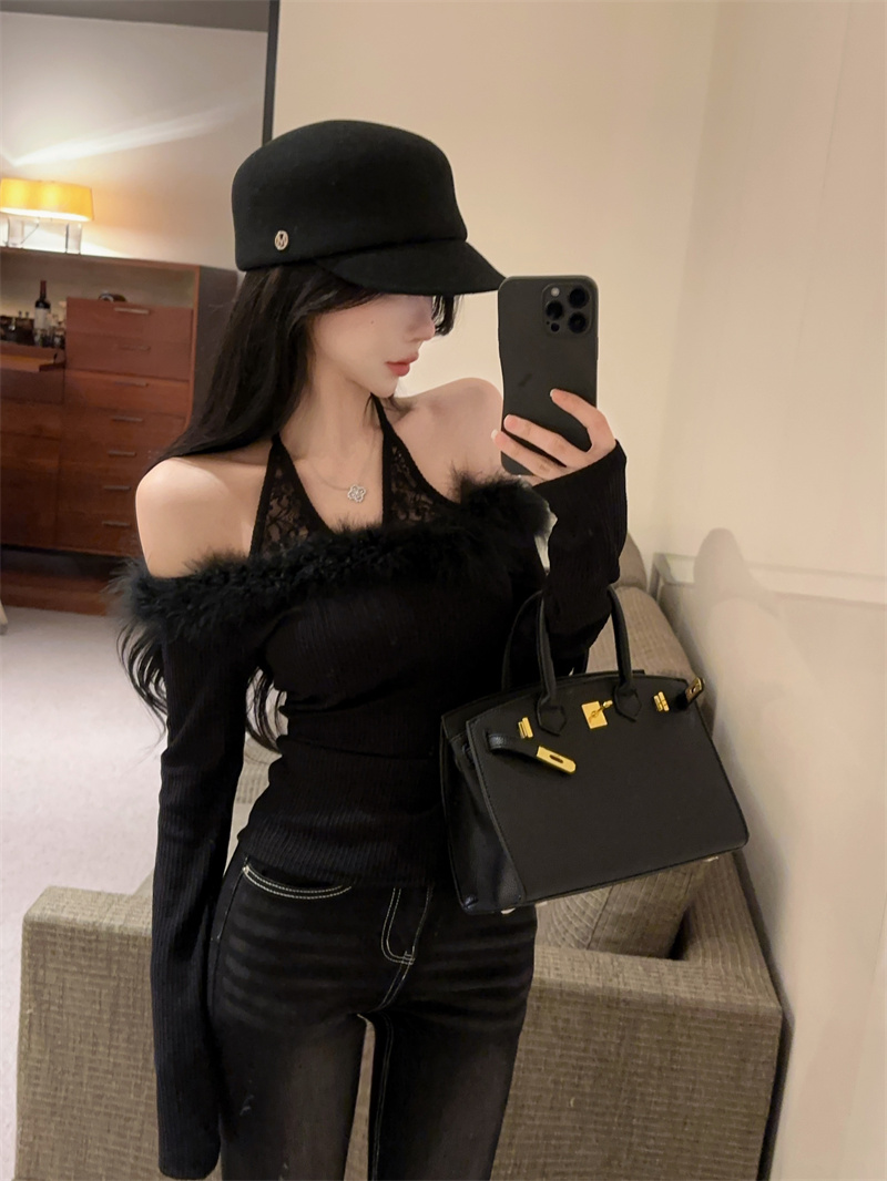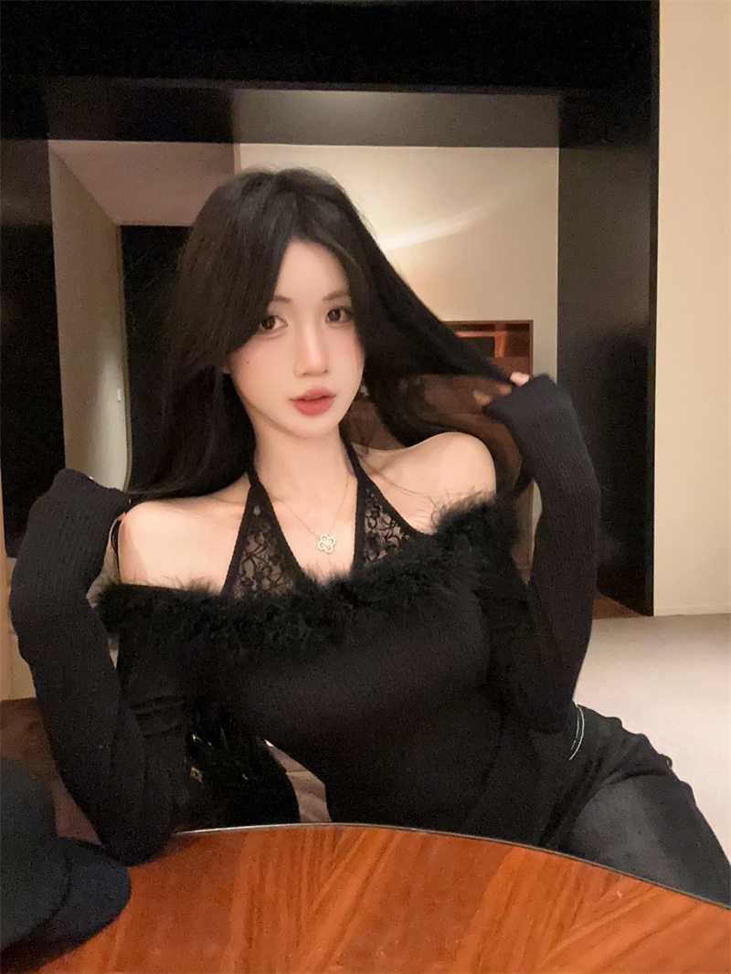 FA52043# 蕾丝拼接针织打底衫修身性感辣妹纯欲一字肩挂脖上衣 服裝批發女裝批發服飾貨源