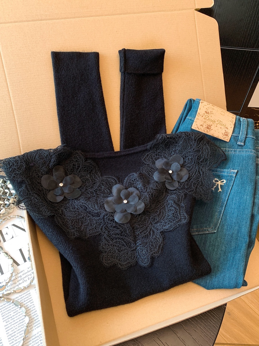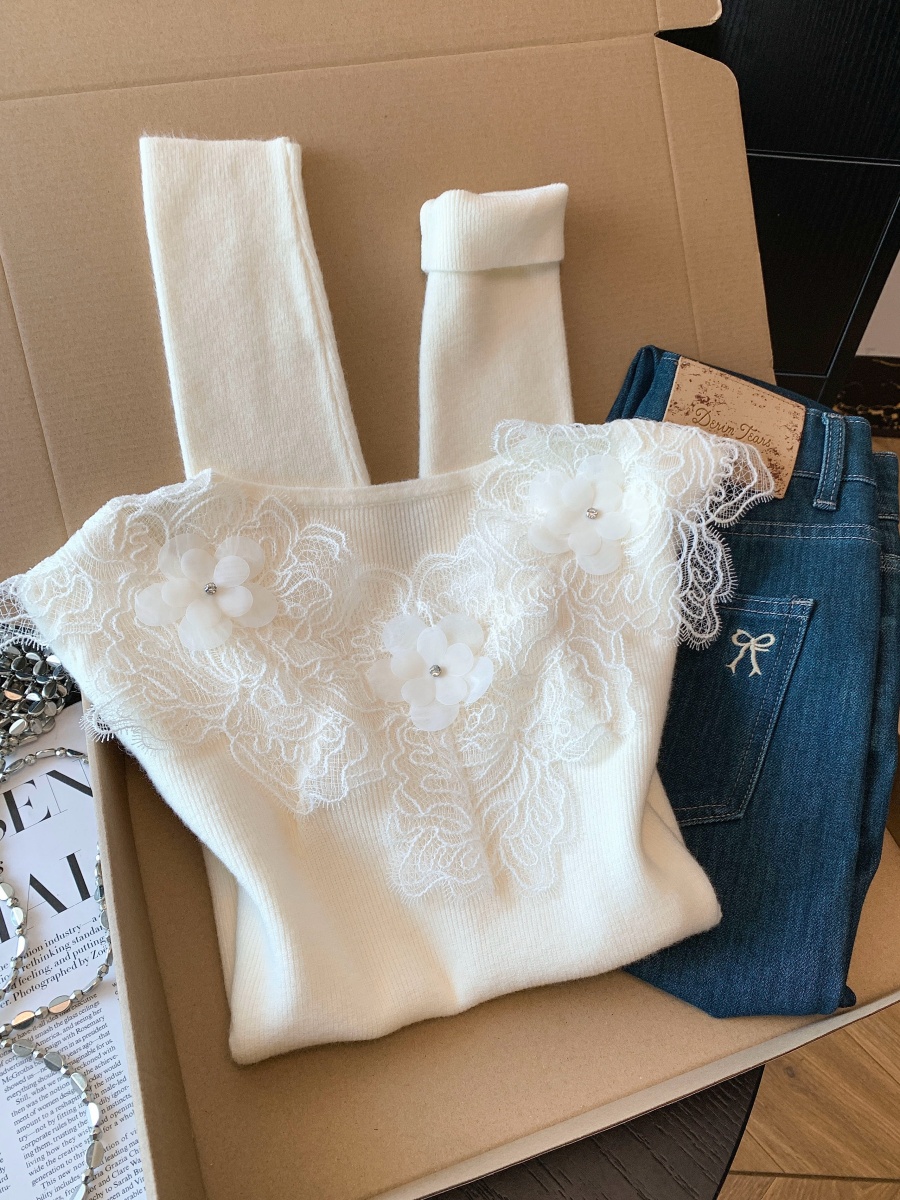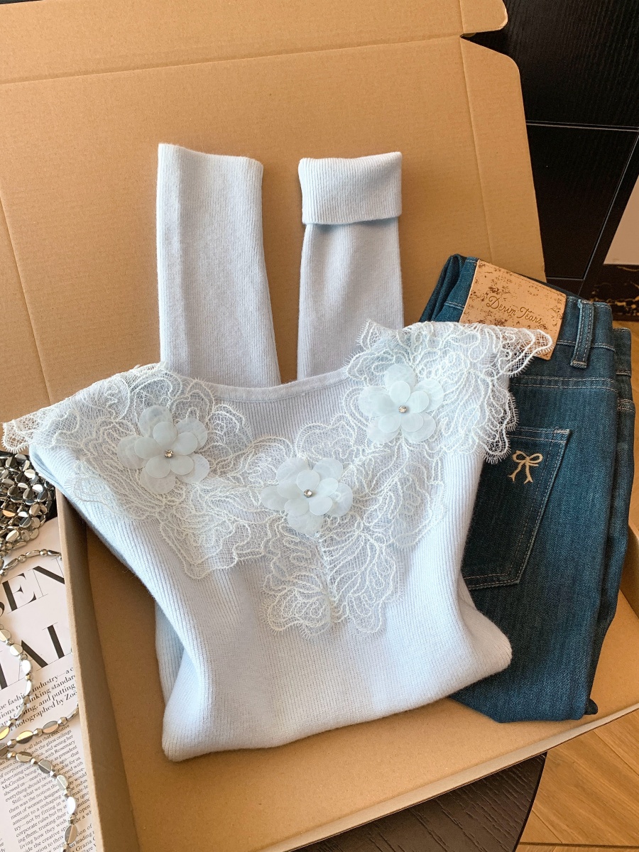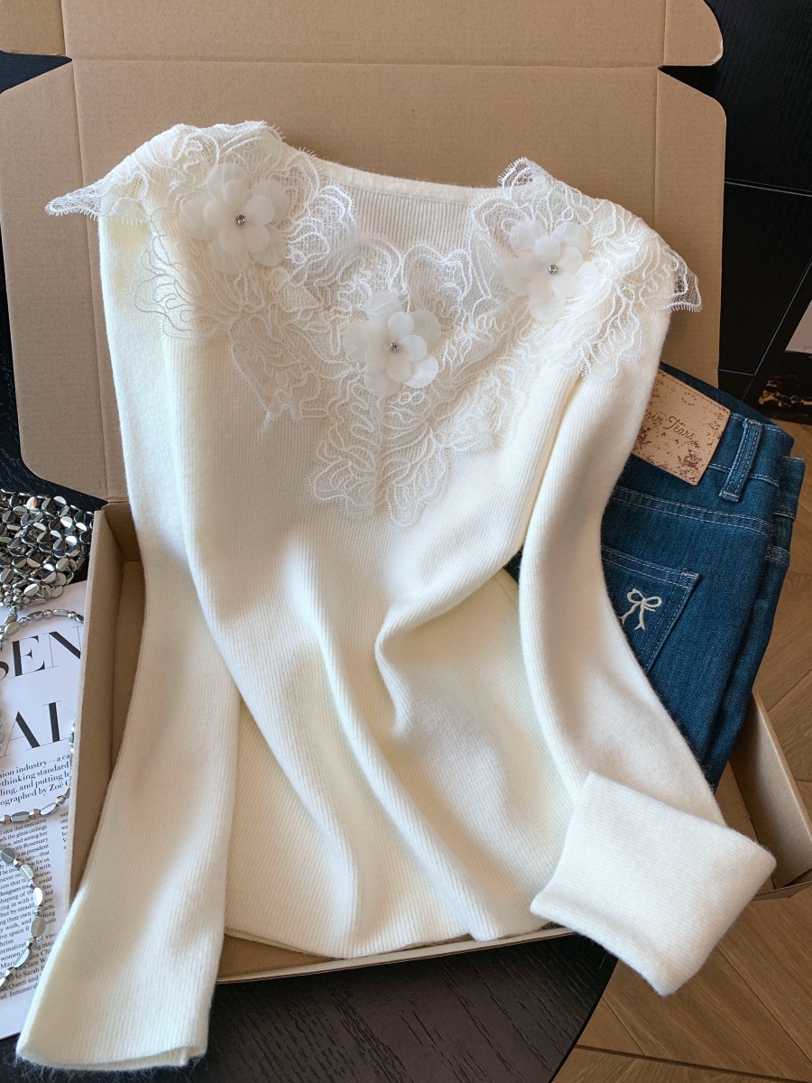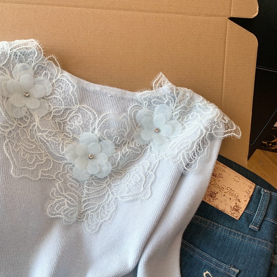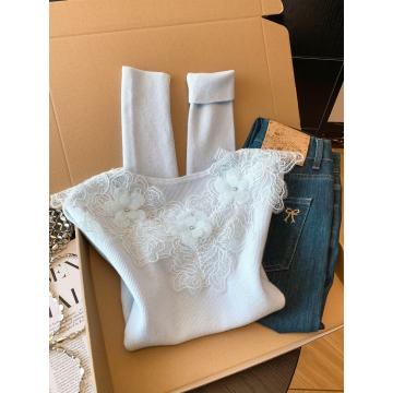 FA52053# 法式纯欲仙气水钻刺绣花朵蕾丝老钱设计内搭打底针织衫毛衣 服裝批發女裝批發服飾貨源