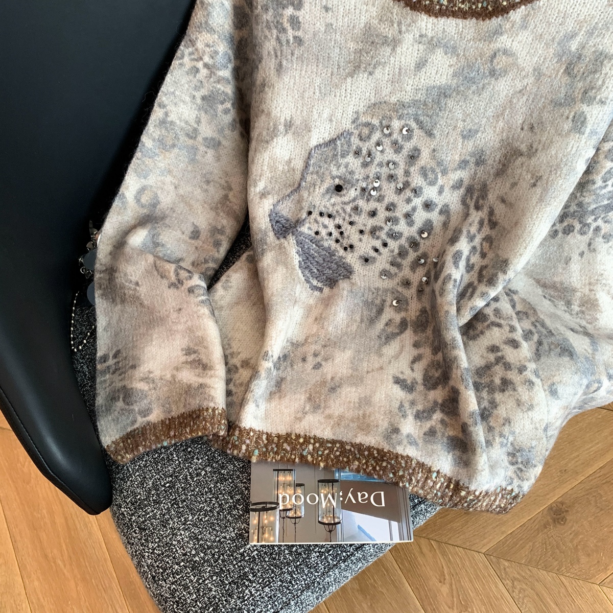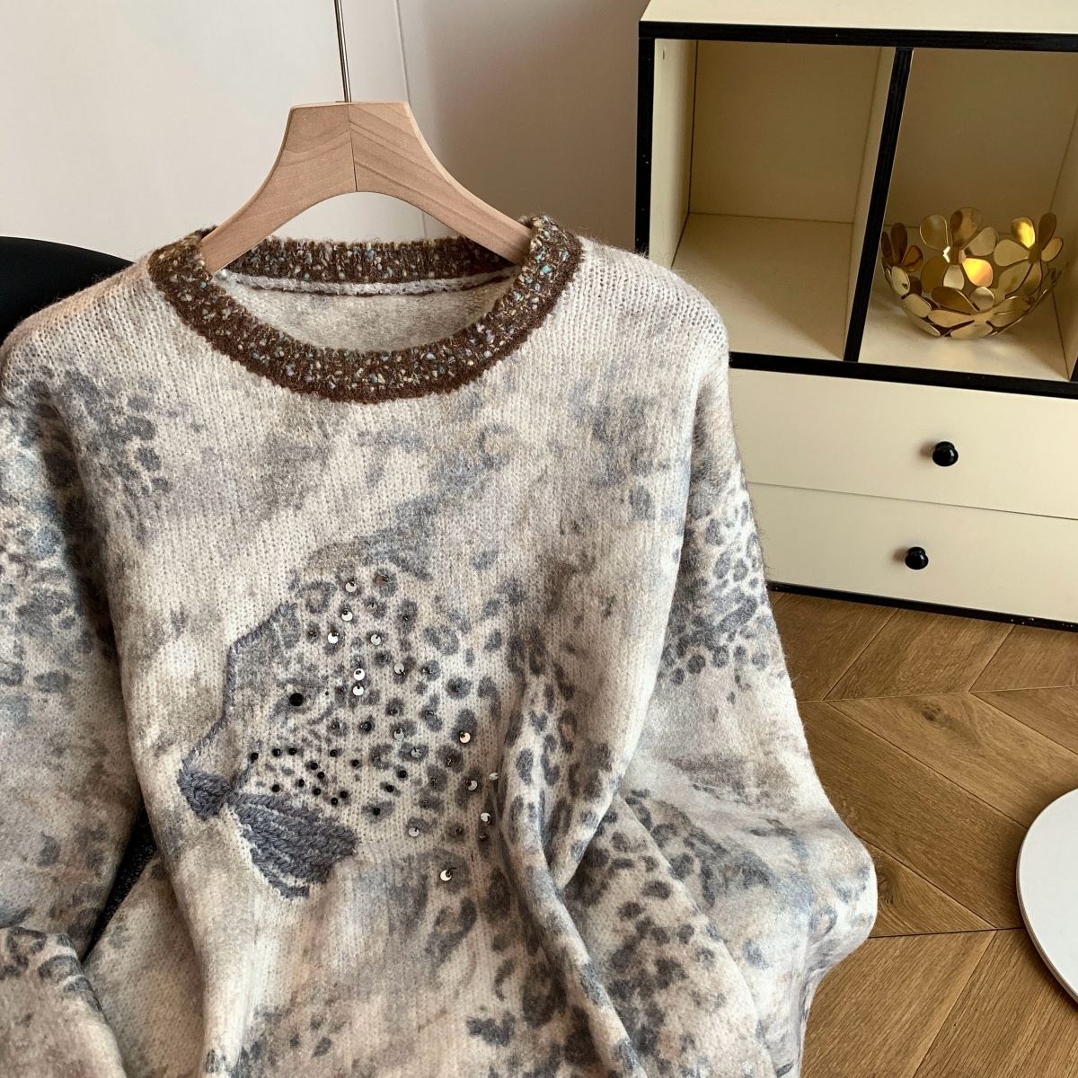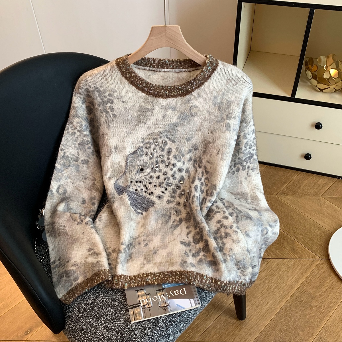 FA52054# 法式氛围感轻奢撞色豹纹毛衣女秋冬重工钉珠亮片针织长袖上衣 服裝批發女裝批發服飾貨源