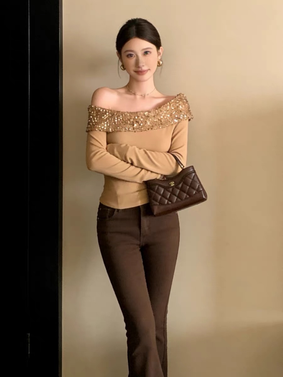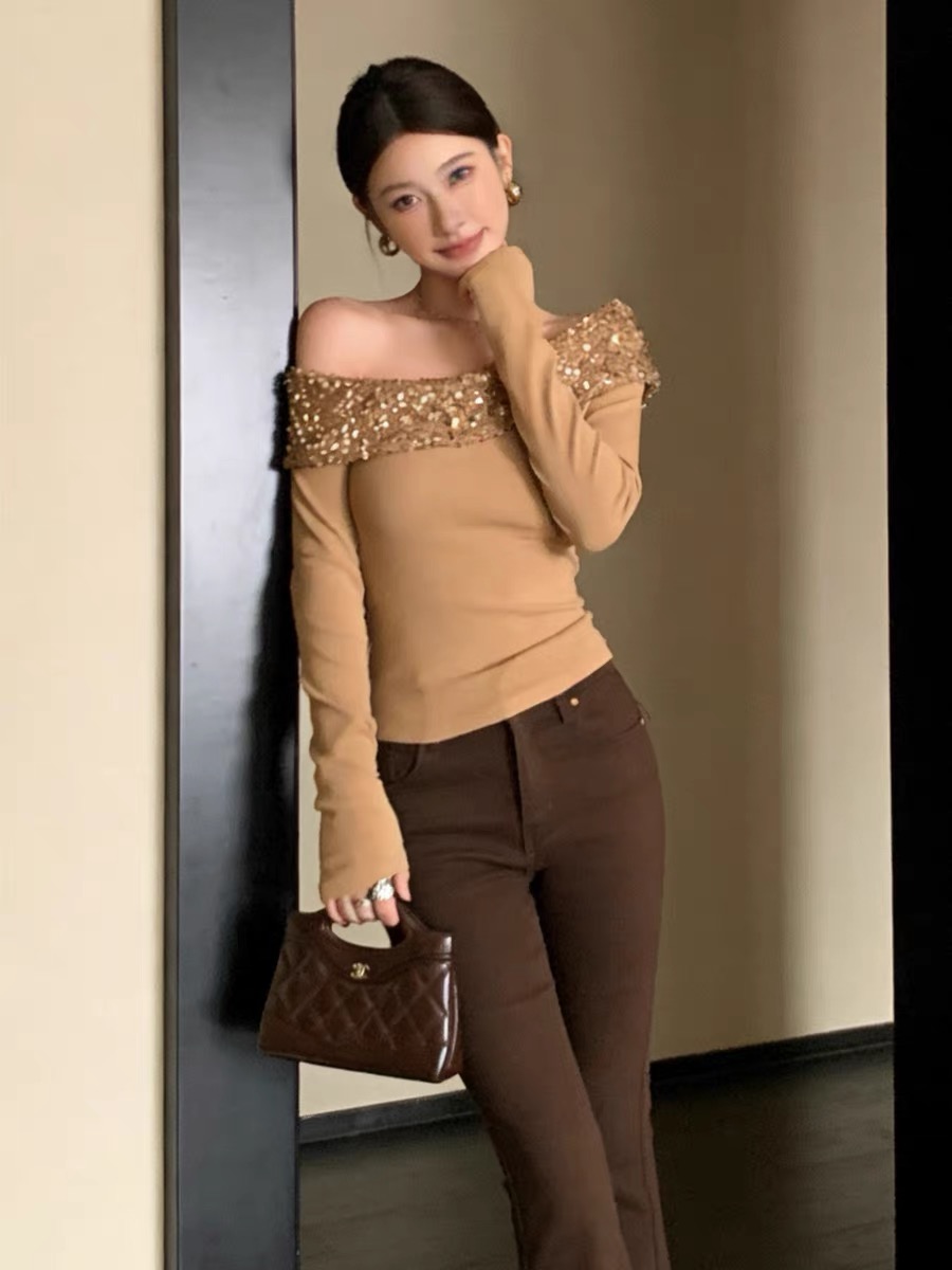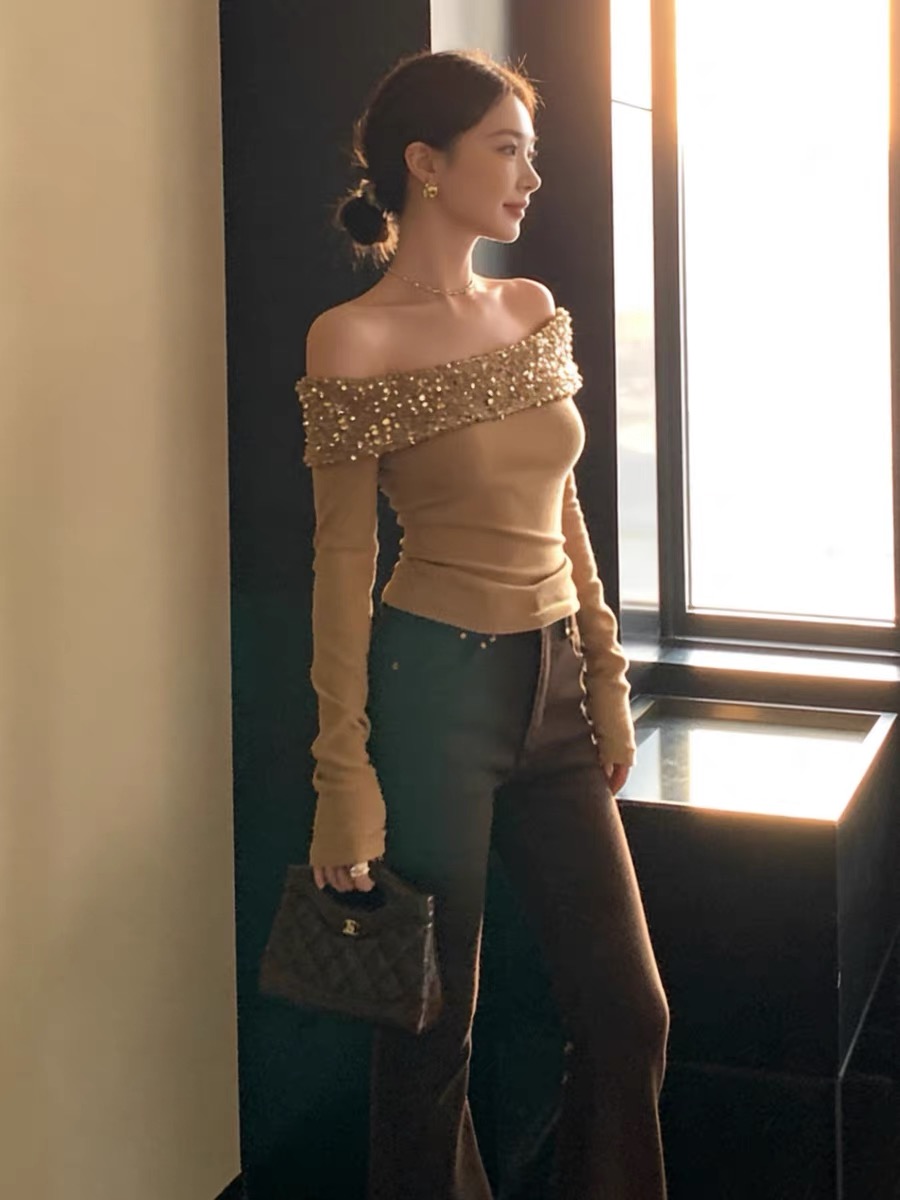 FA52134# 法式高级感亮片一字肩针织上衣女秋冬新款内搭打底衫设计感小众 服裝批發女裝批發服飾貨源