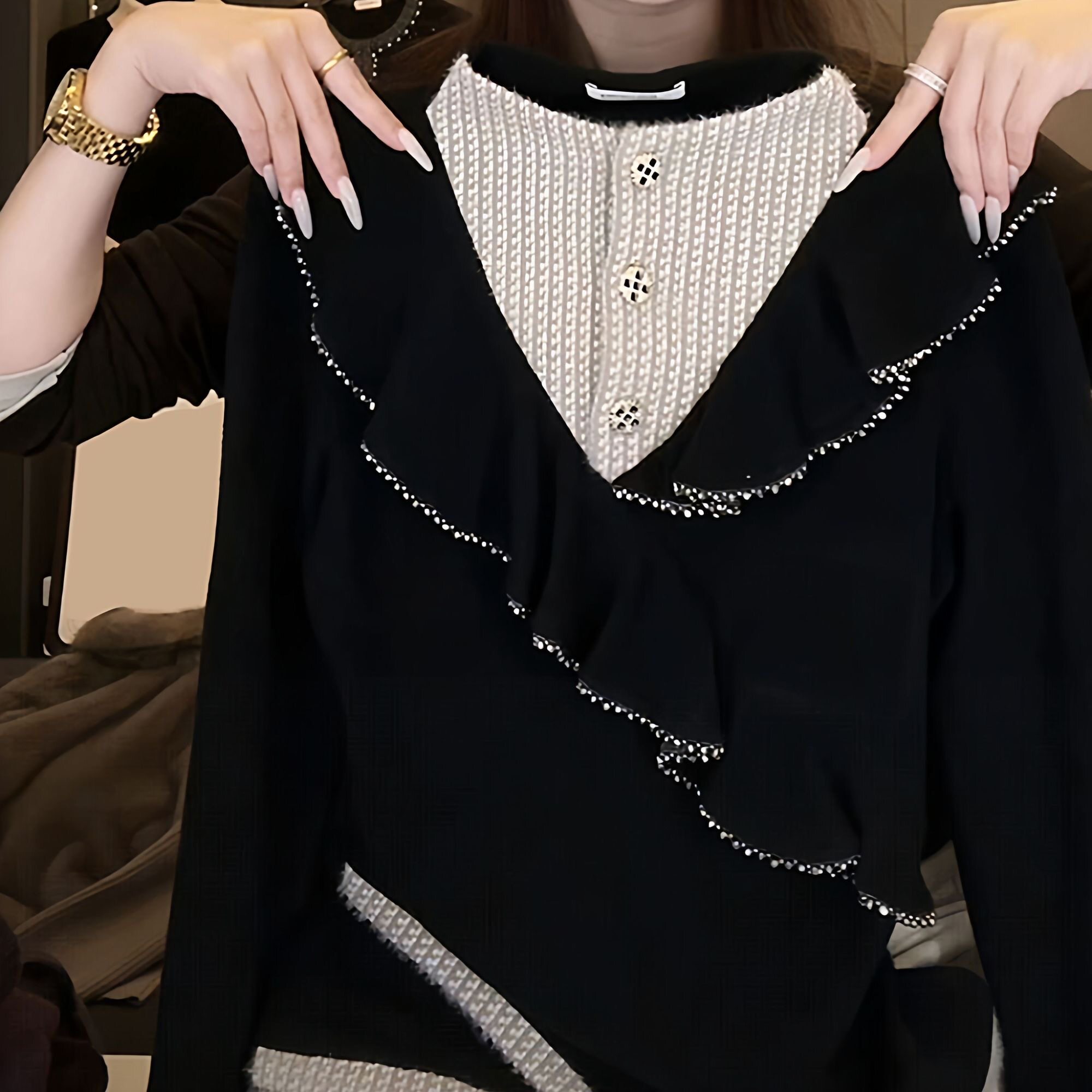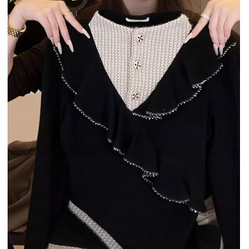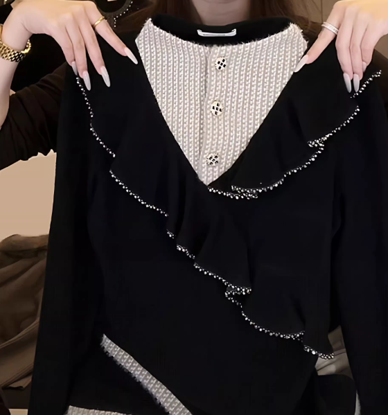 LN76412# 设计感荷叶边假两件半高领长袖T恤女秋冬新款女显瘦百搭打底上衣