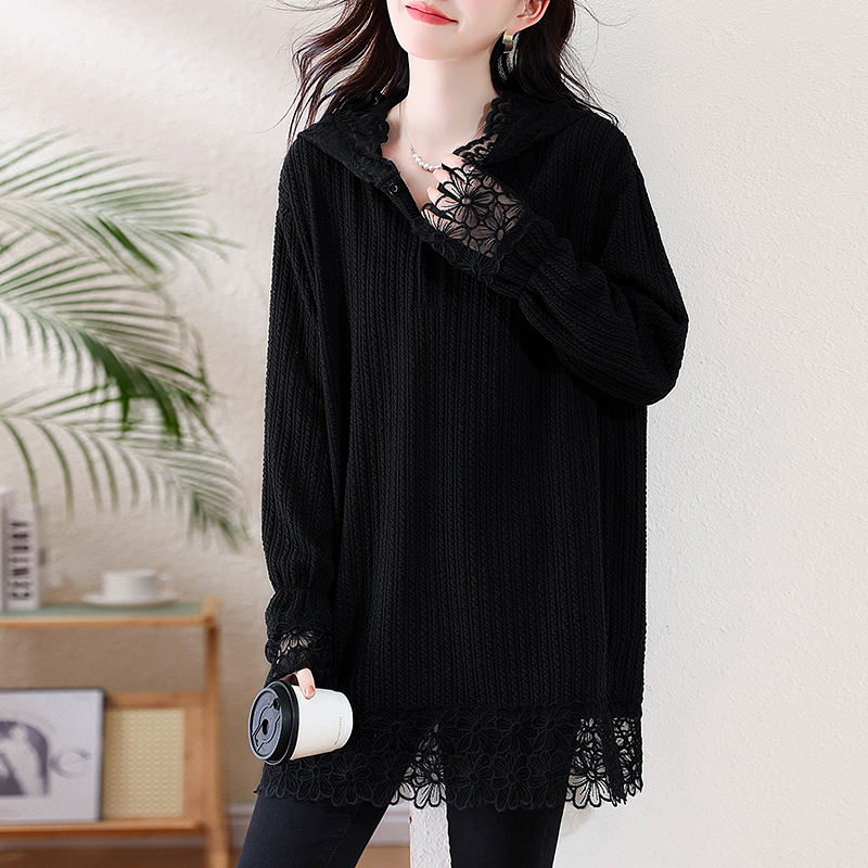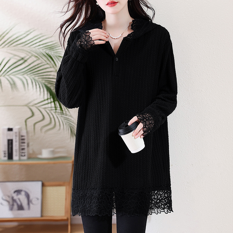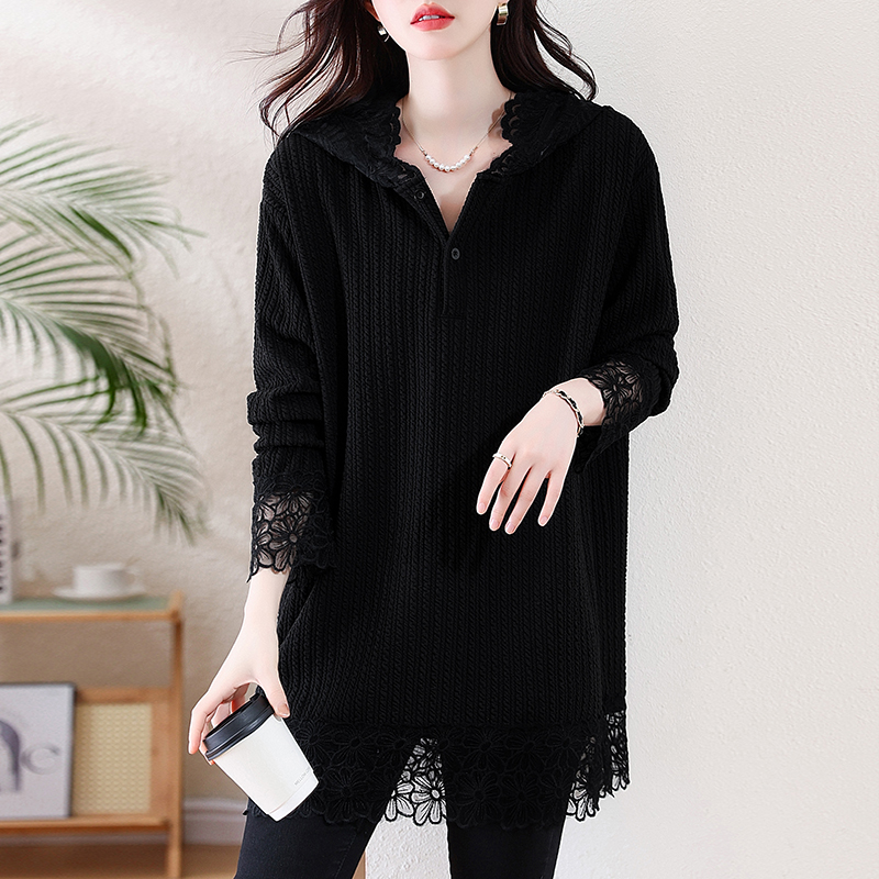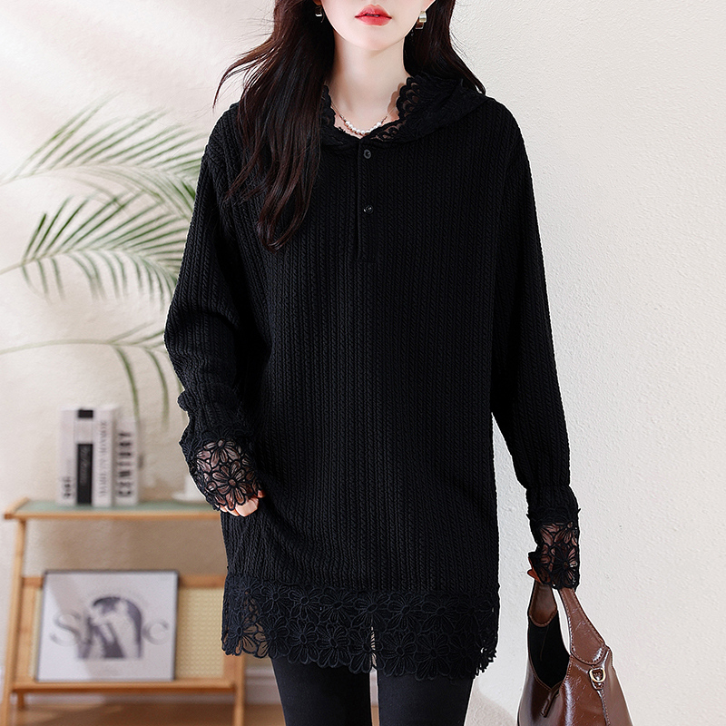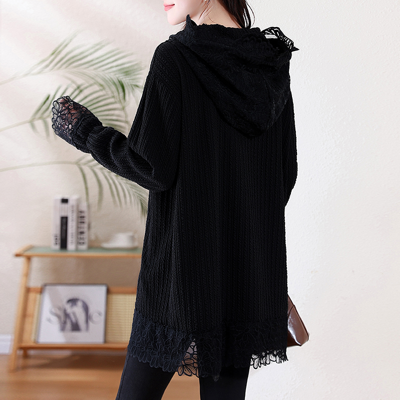 FA52332# 秋冬新款韩版刺绣蕾丝钩花拼接连帽中长款大码宽松上衣女 服裝批發女裝批發服飾貨源