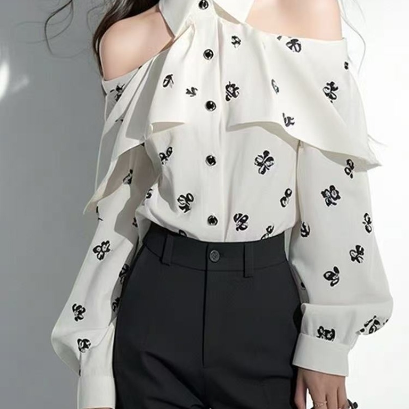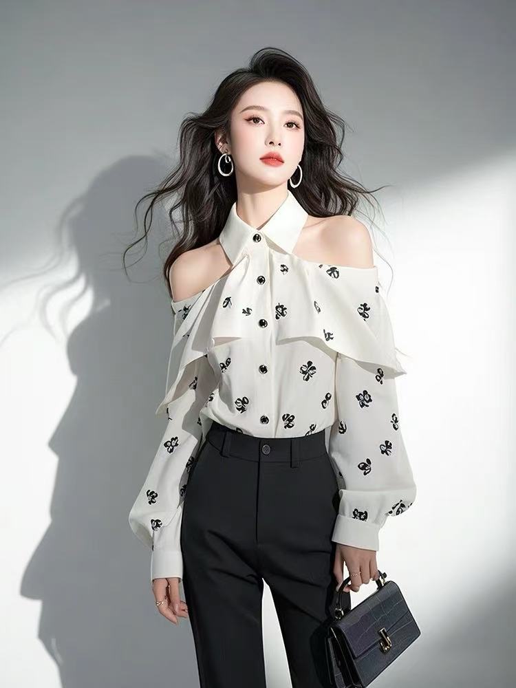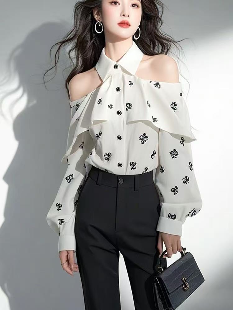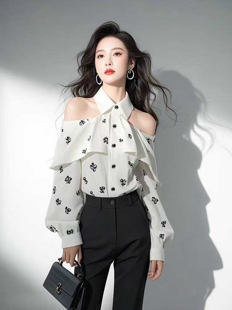 FA52406# 白色印花雪纺衬衫女款春季超火独特漂亮小众设计感荷叶边衬衣 服裝批發女裝批發服飾貨源
