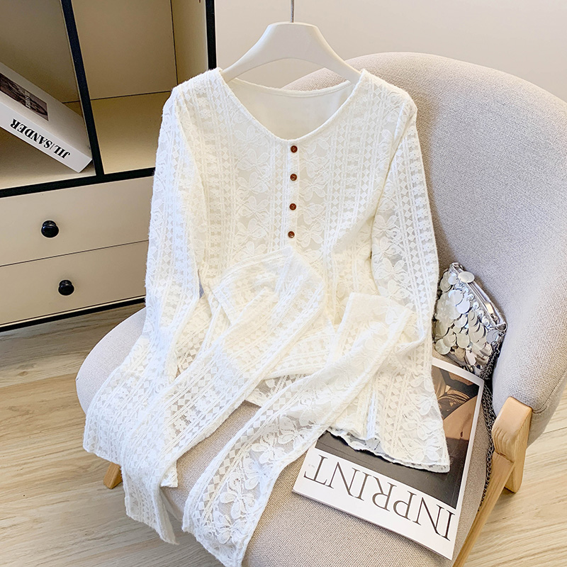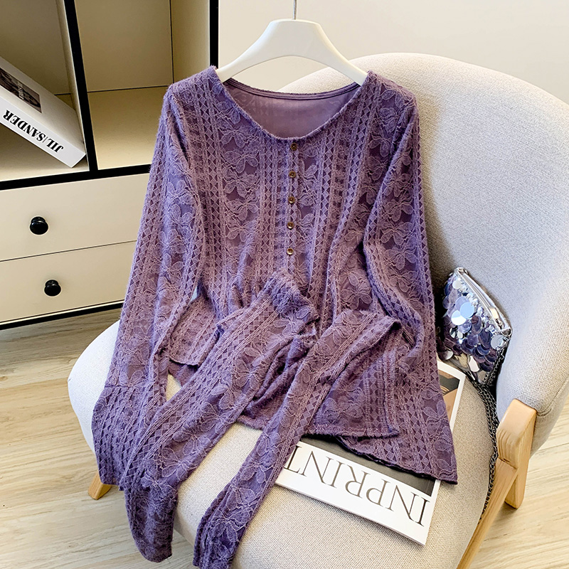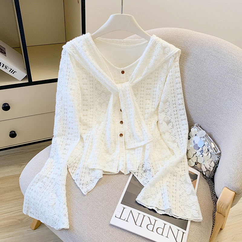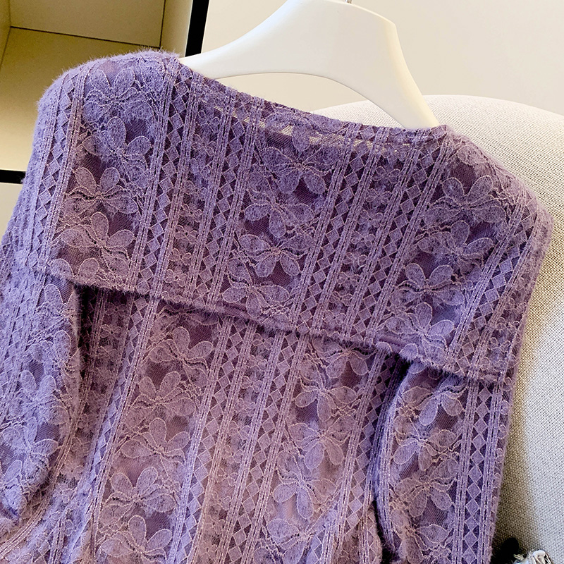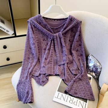 FA52444# 秋冬法式紫色温柔风气质披肩v领长袖蕾丝衬衫新款喇叭袖上衣